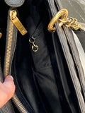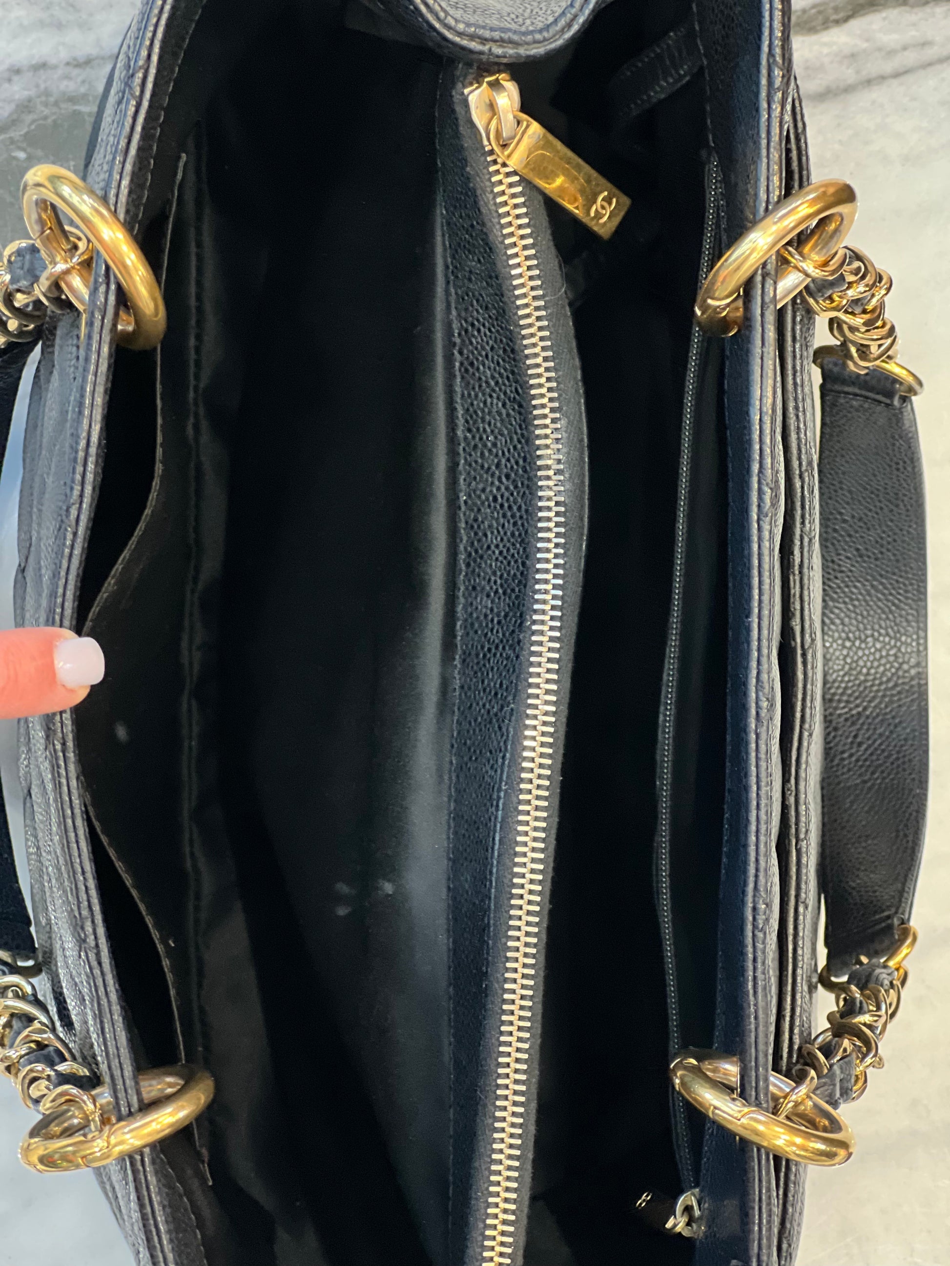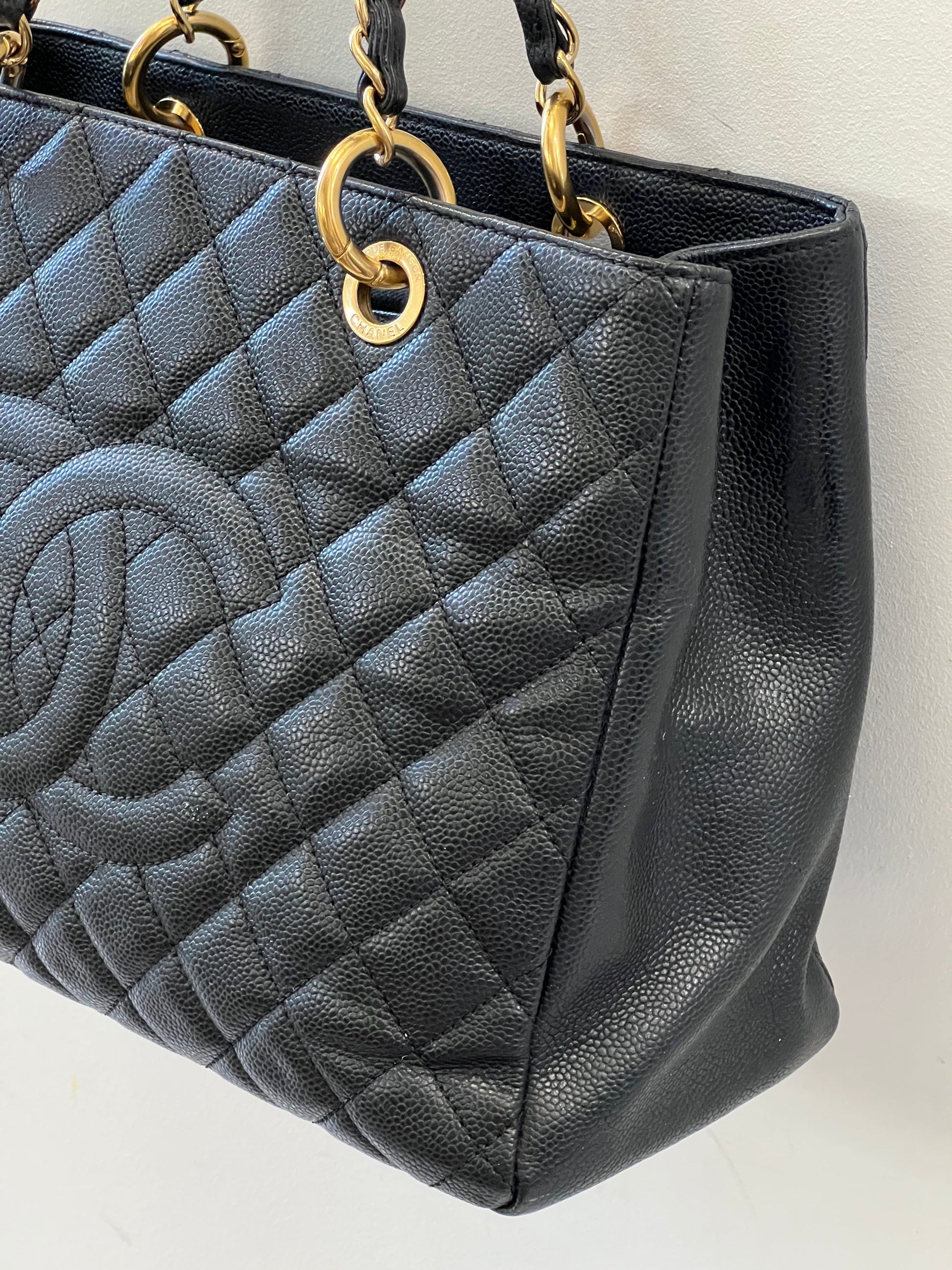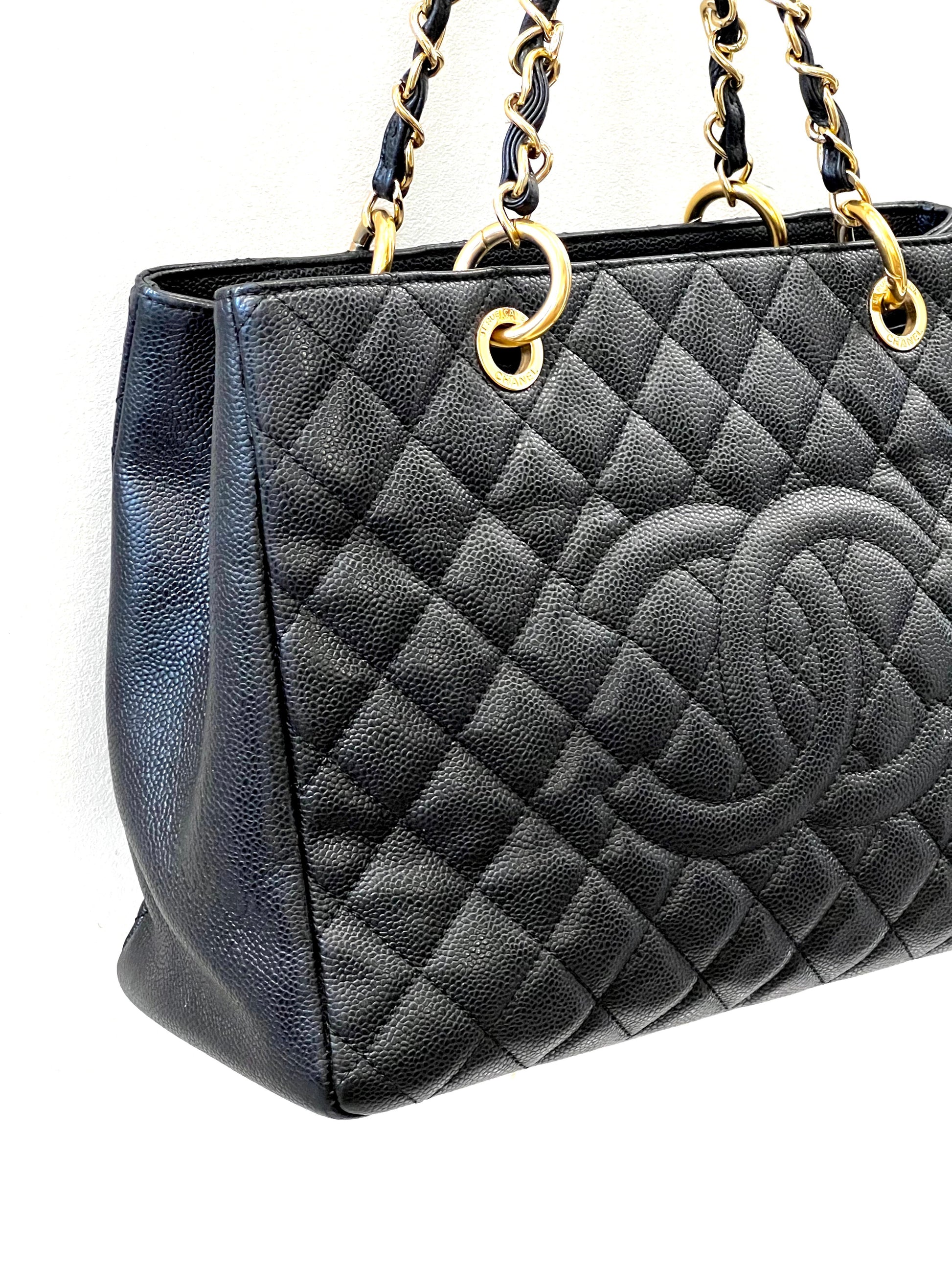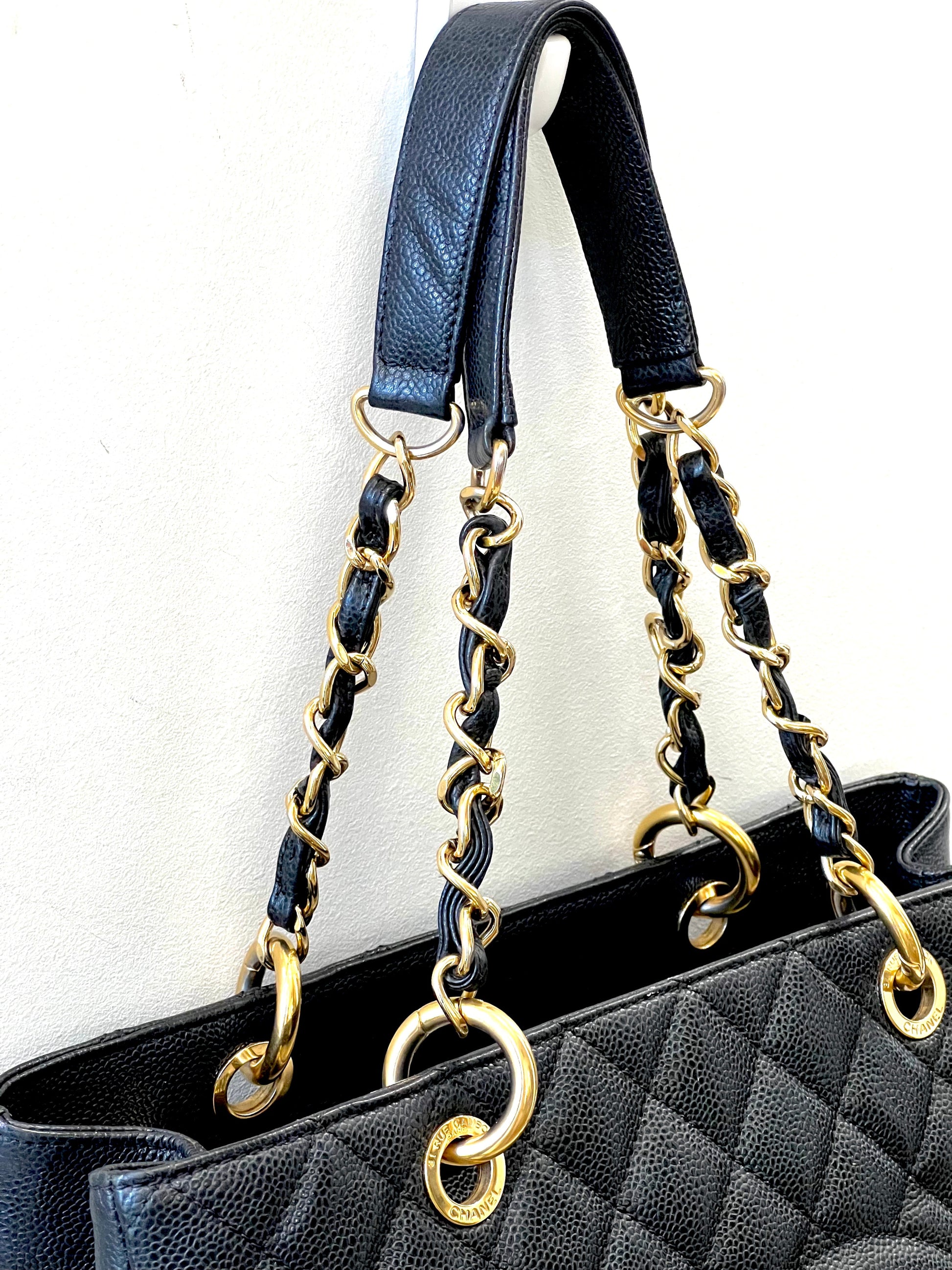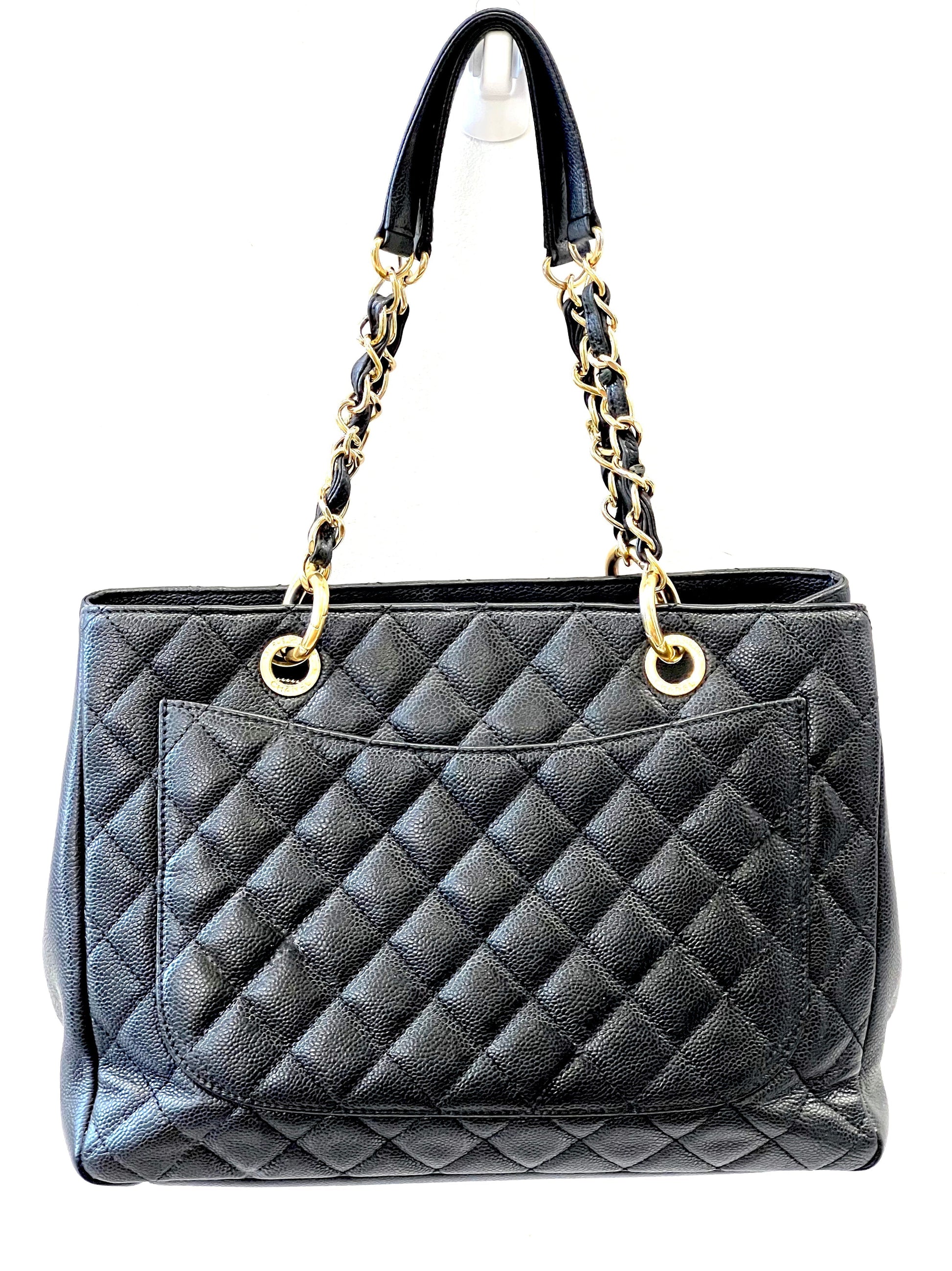 This GST tote is crafted of diamond quilted caviar leather in black. It features leather threaded polished gold chain-link shoulder straps with shoulder pads, a quilted Chanel CC logo on the front, and a flat pocket on the rear. The top opens to a partitioned black satin interior with both a zipper and patch pocket.