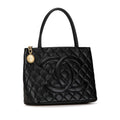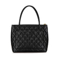 The Medallion tote bag features a quilted caviar leather body, rolled leather handles, a top zip closure, an exterior back slip pocket, and interior zip and slip pockets.