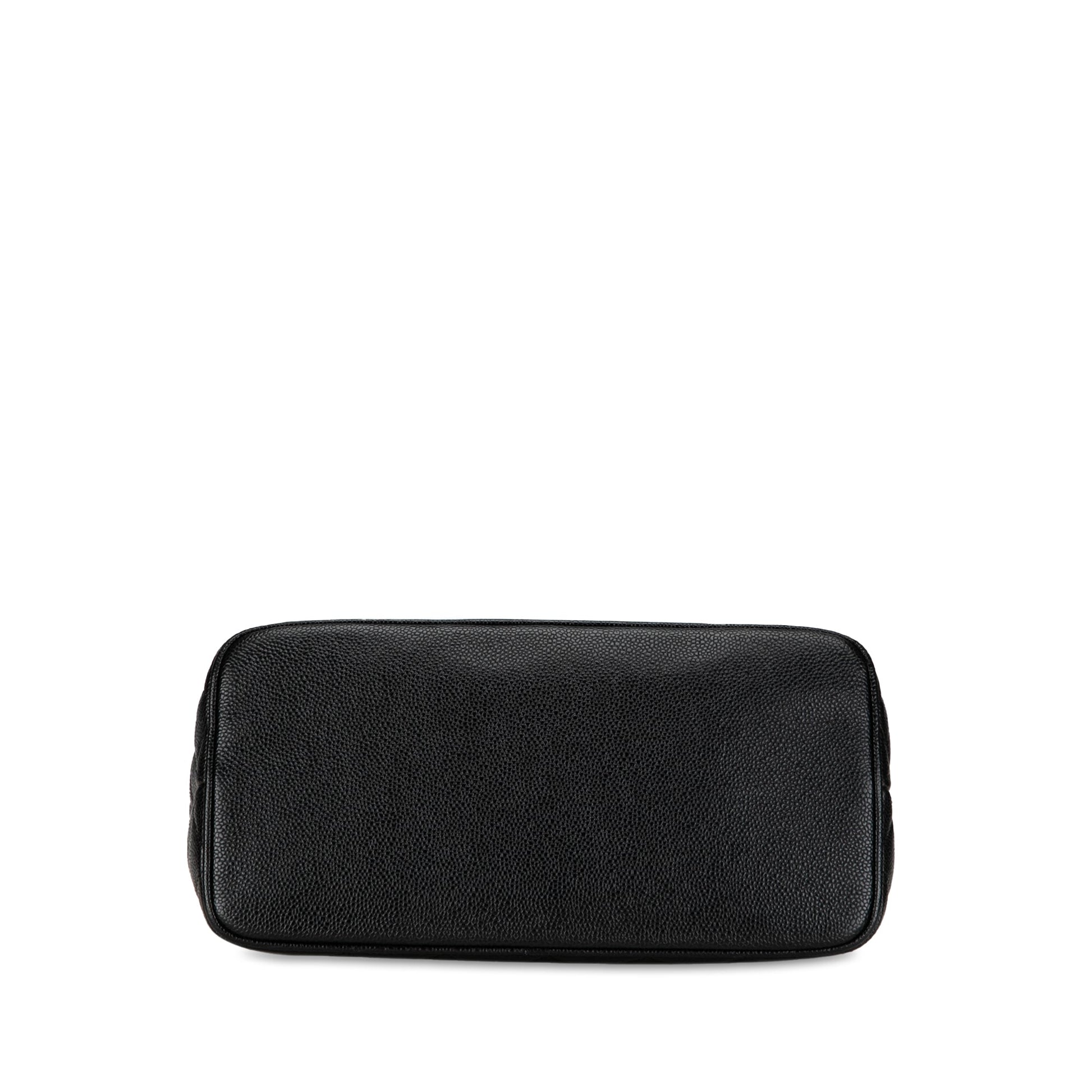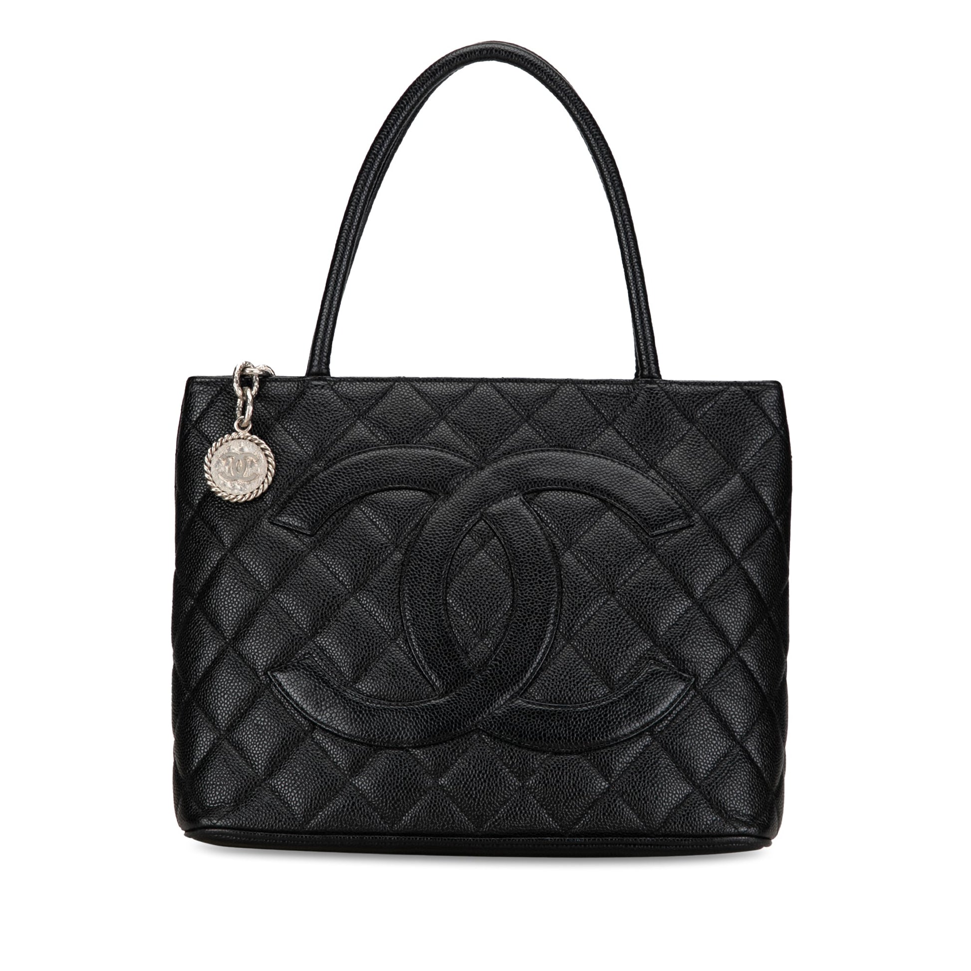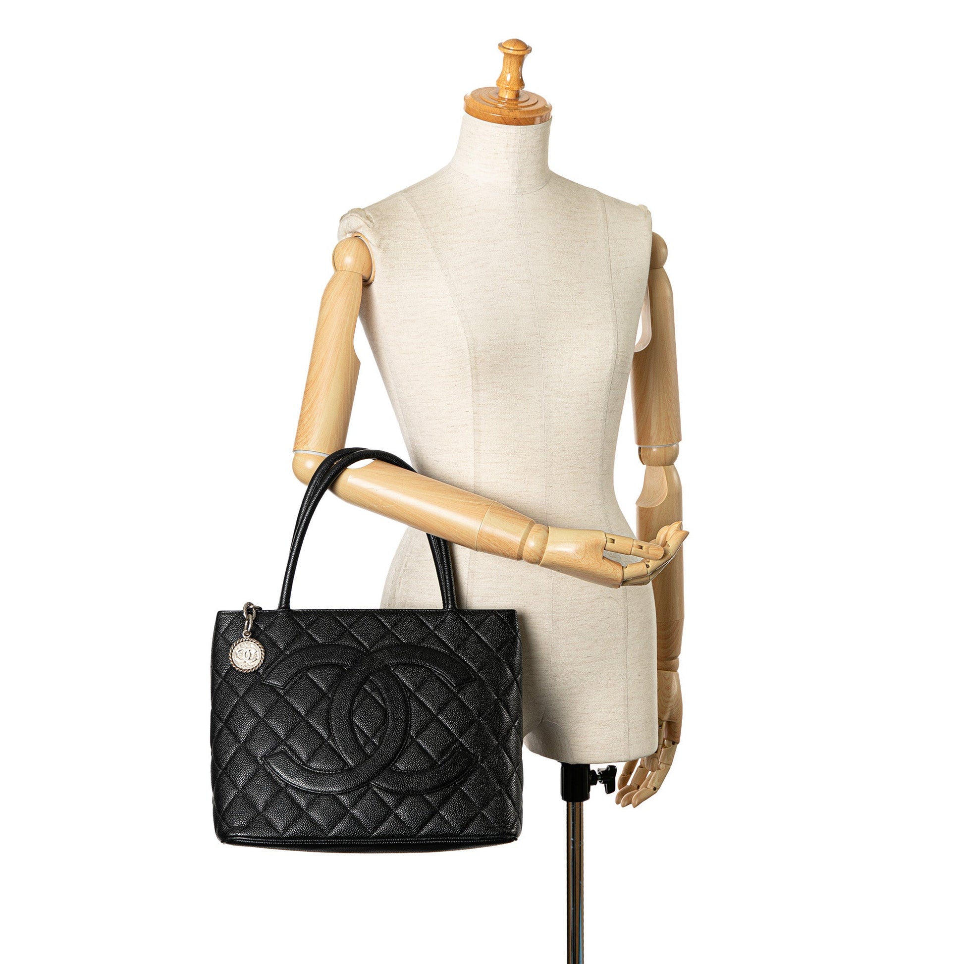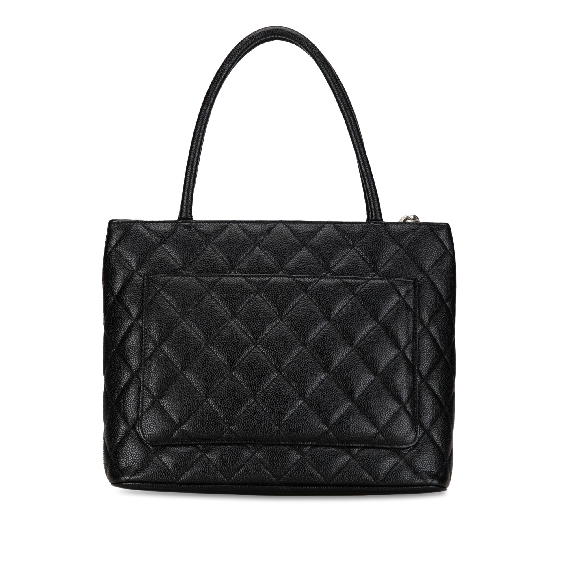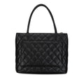 The Medallion Tote Bag features a quilted caviar leather body, rolled leather handles, a top zip closure, an exterior back slip pocket, and interior zip and slip pockets.