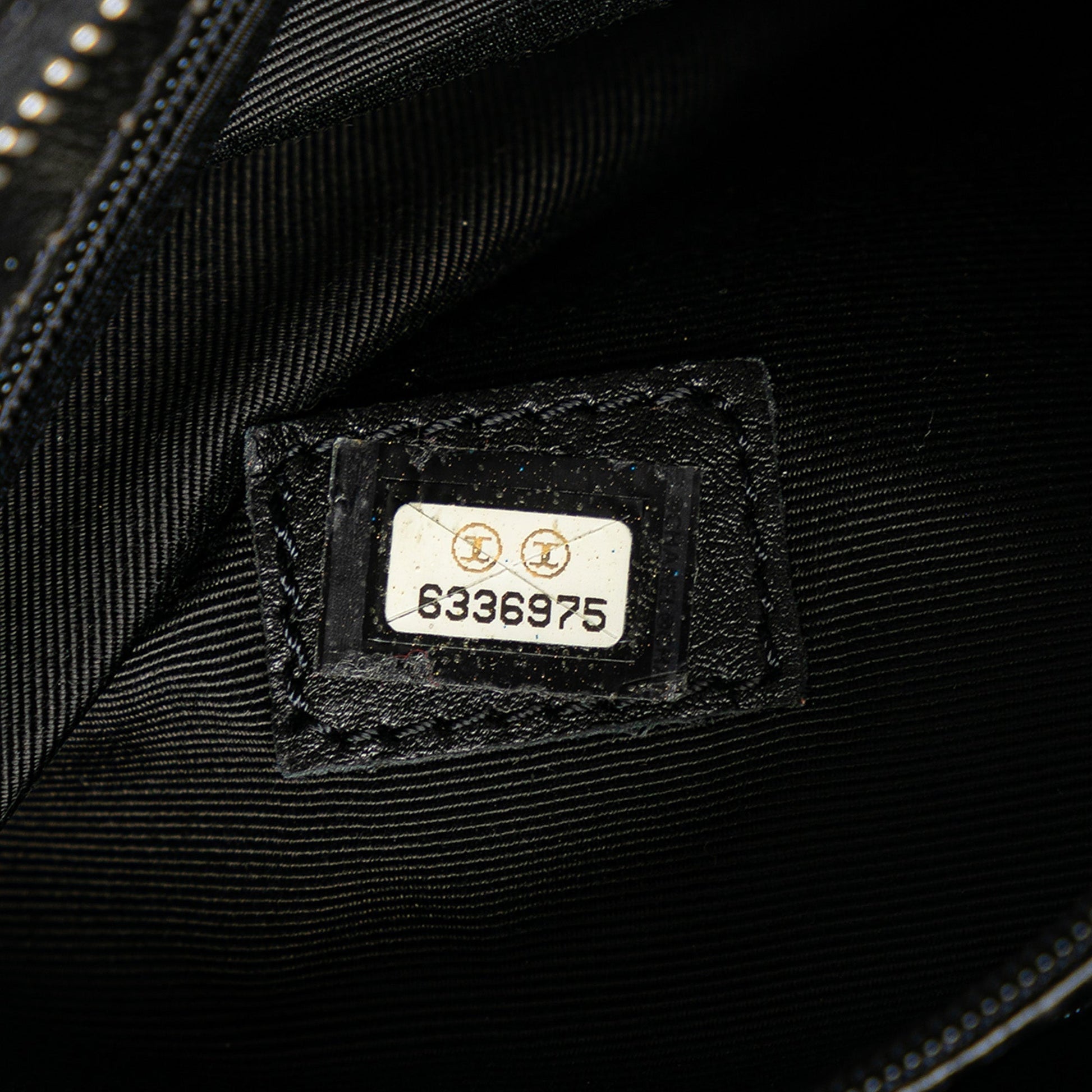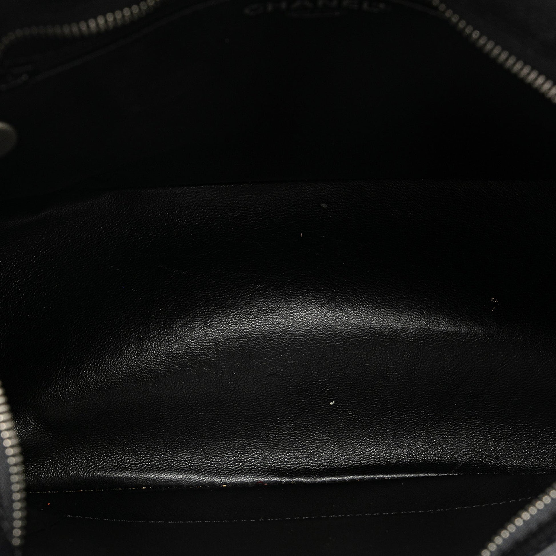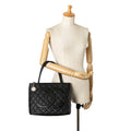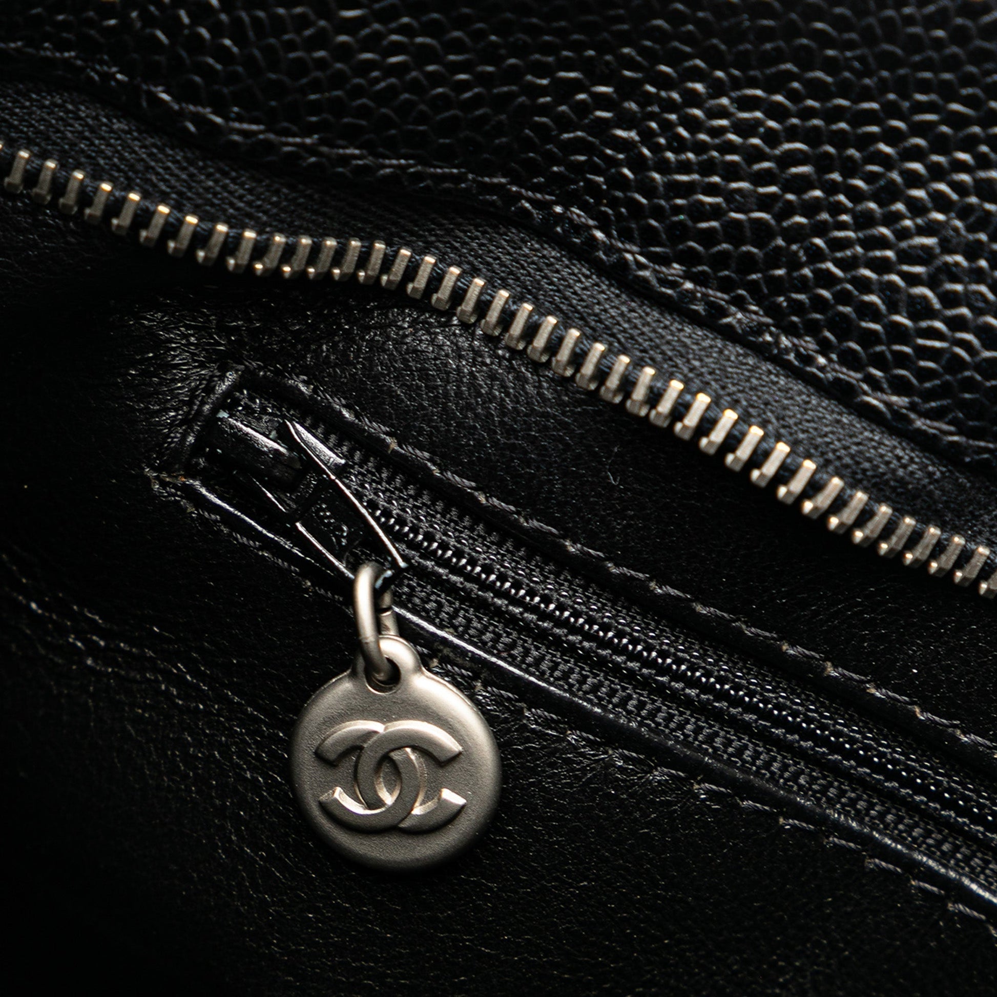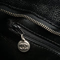 The Medallion Tote Bag features a quilted caviar leather body, rolled leather handles, a top zip closure, an exterior back slip pocket, and interior zip and slip pockets.