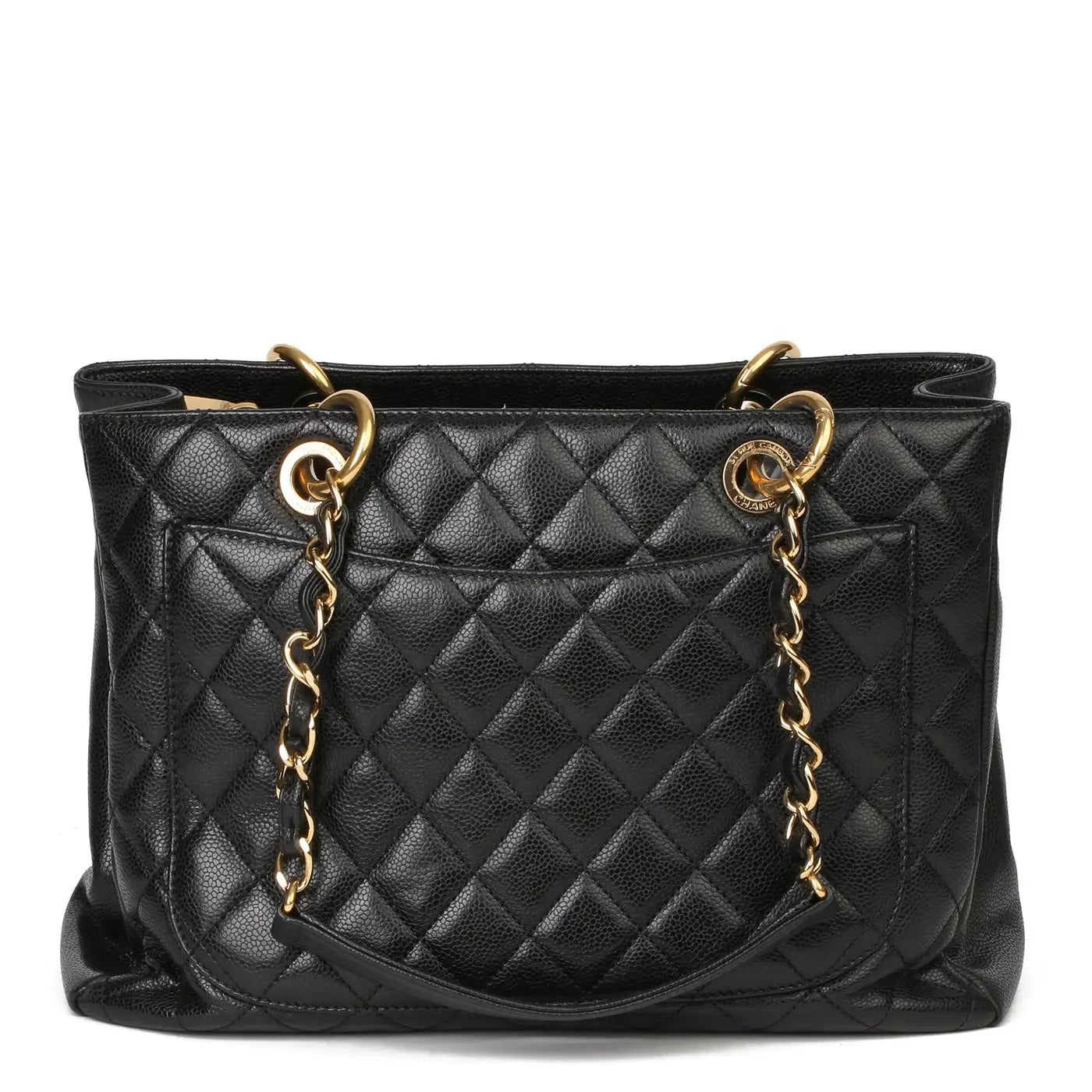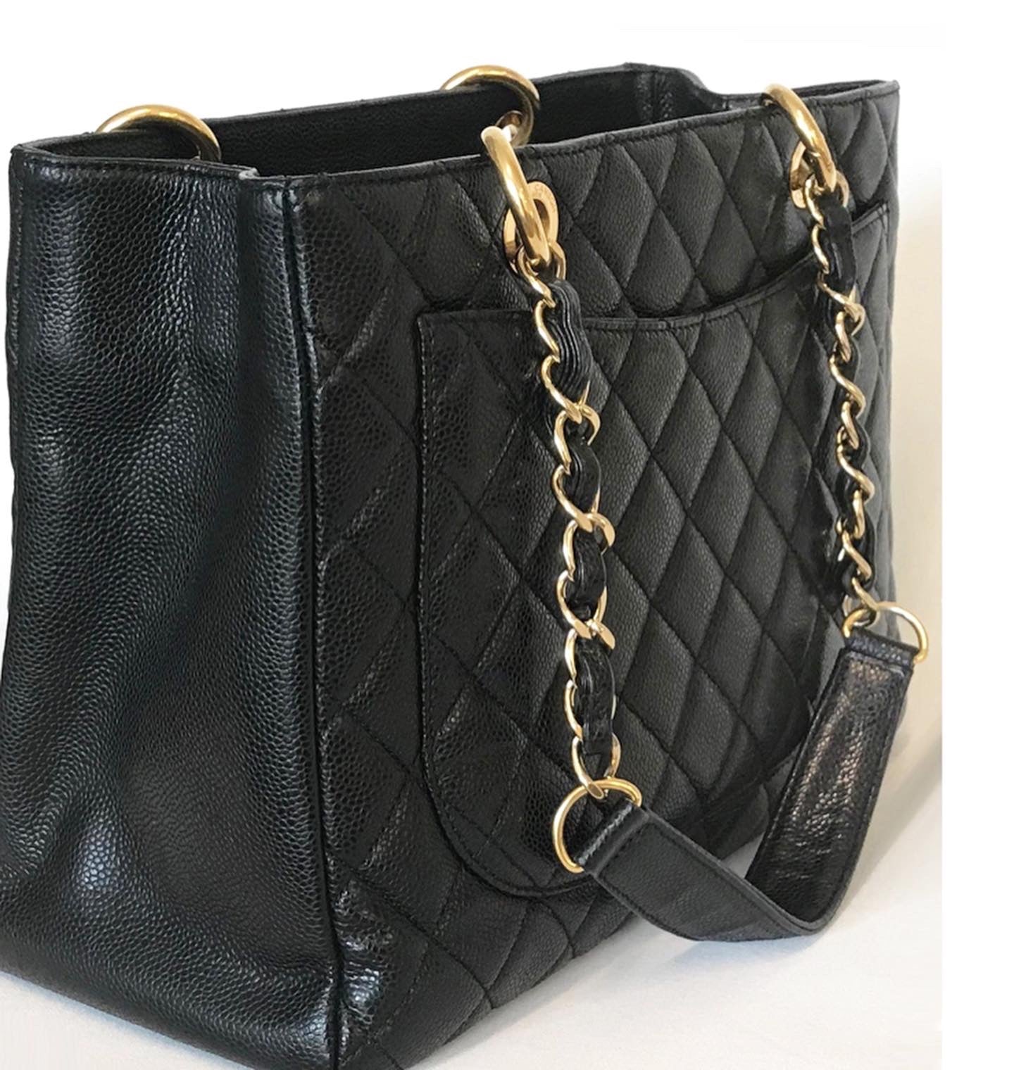 This GST tote is crafted of diamond quilted caviar leather in black. It features leather threaded polished gold chain-link shoulder straps with shoulder pads, a quilted Chanel CC logo on the front, and a flat pocket on the rear. The top opens to a partitioned black satin interior with both a zipper and patch pocket.