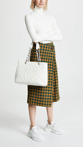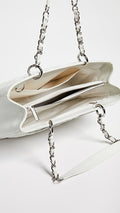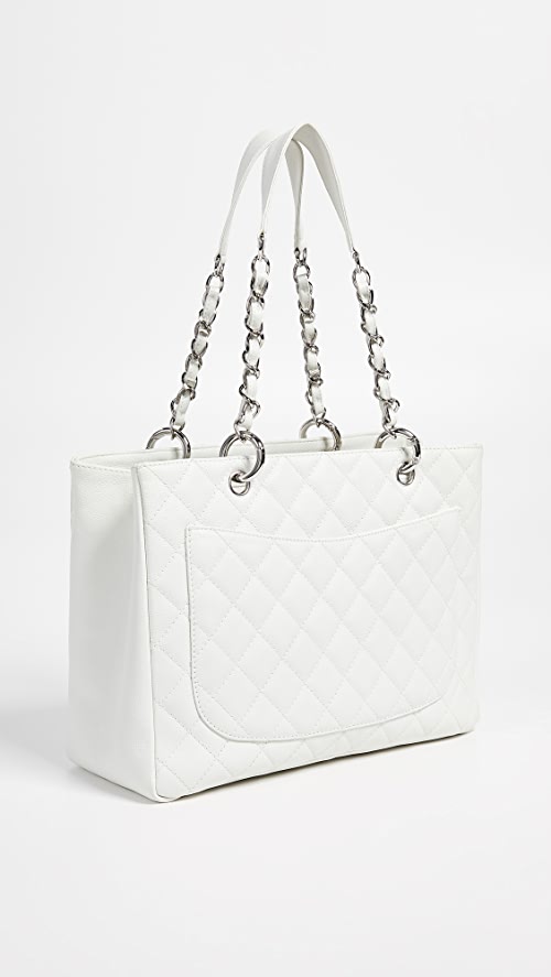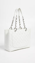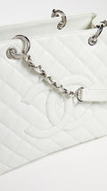 crafted of luxurious diamond quilted caviar leather in white. The bag features silver chain link leather threaded shoulder straps with shoulder pads, a stitched Chanel CC logo, and a rear patch pocket. The top opens to a partitioned dark gray satin interior with zipper and patch pockets.
