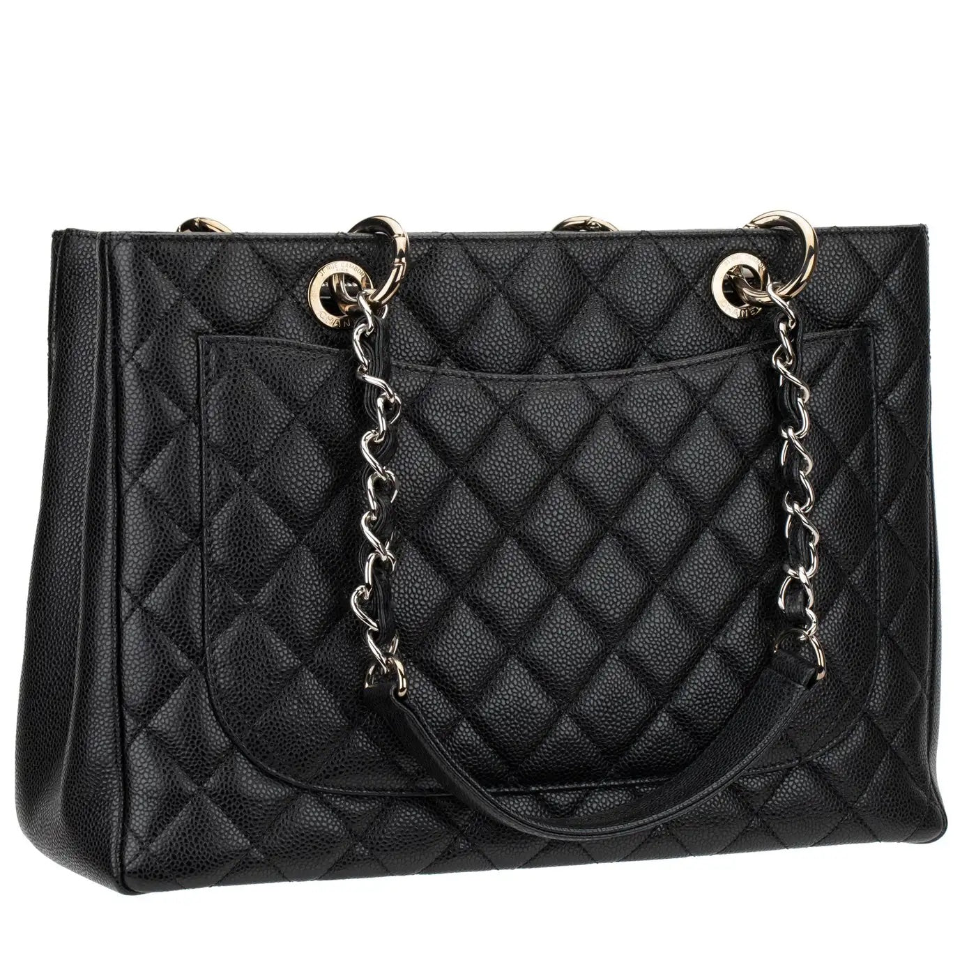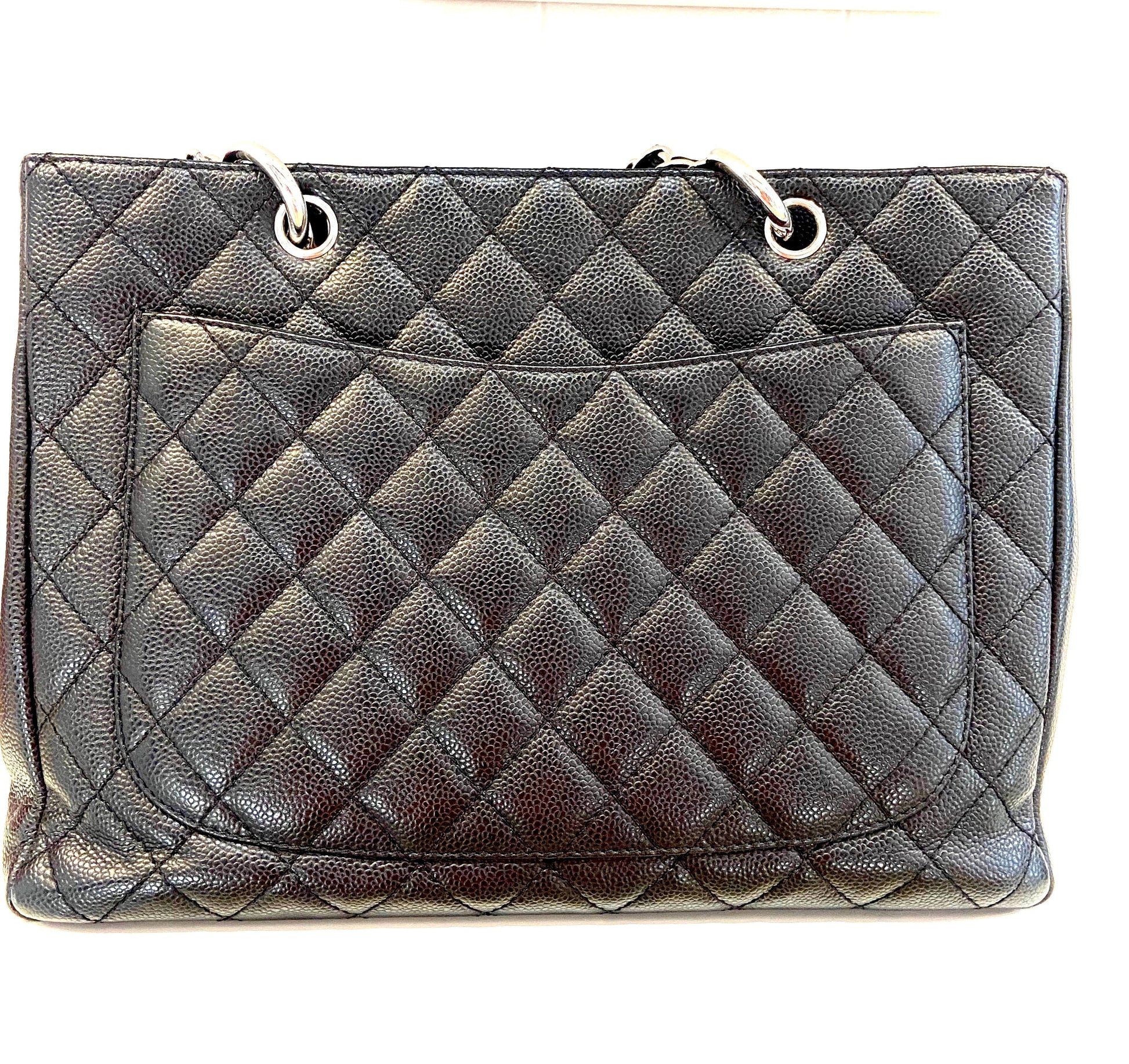 This GST tote is crafted of diamond quilted caviar leather in black. It features leather threaded polished Silver-tone chain-link shoulder straps with shoulder pads, a quilted Chanel CC logo on the front, and a flat pocket on the rear. The top opens to a partitioned black satin interior with both a zipper and patch pocket.