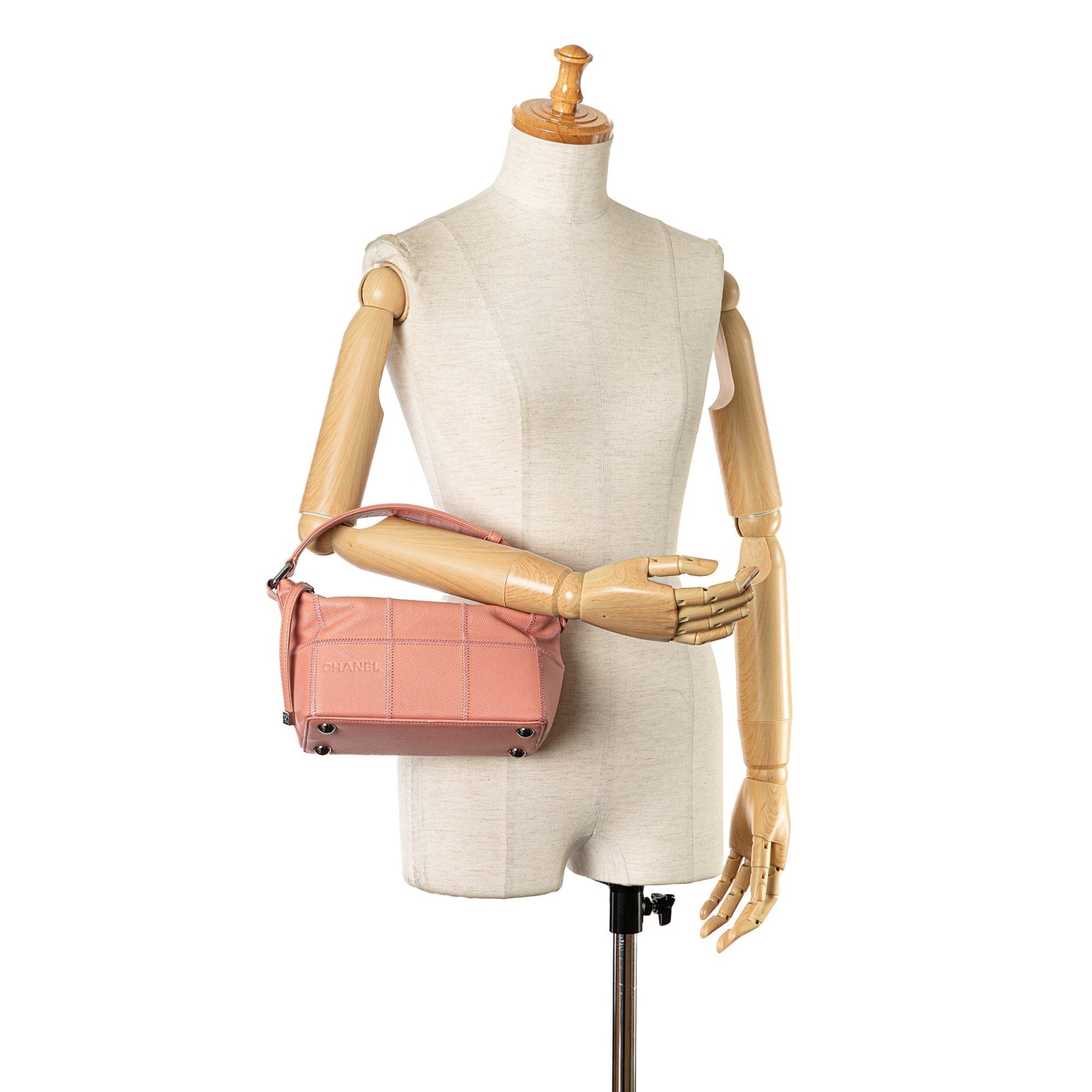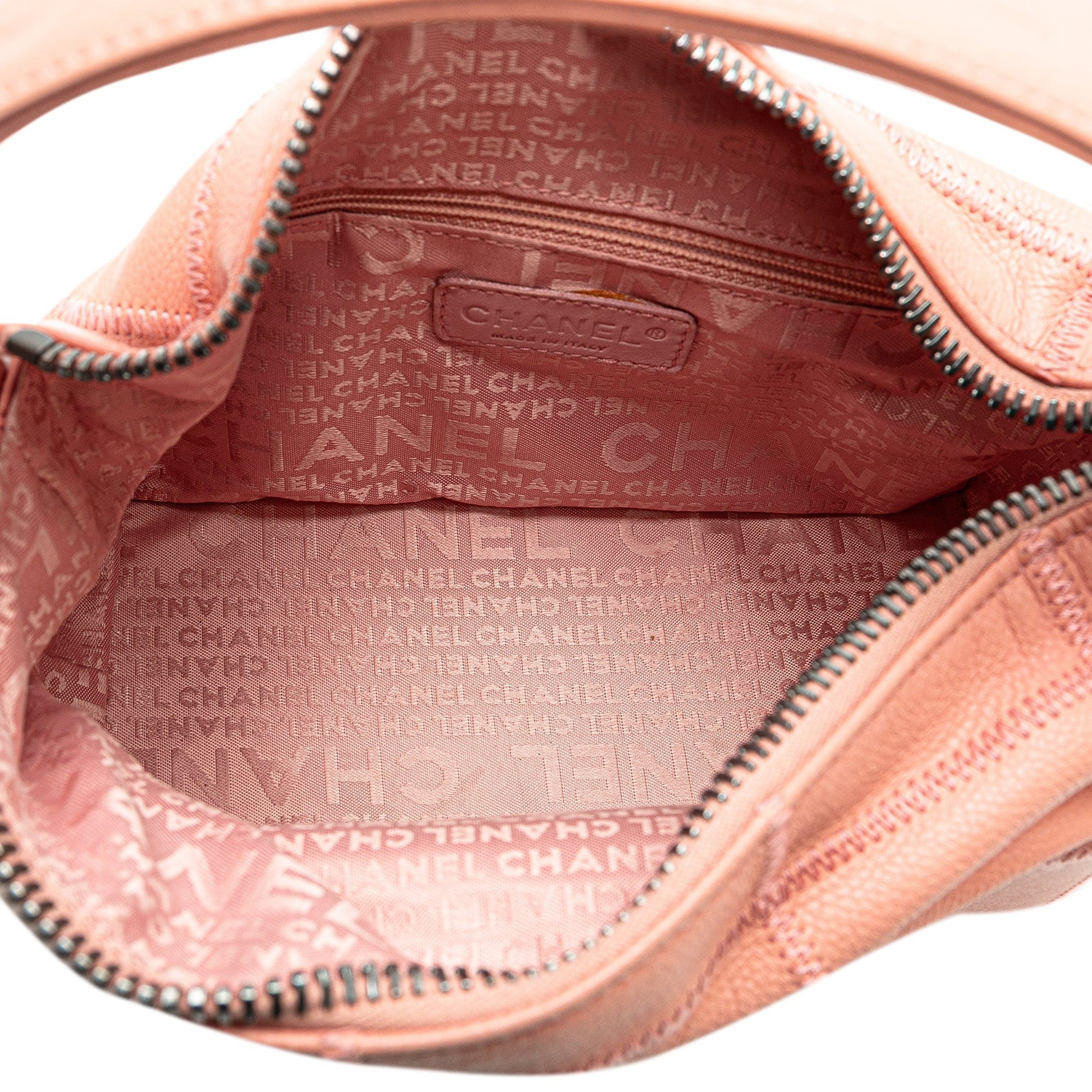 This handBag features a caviar leather body, a flat leather handle, a top zip closure, and an interior zip pocket.