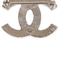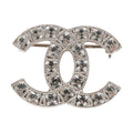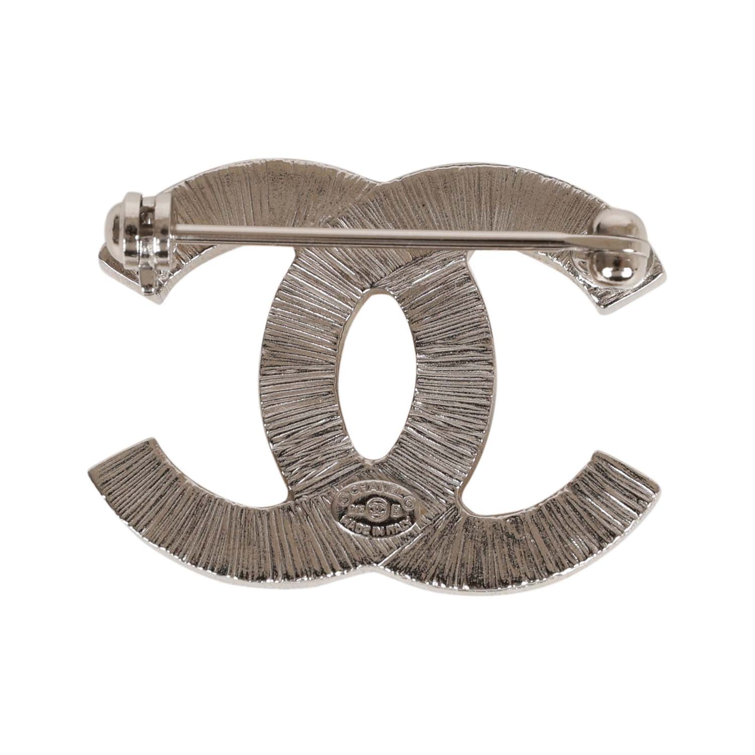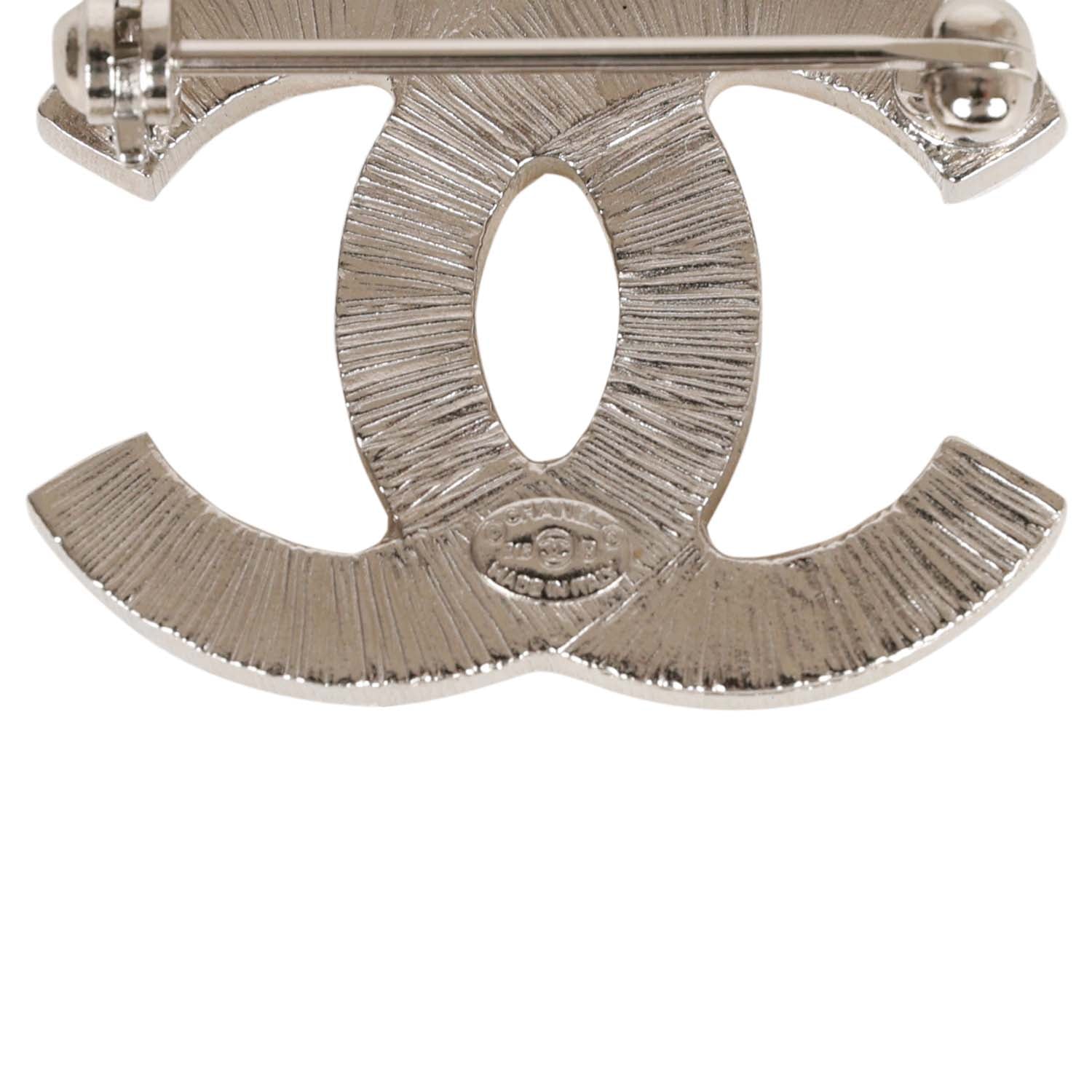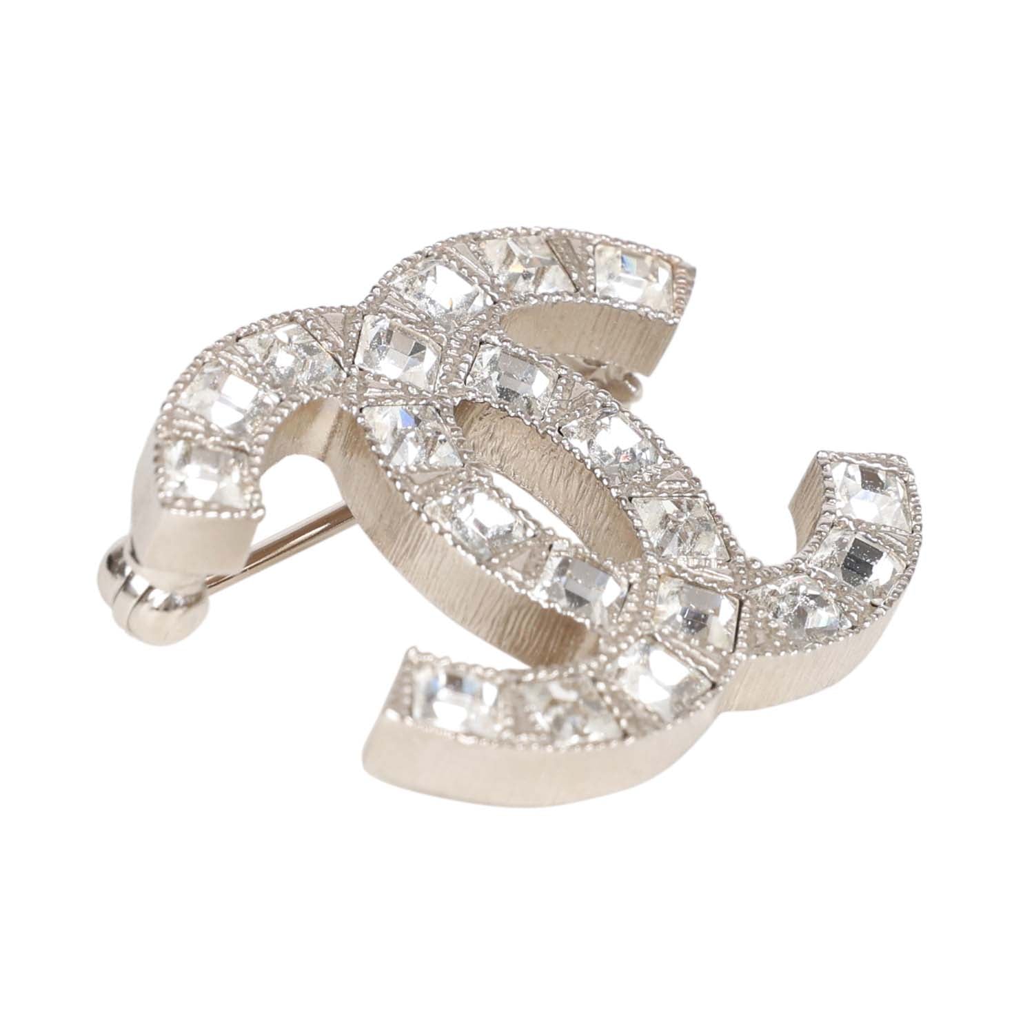 This brooch is in silver tone metal with clear crystals on the CC logo.