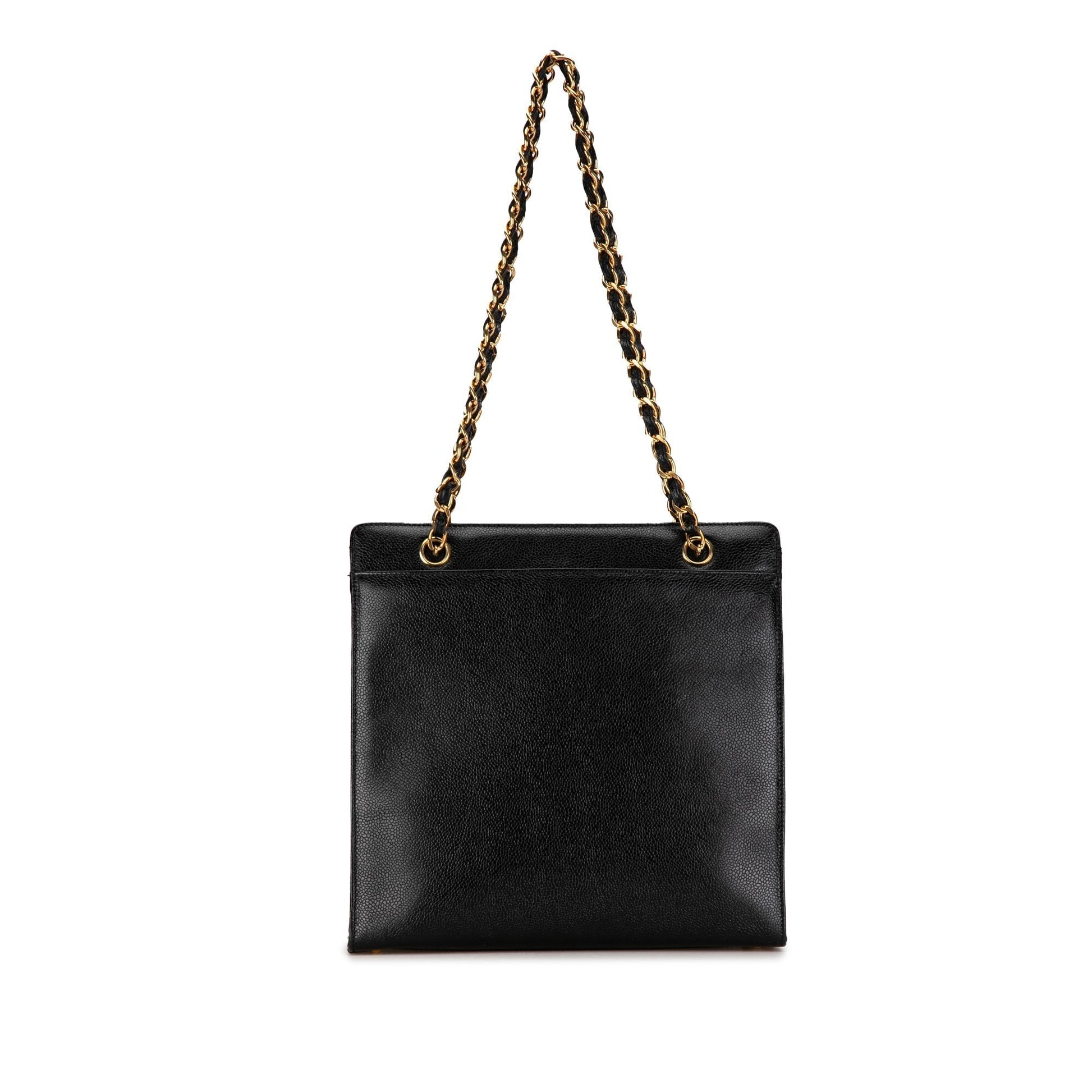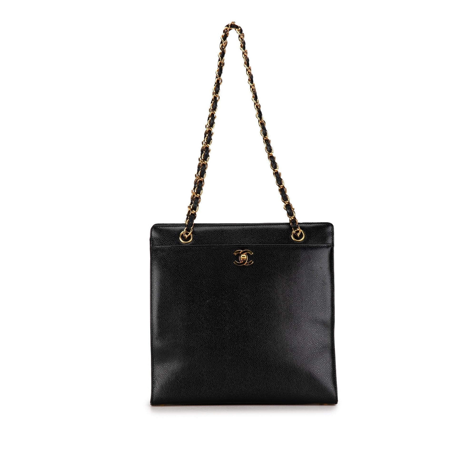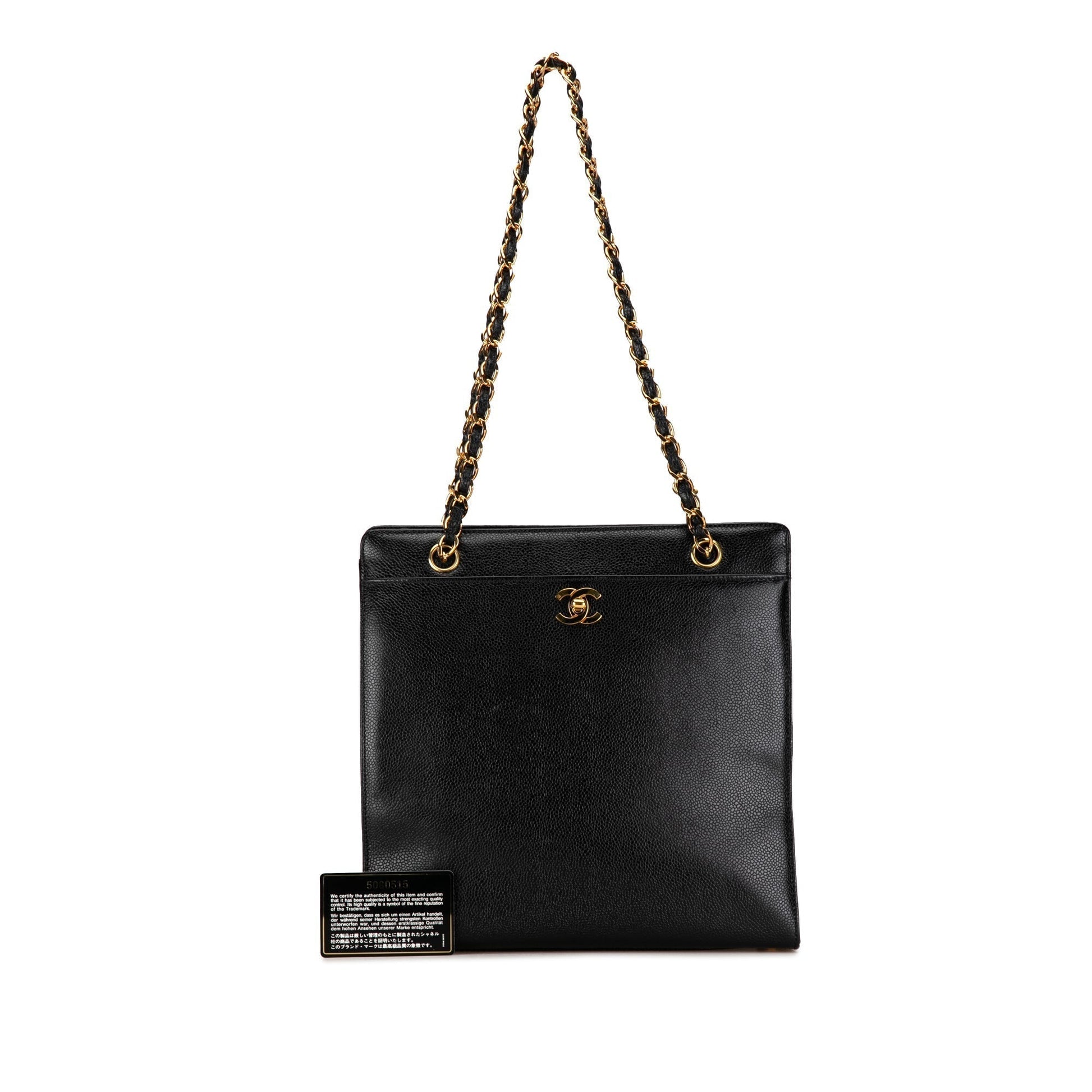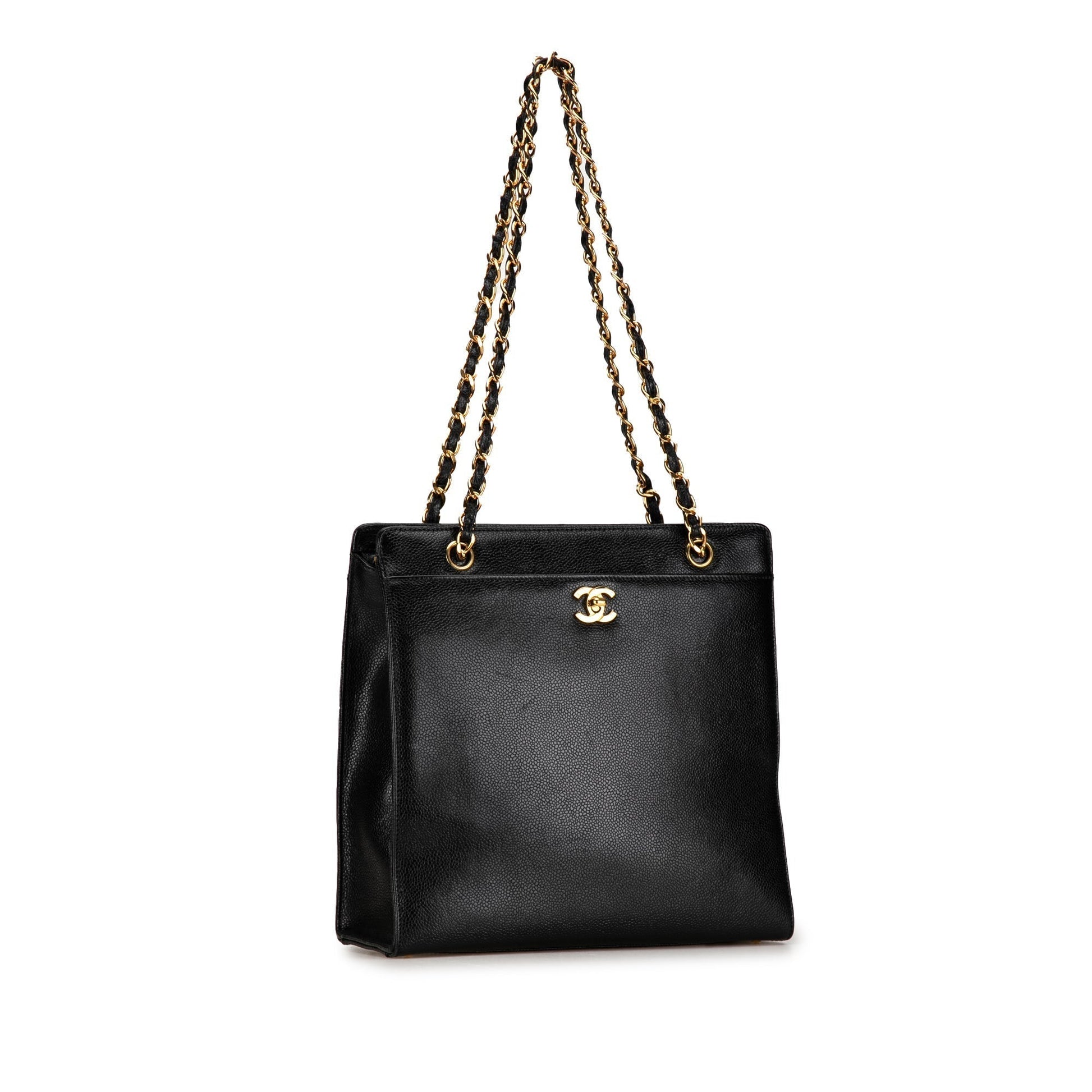 This Tote Bag features a caviar leather body, woven chain-link straps, a top zip closure, exterior slip pockets, and interior zip and slip pockets. Comes with ity card.