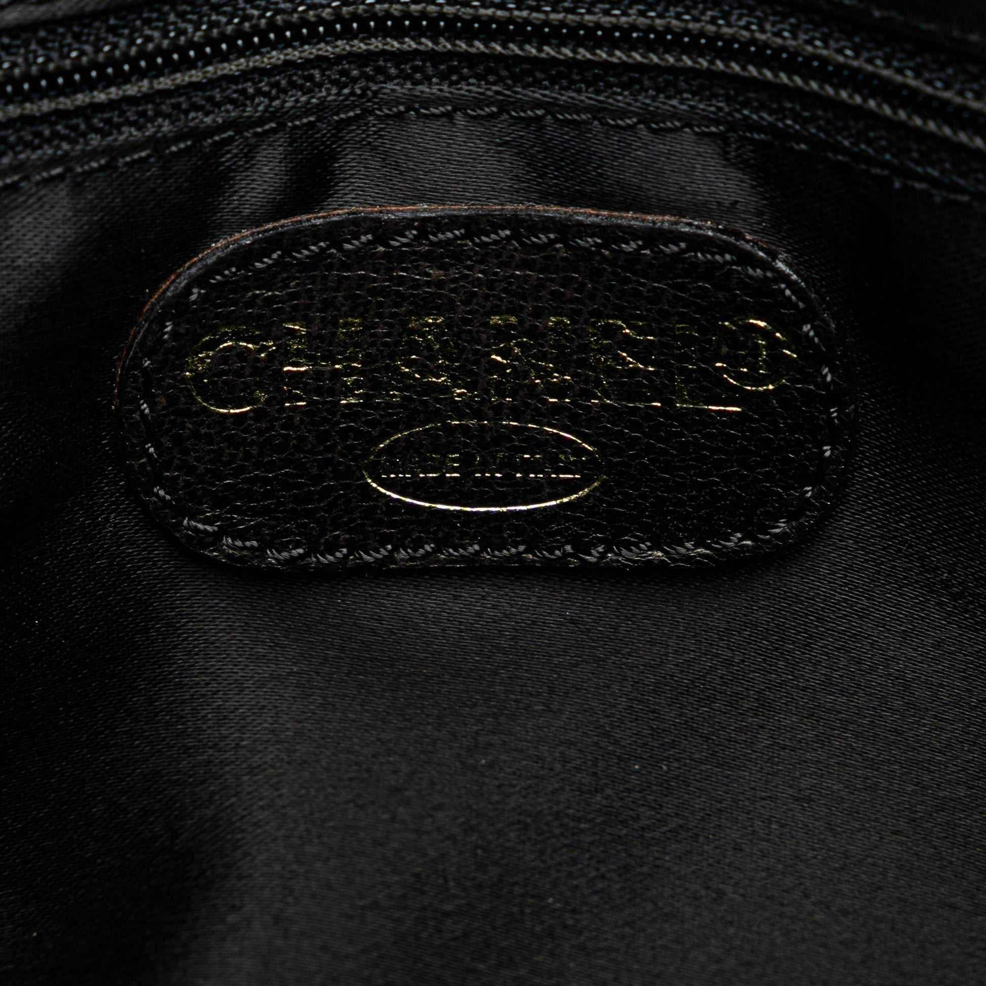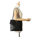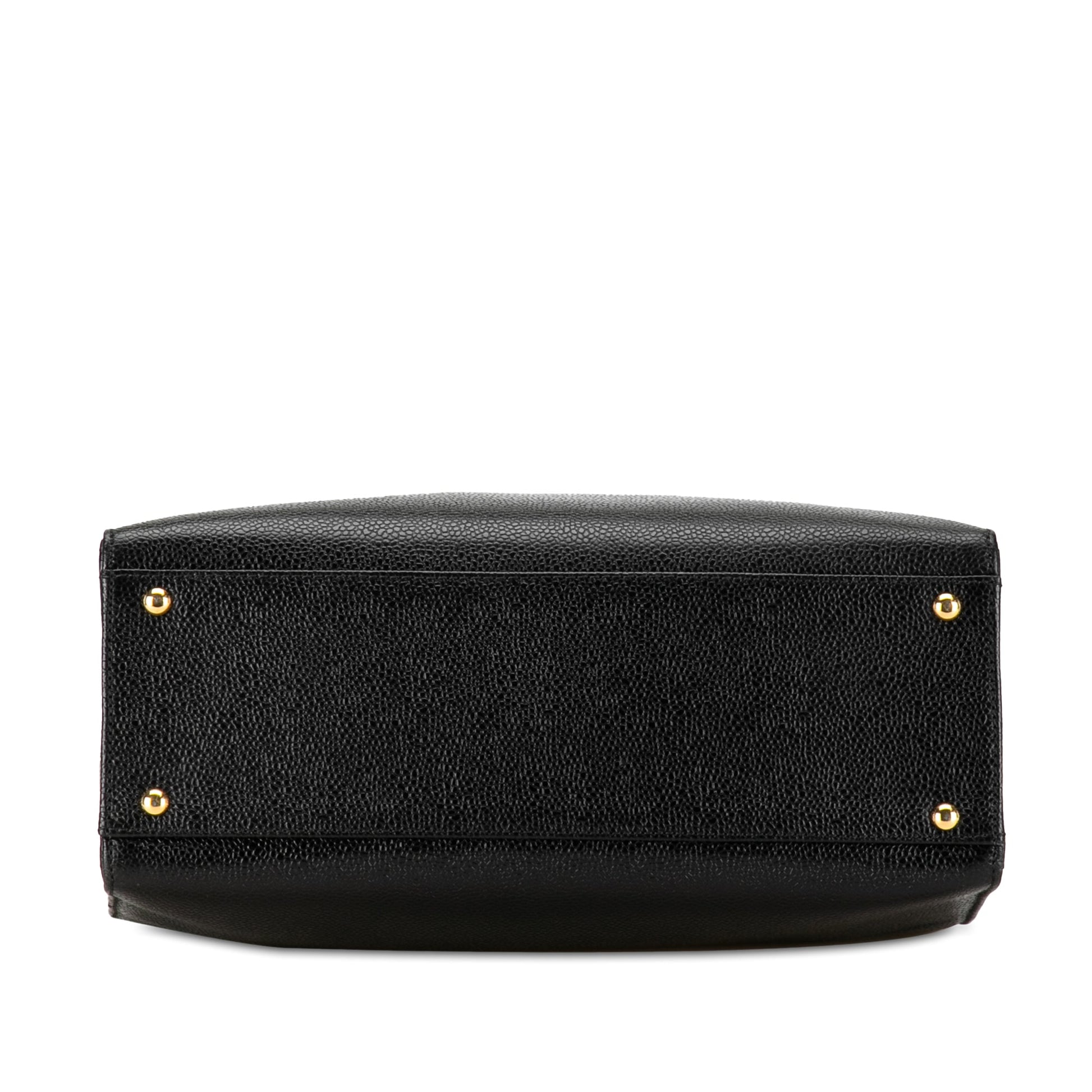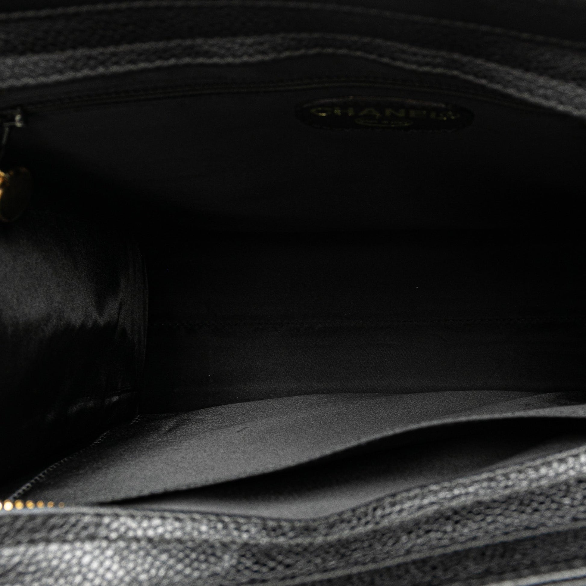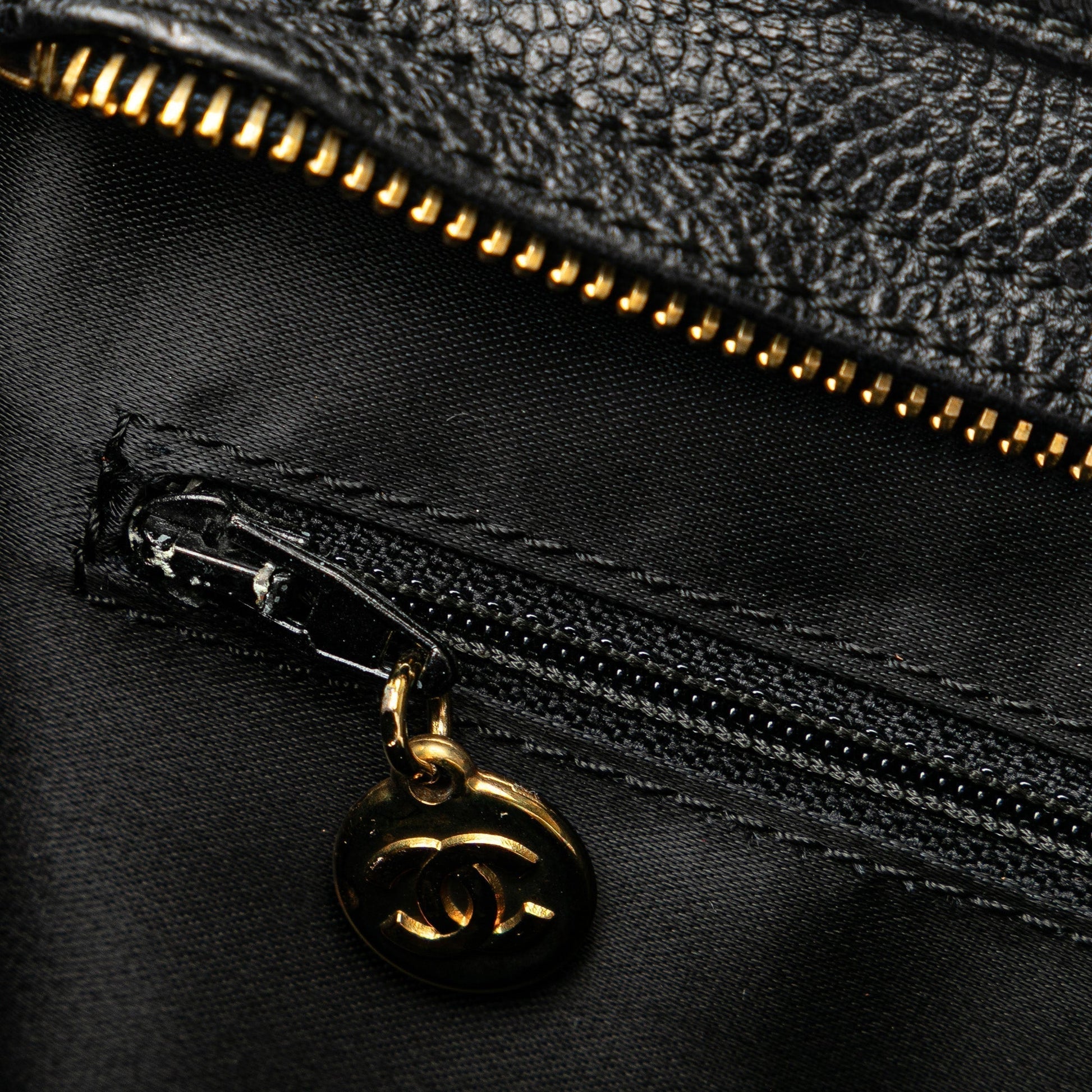 This Tote Bag features a caviar leather body, woven chain-link straps, a top zip closure, exterior slip pockets, and interior zip and slip pockets. Comes with ity card.