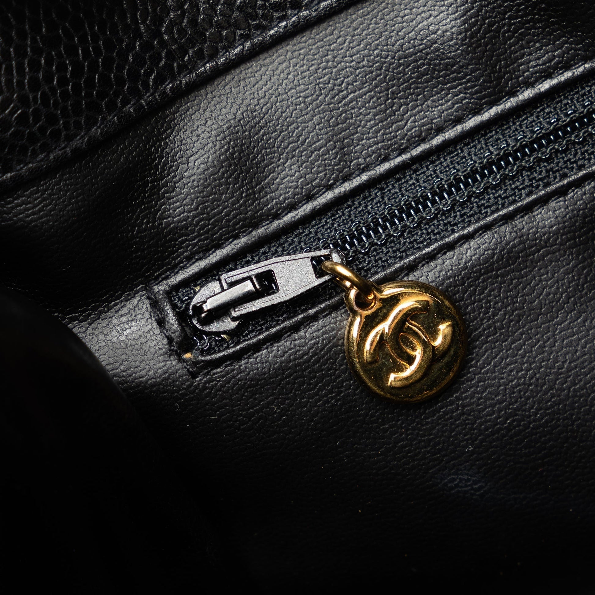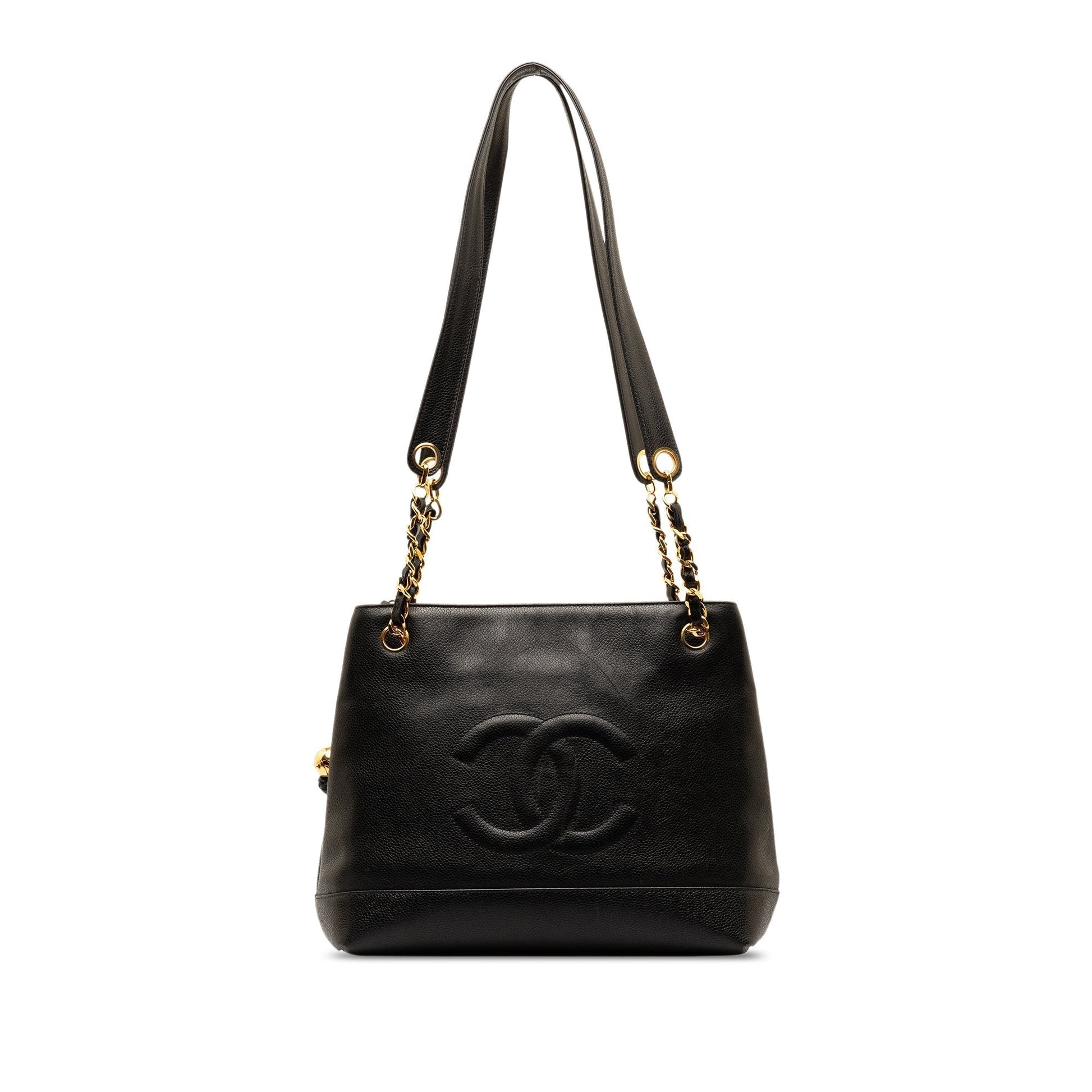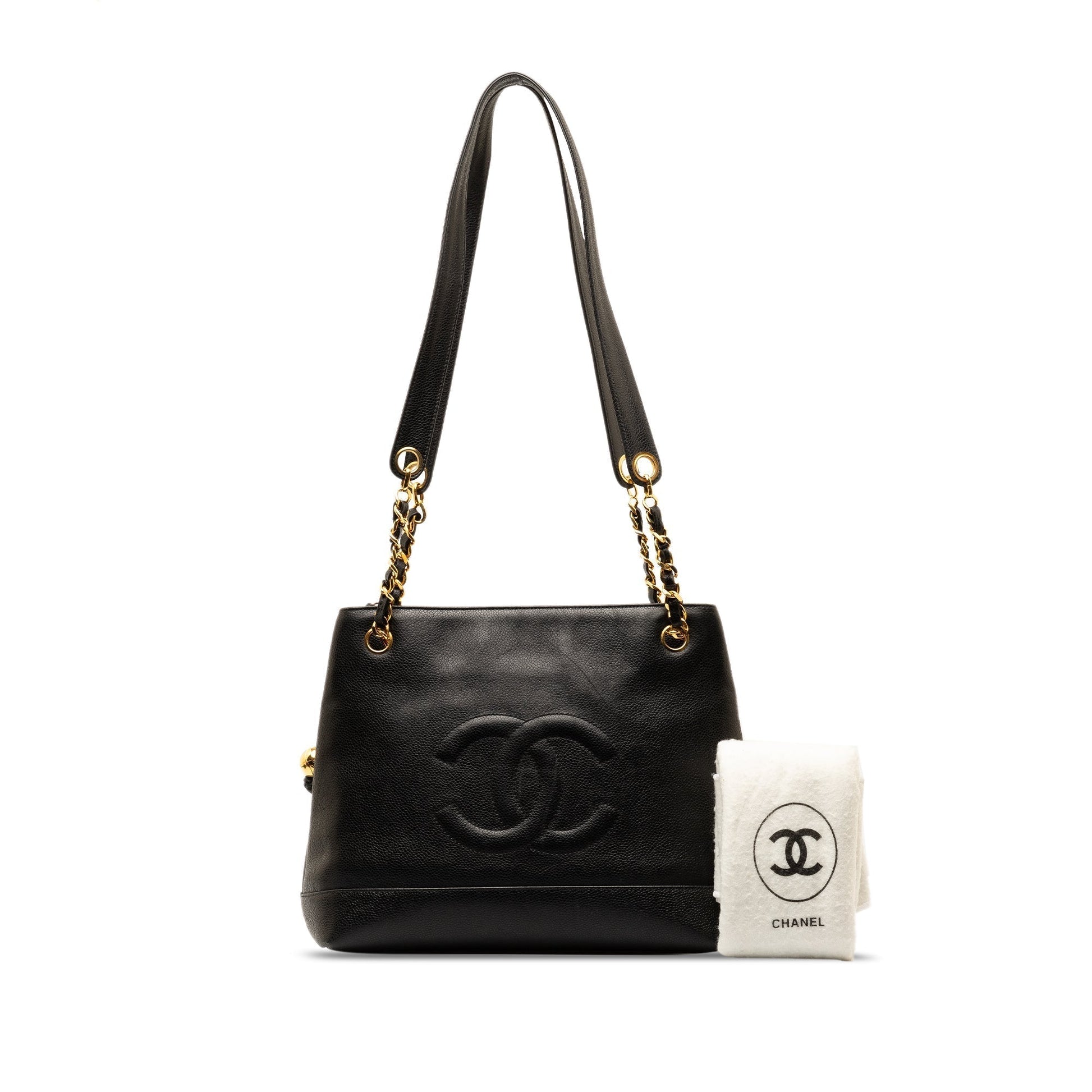 This Tote Bag features a caviar leather body, flat straps with gold-tone chain details, a top zip closure, exterior slip pockets, and an interior zip pocket. Comes with dust Bag