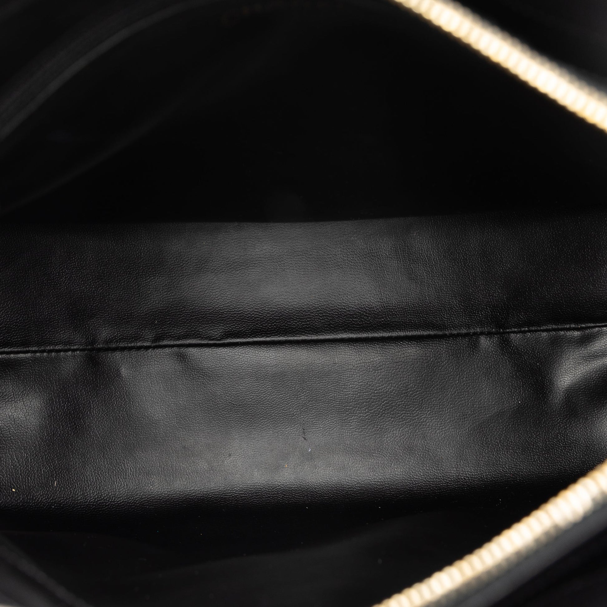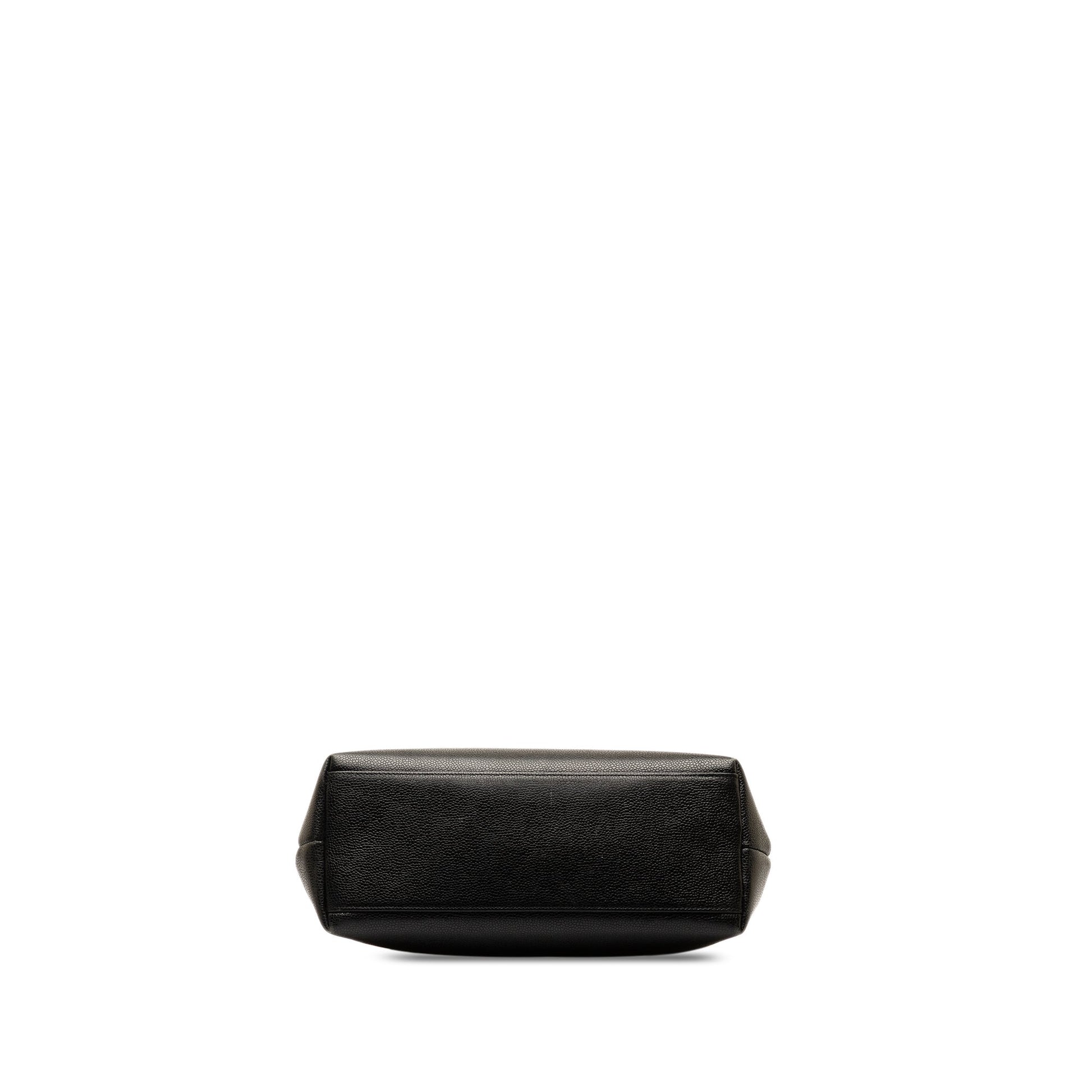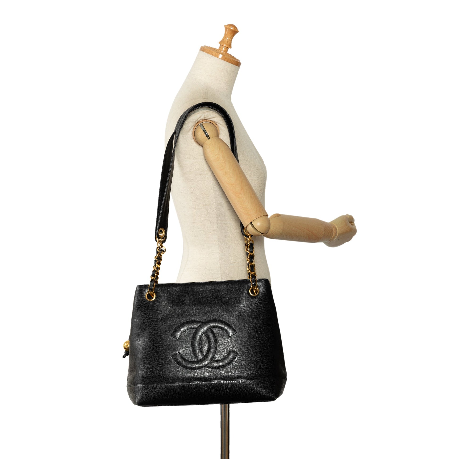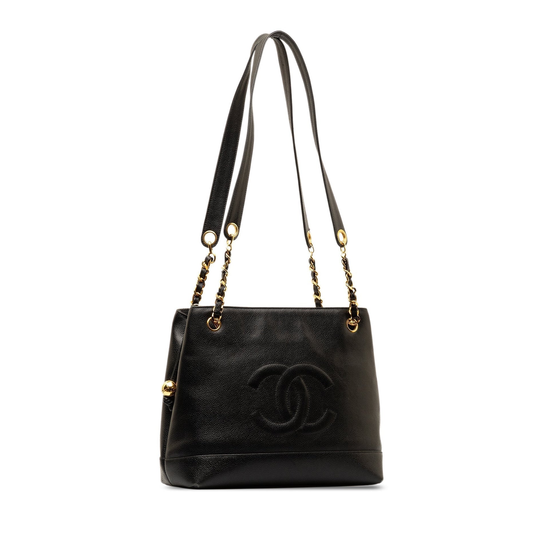 This Tote Bag features a caviar leather body, flat straps with gold-tone chain details, a top zip closure, exterior slip pockets, and an interior zip pocket. Comes with dust Bag
