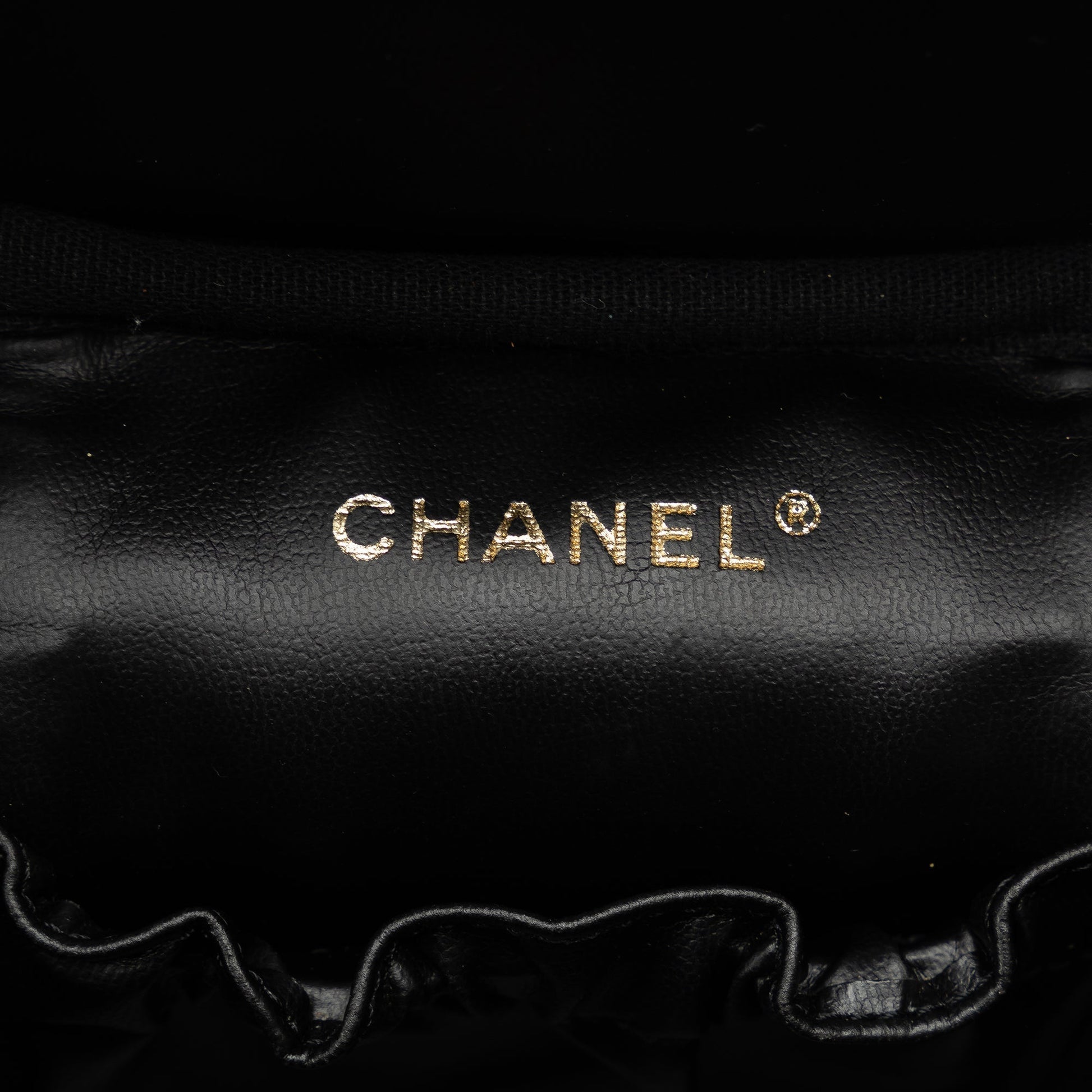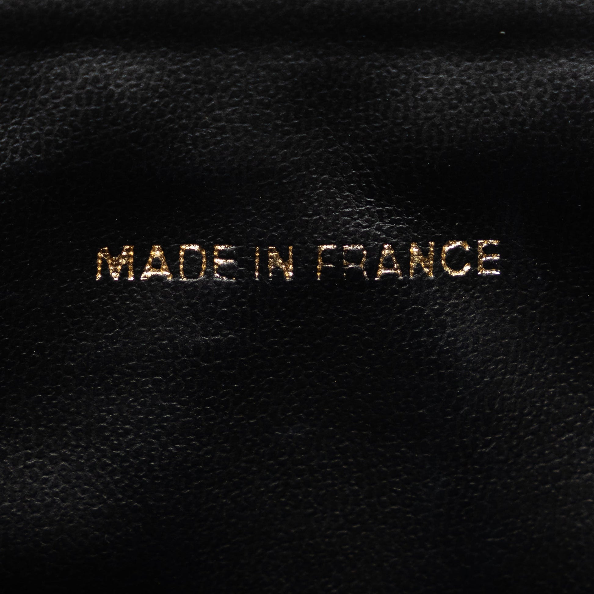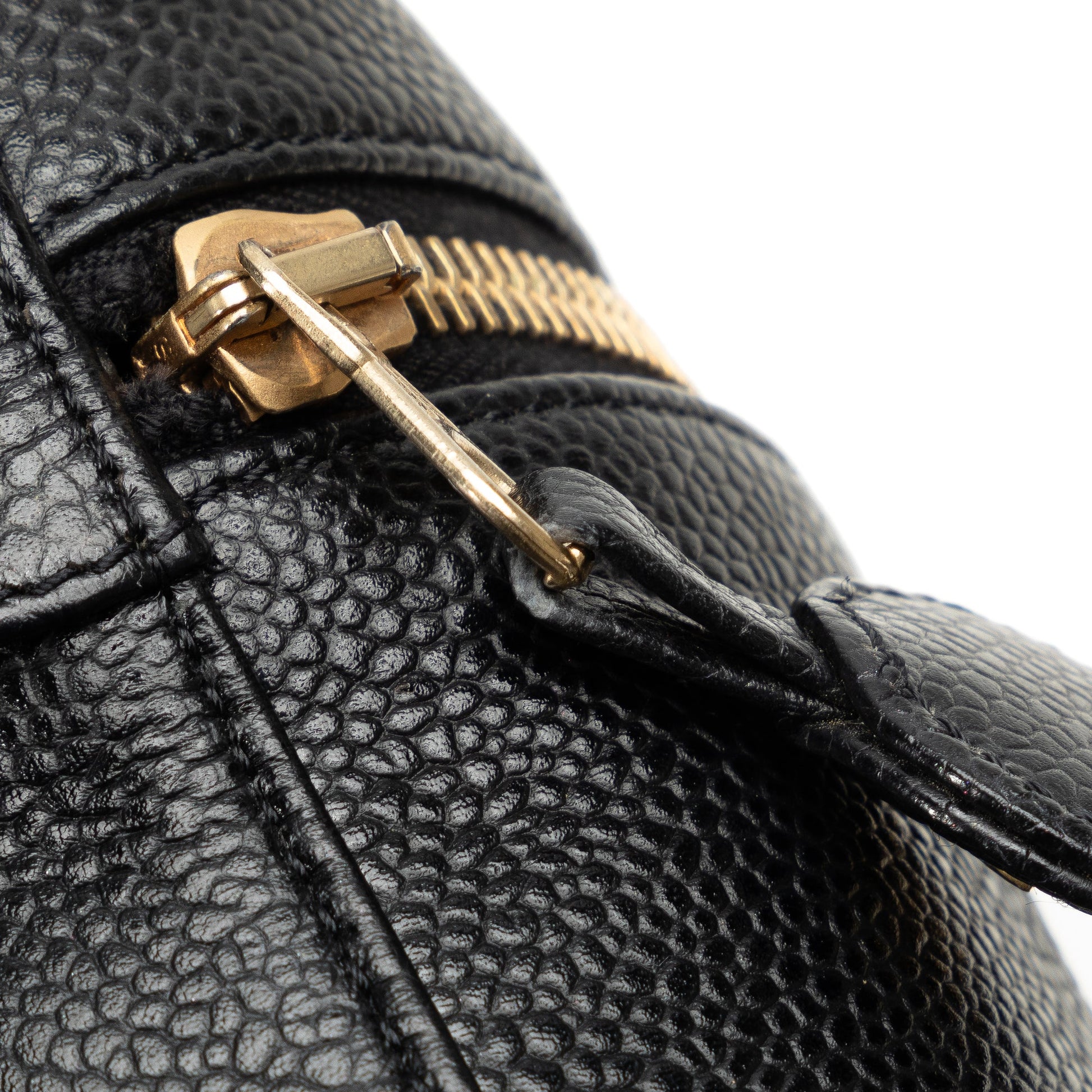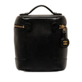 This vanity Bag features a caviar leather body, a flat leather top handle, a zip-around closure, and an interior slip pocket. Comes with ity card.