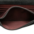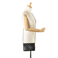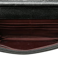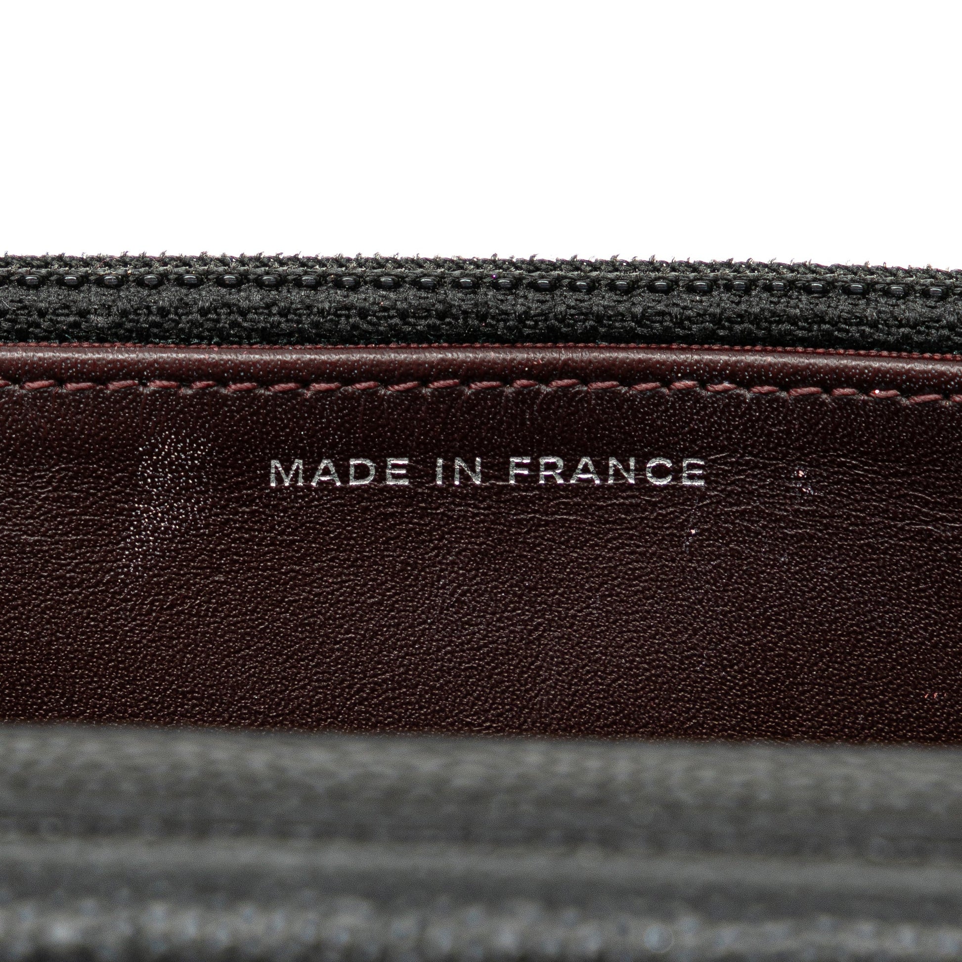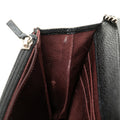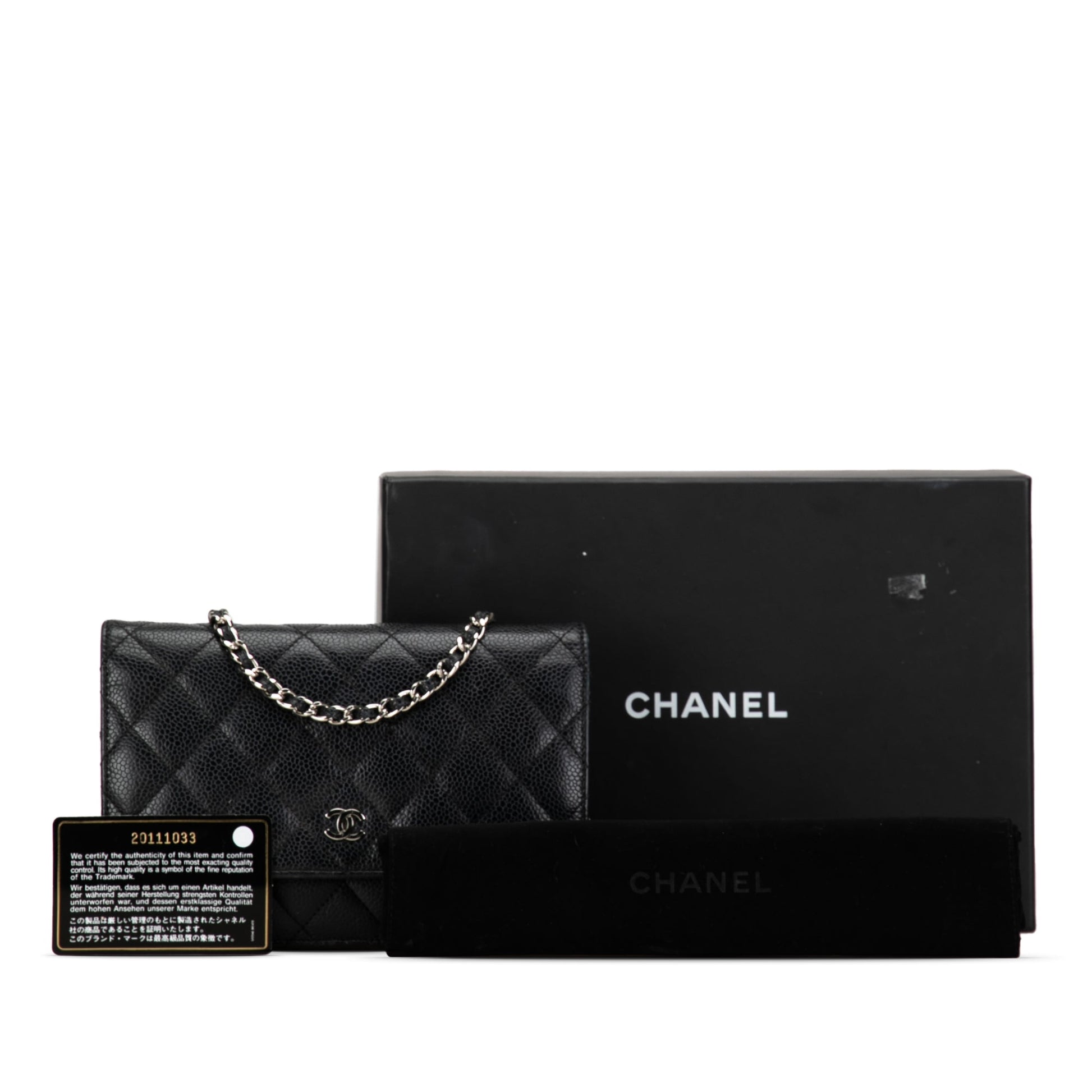 This wallet on chain features a quilted caviar leather body, a silver-tone leather woven chain strap, a front flap with magnetic snap closure, an exterior back slip pocket, a top zip compartment, and interior slip pockets. Comes with ity card, box and dust Bag.