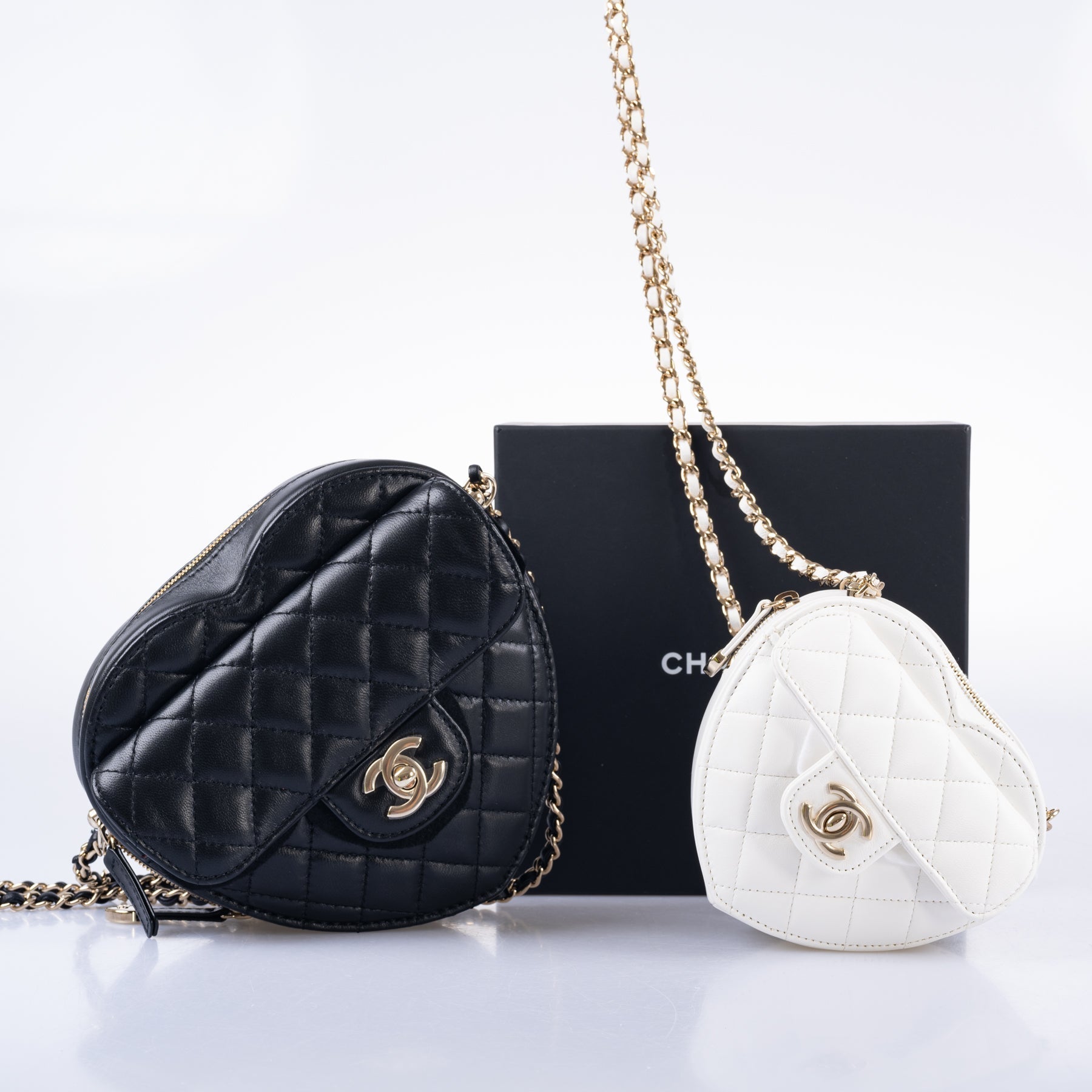 The Chanel CC In Love bags are the ultimate statement piece for any fashion-forward individual. Their heart-shaped design and classic Chanel details make them a must-have for any handbag lover. The white lambskin leather version, known as the "Clutch with Chain," is a perfect example of the brand's iconic style. The quilted leather, interwoven leather and chain strap, and CC turnlock closure all come together to create a truly luxurious piece. And with its mini size of just 4.7 inches across and 5.1 inches tall, it's the perfect size for carrying all your essentials. The pale gold hardware adds an extra touch of sophistication, making these bags the perfect choice for any stylish fashionista.
