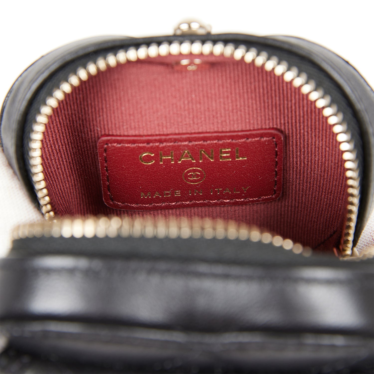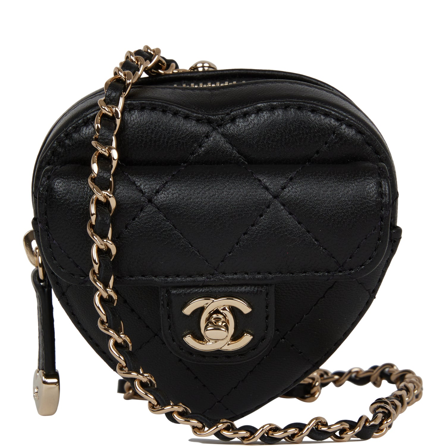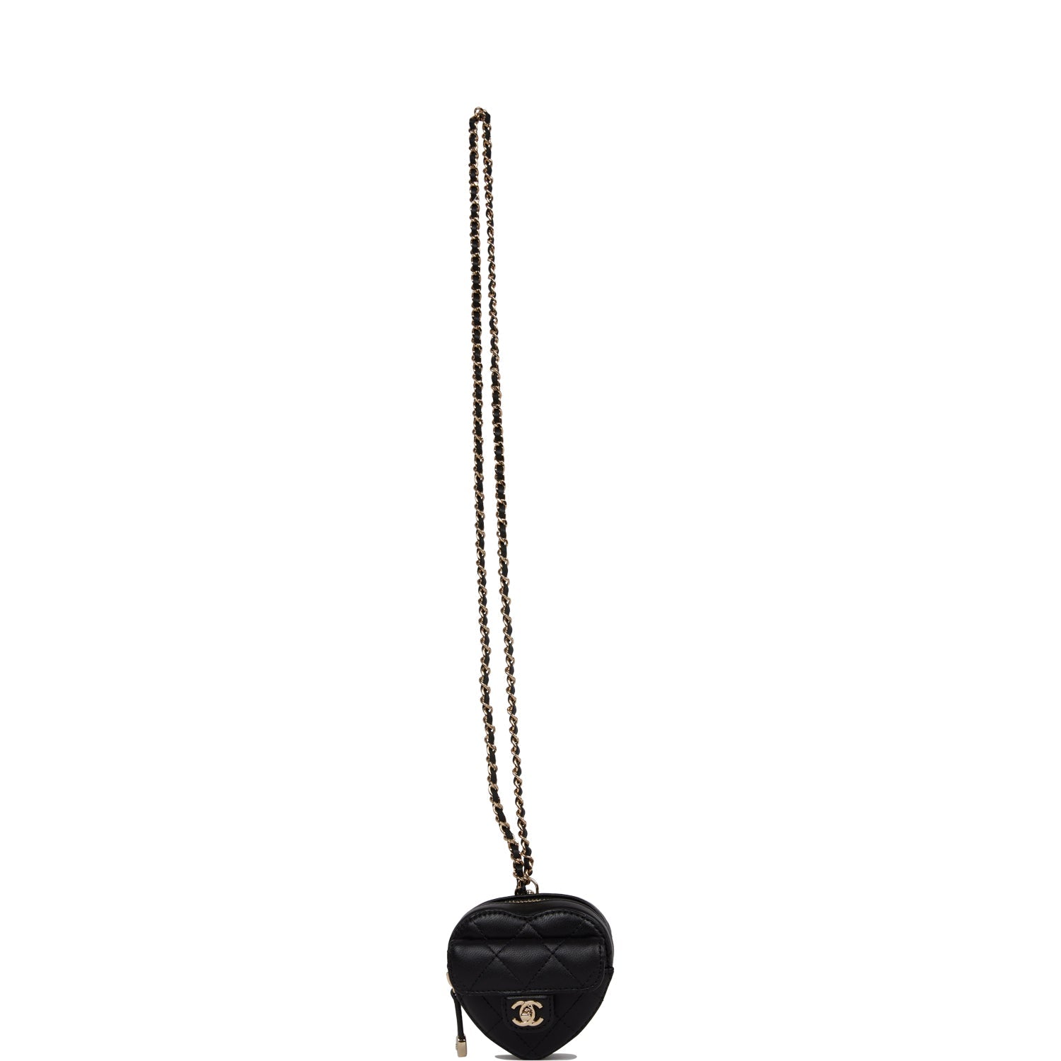 This CC In Love Heart Necklace Bag is in black lambskin leather with light gold tone hardware and features a front flap with signature CC turnlock closure, zip top closure and an interwoven light gold tone chain link and black leather strap.