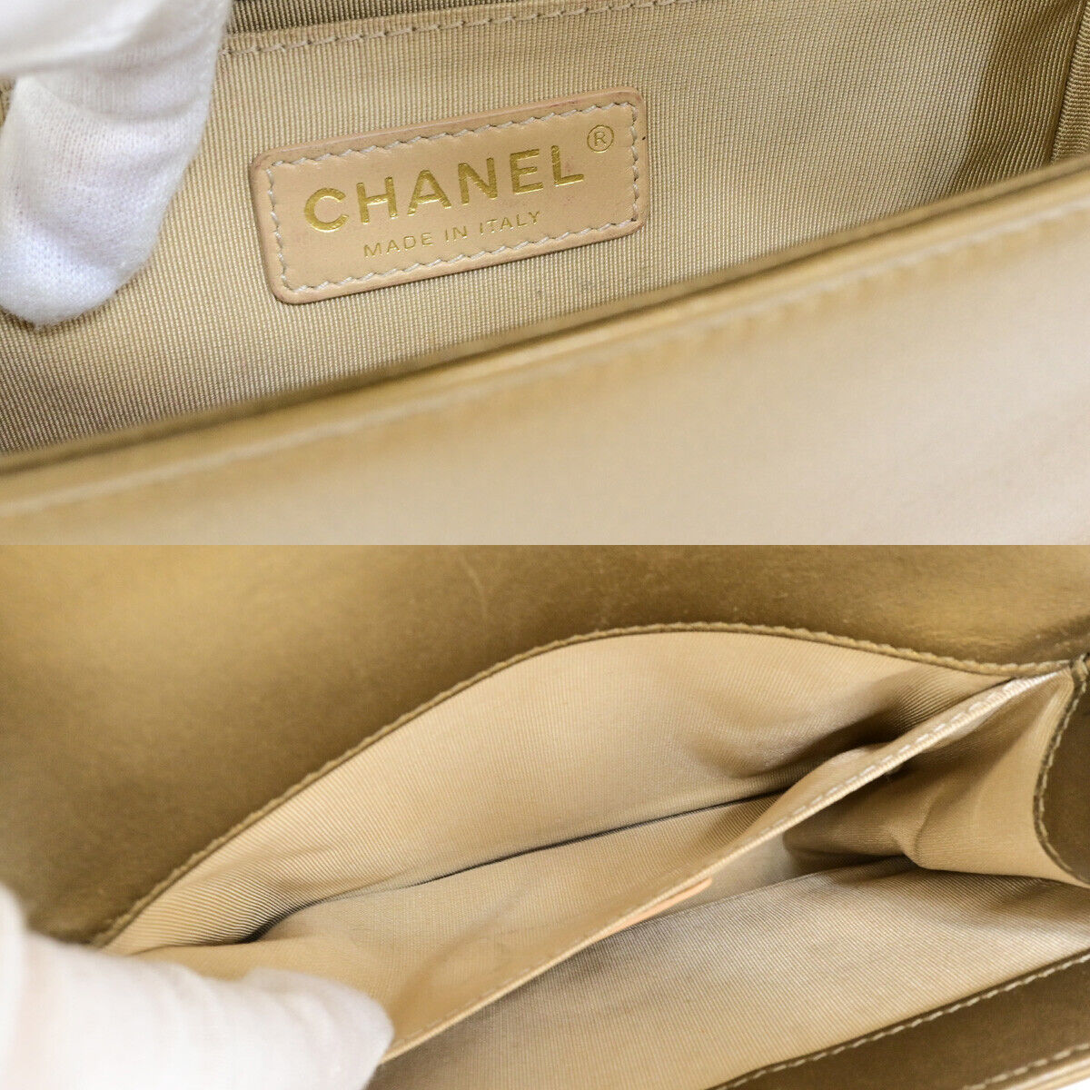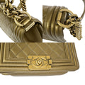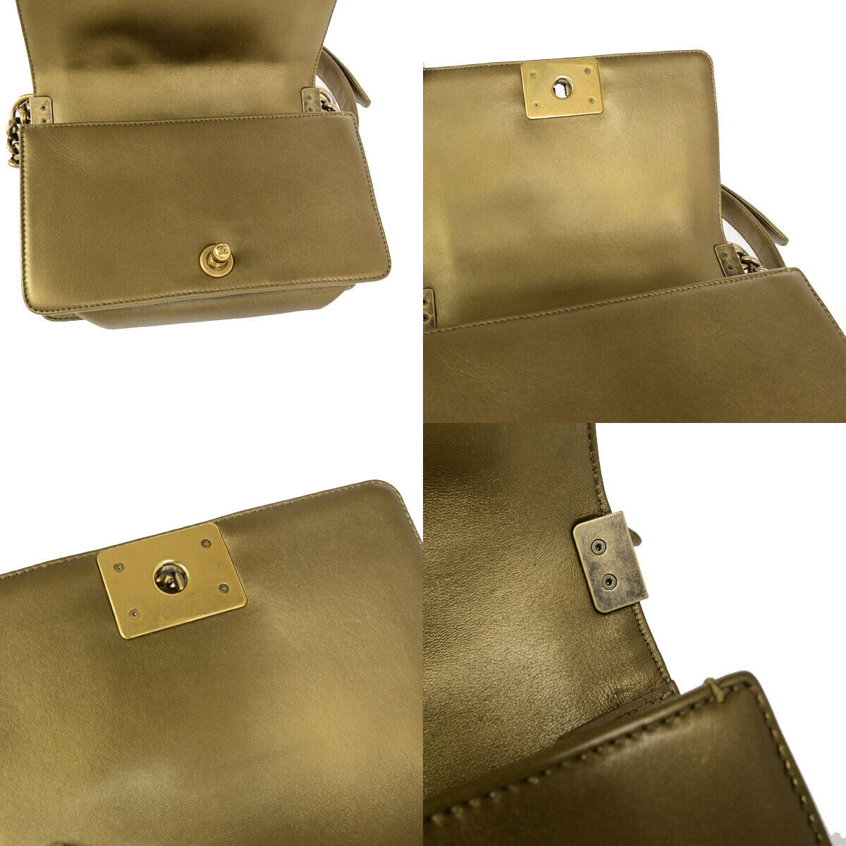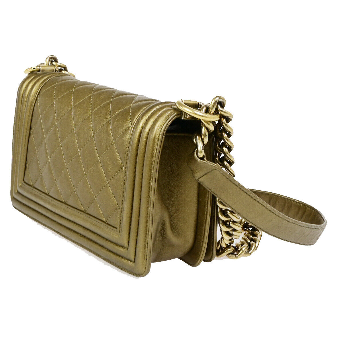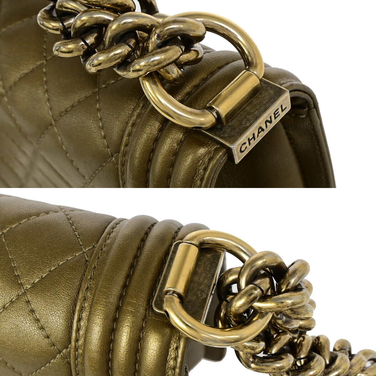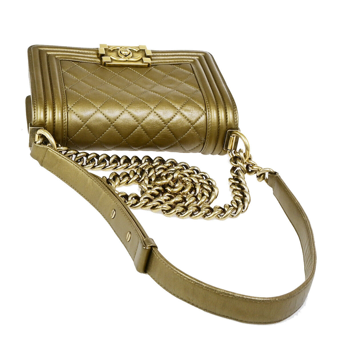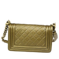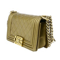 Elevate your style with the Chanel CC Logo Boy Chain Mini Shoulder Bag. Crafted in luxurious bronze leather with gold-tone hardware, this iconic piece exudes sophistication. Made in Italy, the bag features the signature CC logo and a versatile chain strap for a chic look.