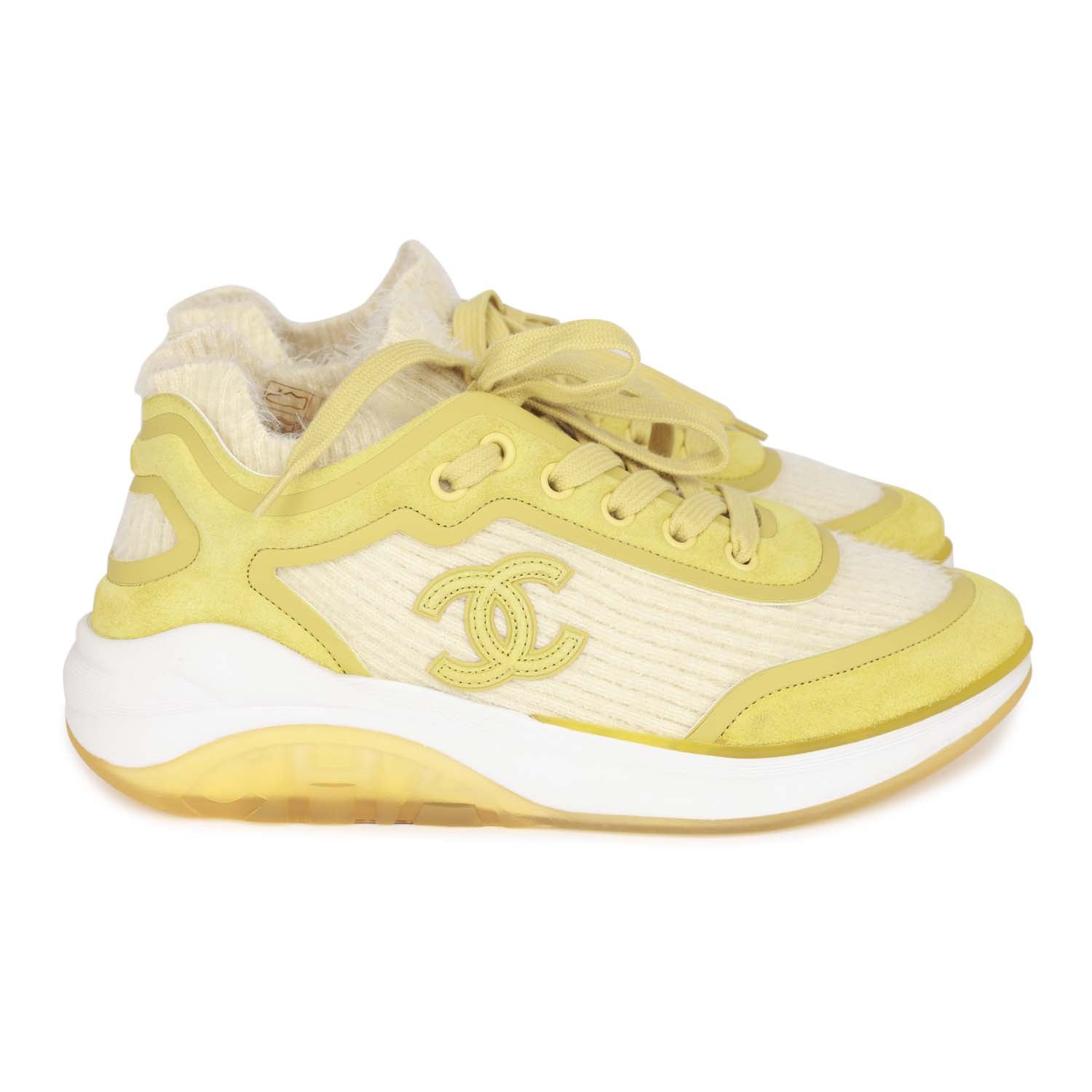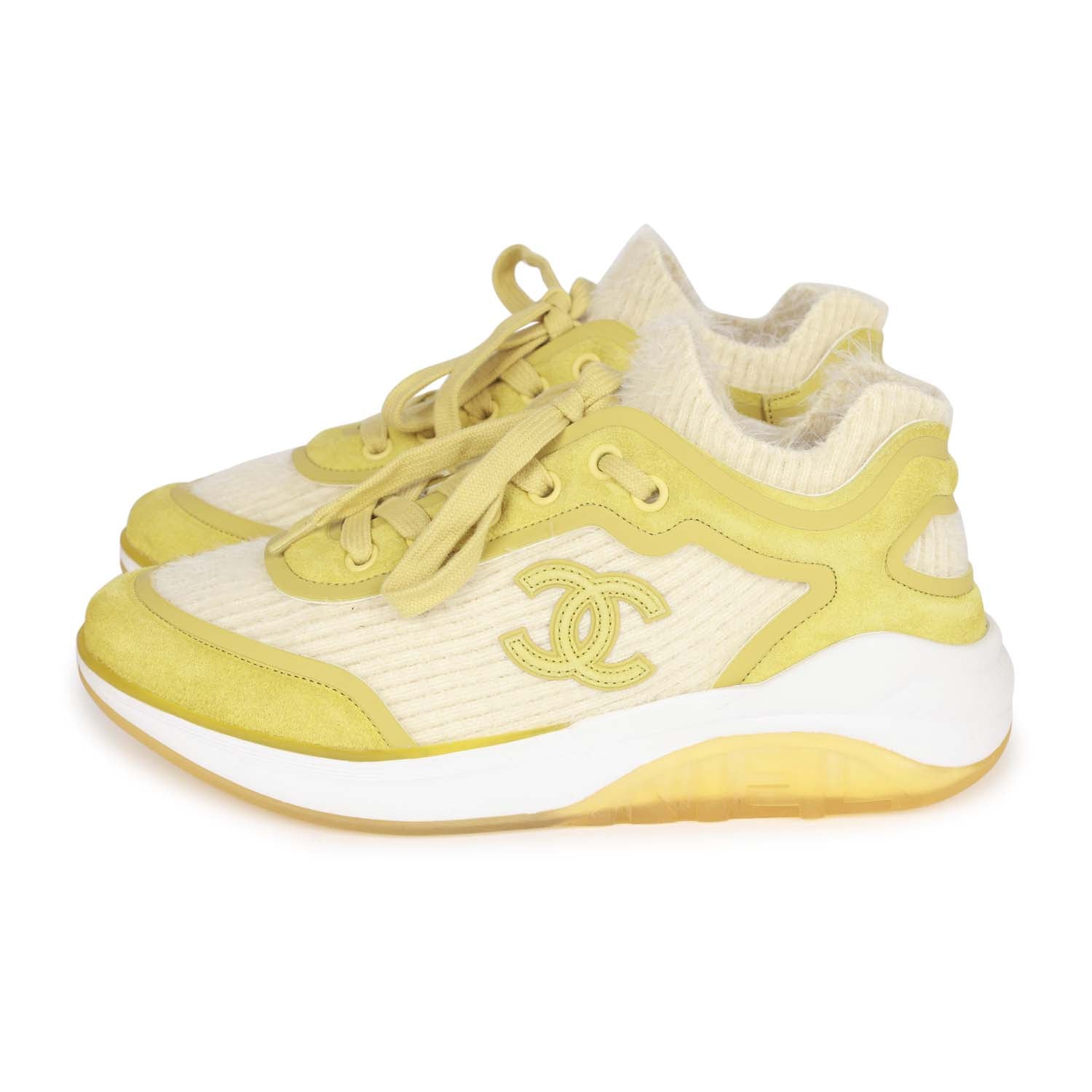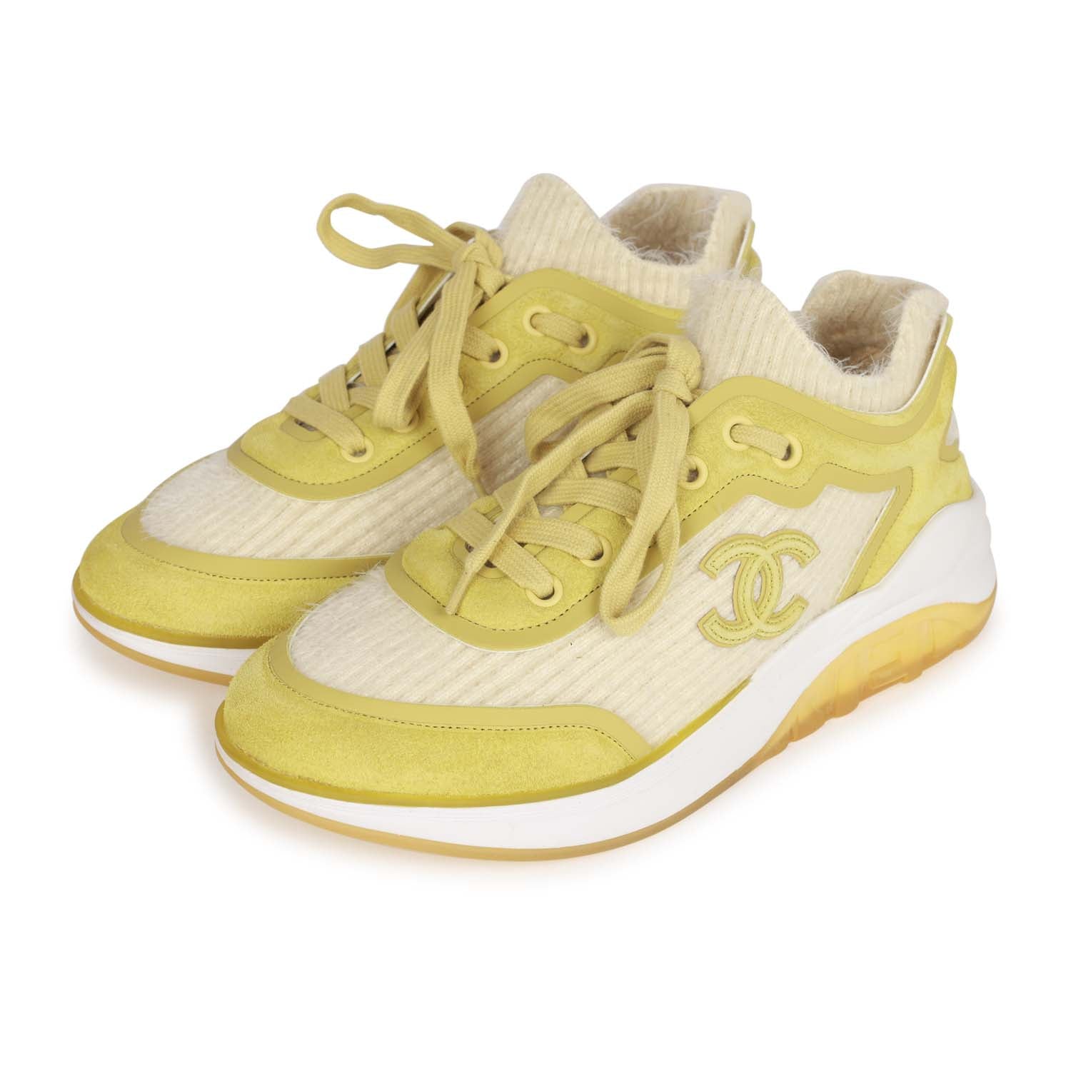 Chanel CC Lowtop Sneakers Off-White Knit and Light Green Suede 35