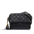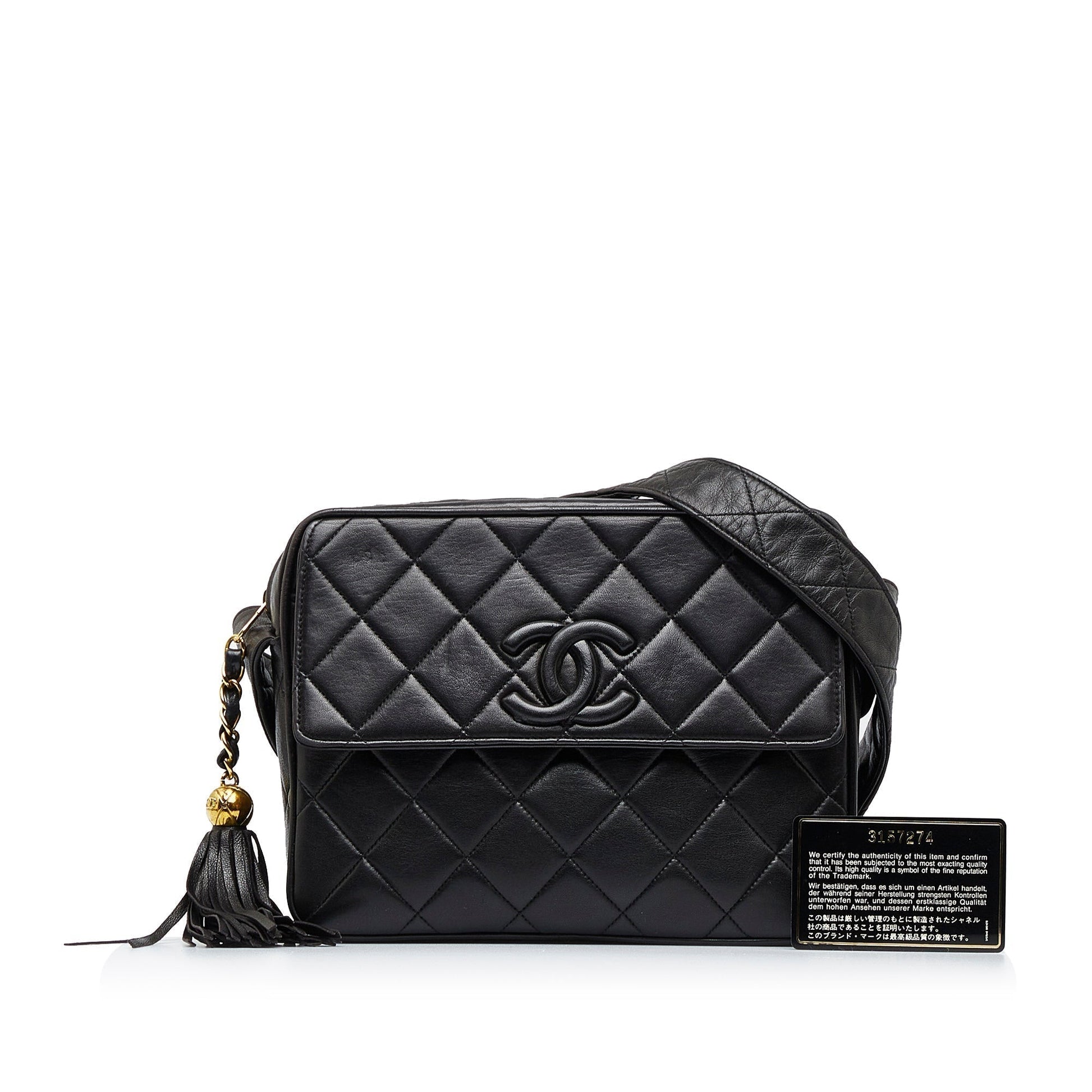 This crossbody Bag features a quilted leather body, a flat leather shoulder strap, a tassel, a top zip closure, an exterior flap pocket, and interior zip and slip pockets. Comes with .