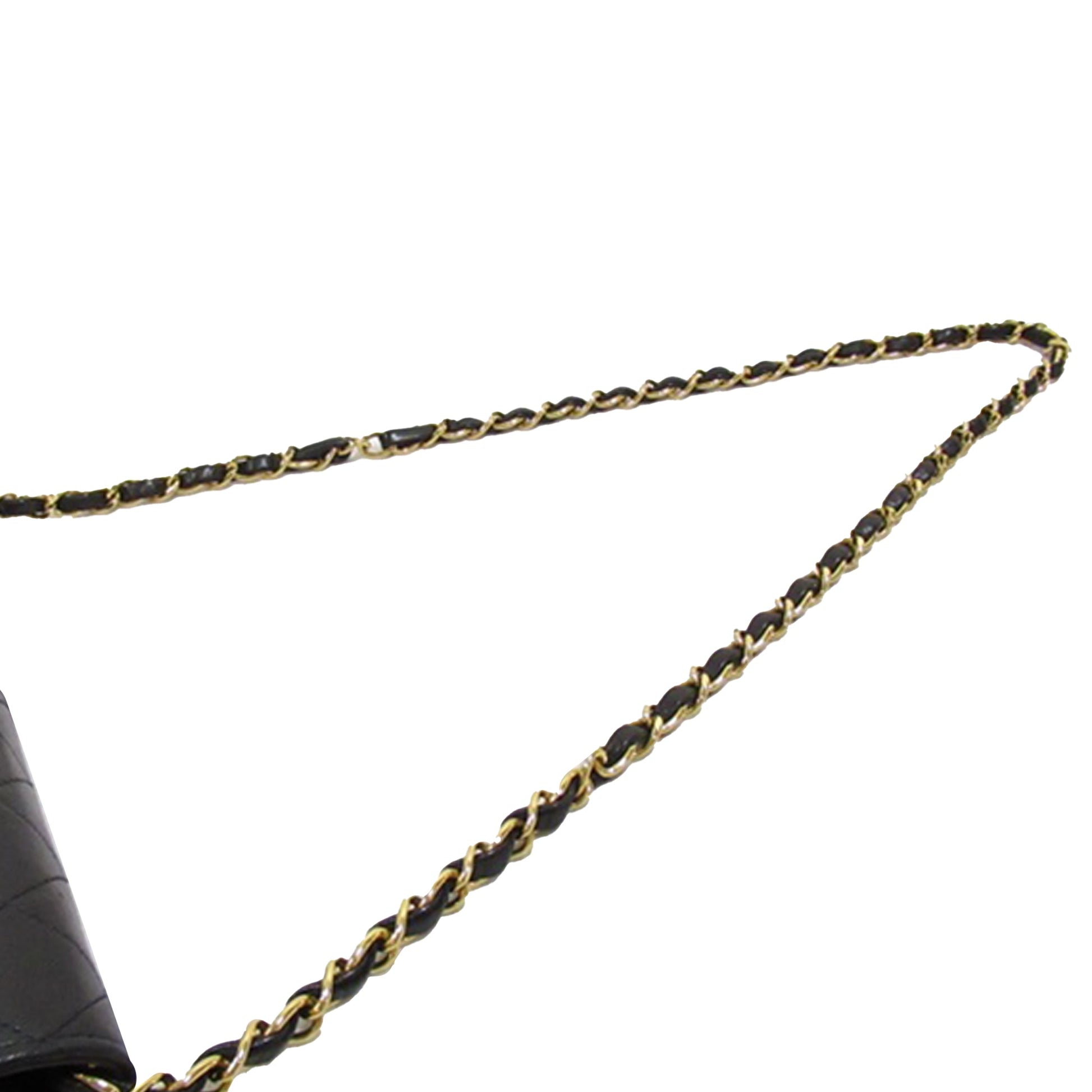 This crossbody Bag features a quilted lambskin leather body, a leather woven chain strap, a front flap with snap button closure, and an interior zip pocket. Comes with ity card.