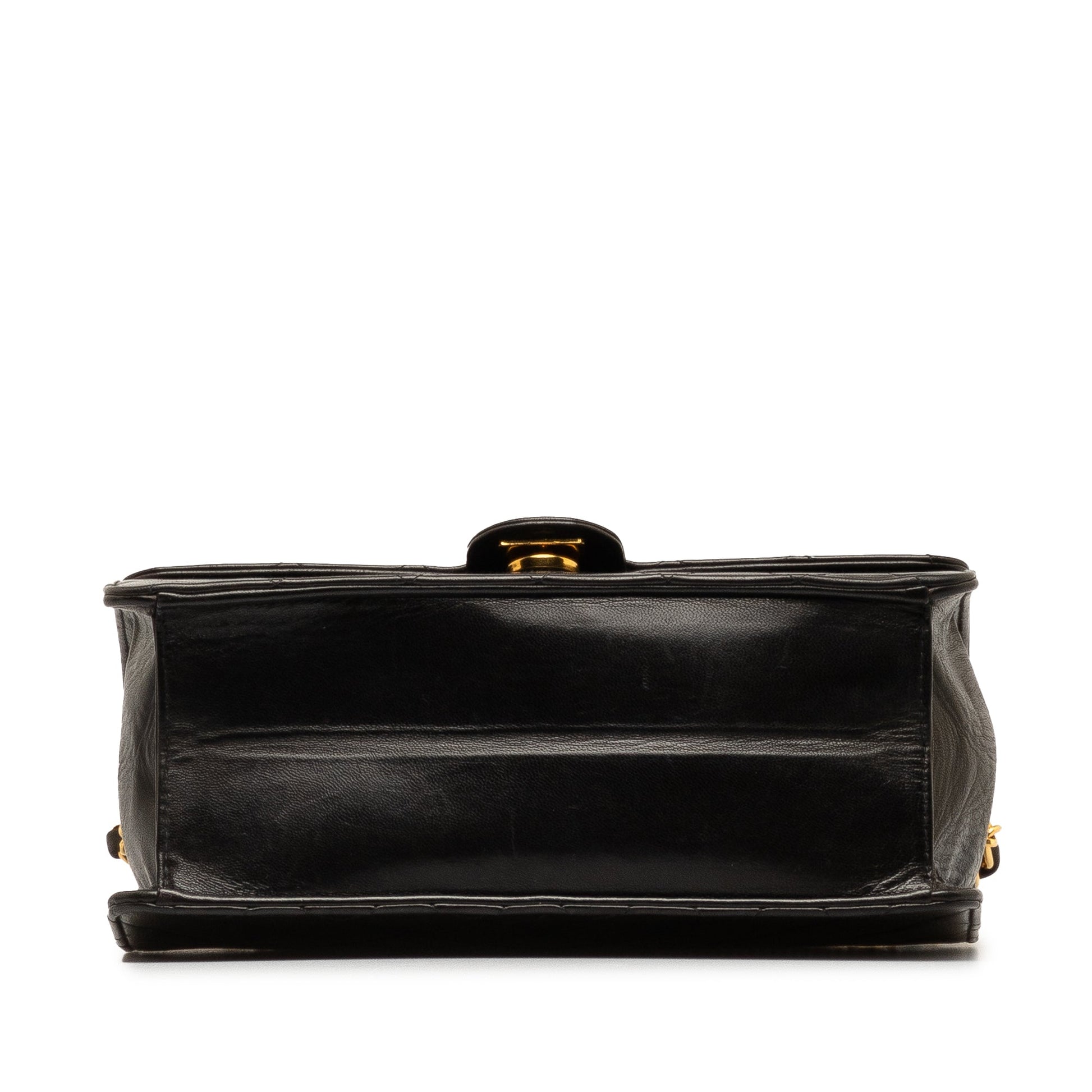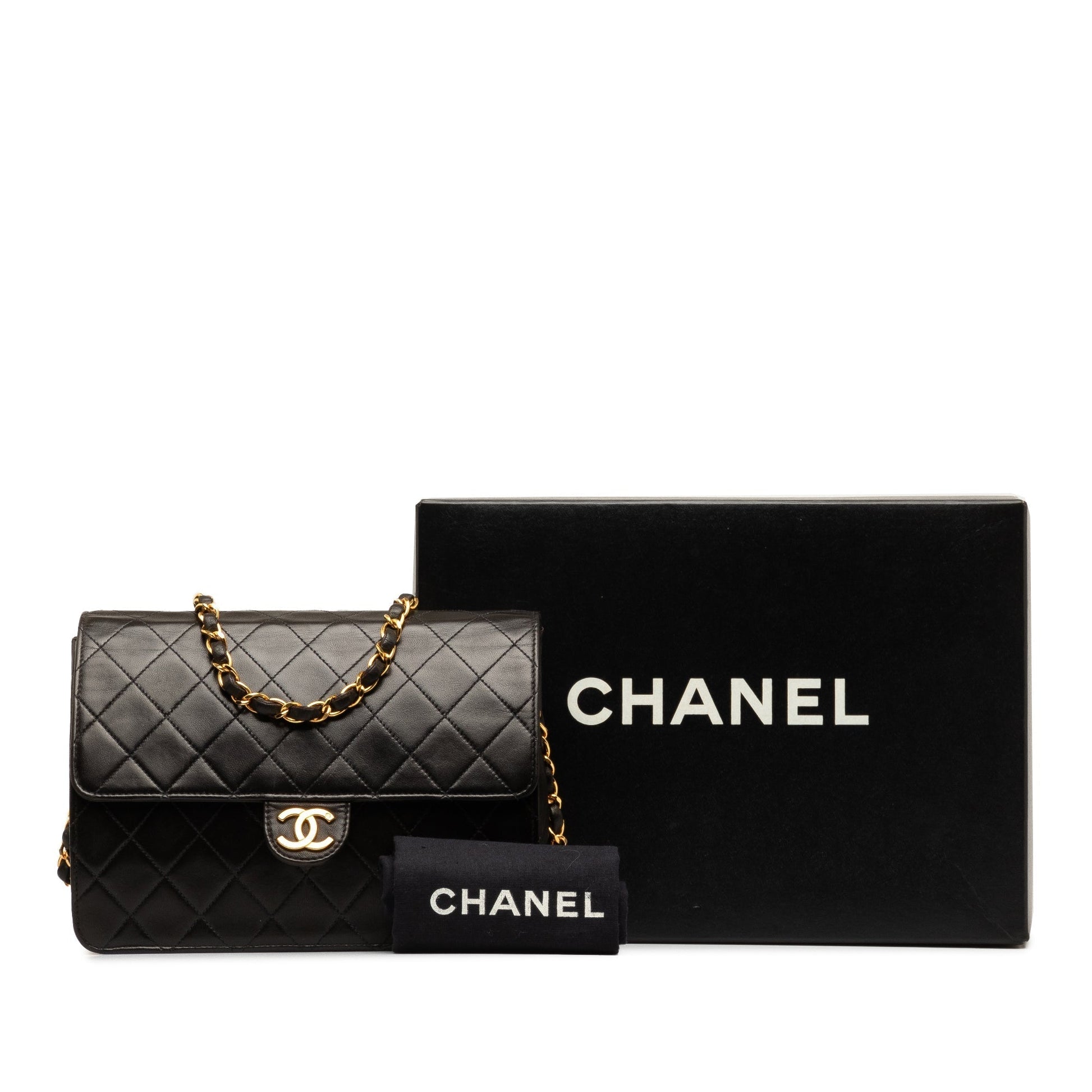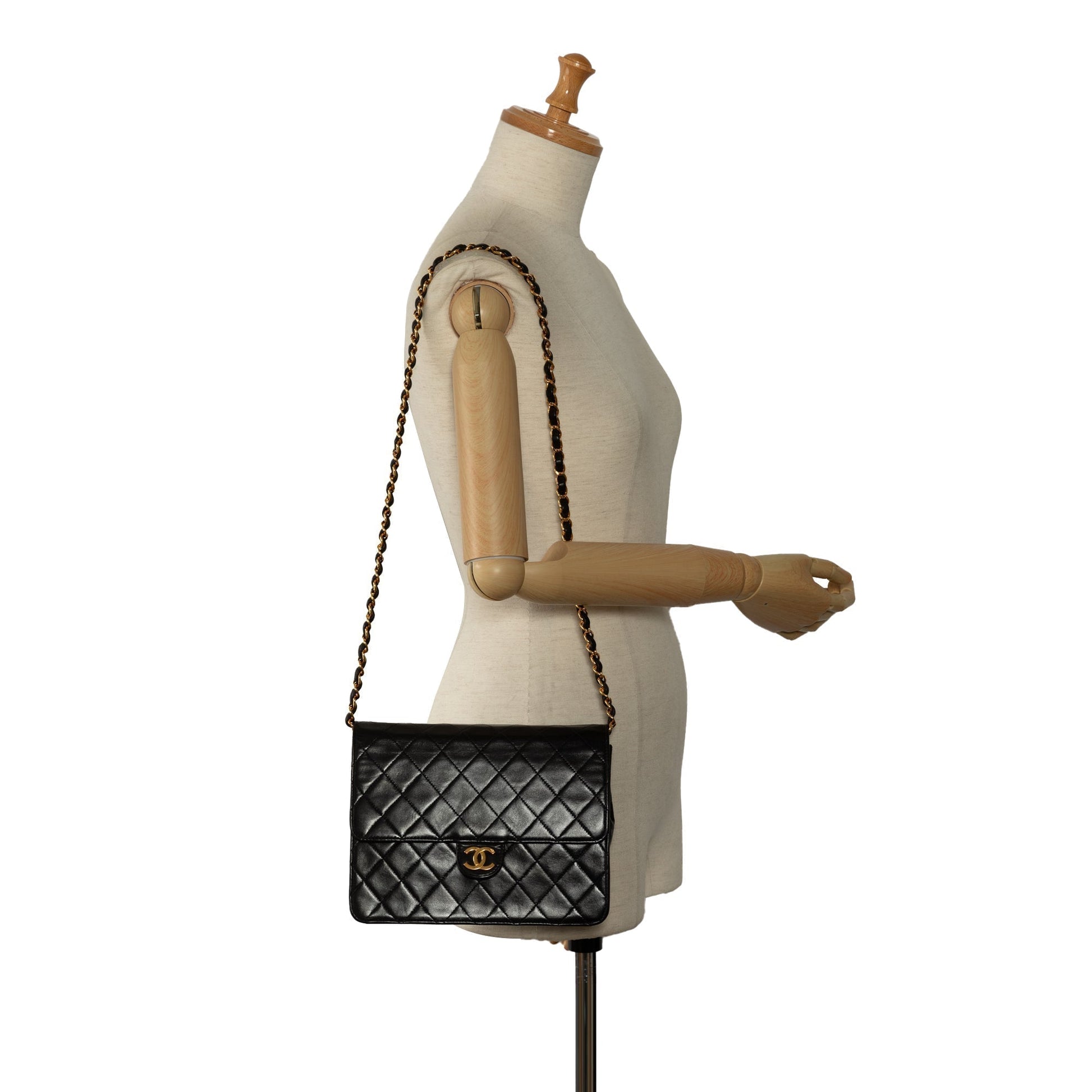 This shoulder Bag features a quilted lambskin leather body, a leather woven chain strap, a front flap with magnetic snap closure, and an interior zip pocket. Comes with box and dust Bag.