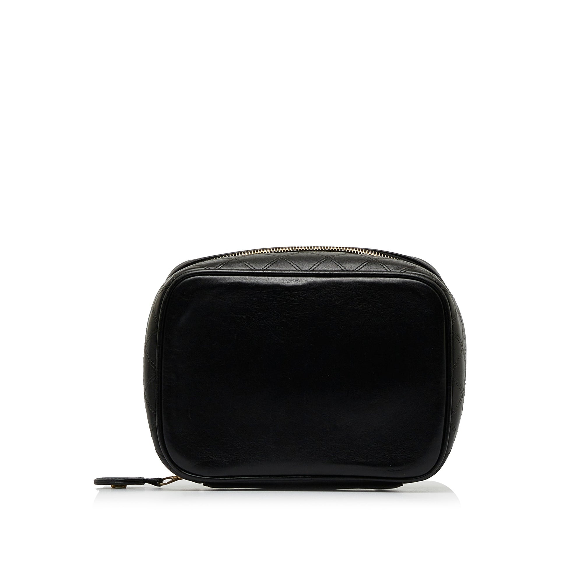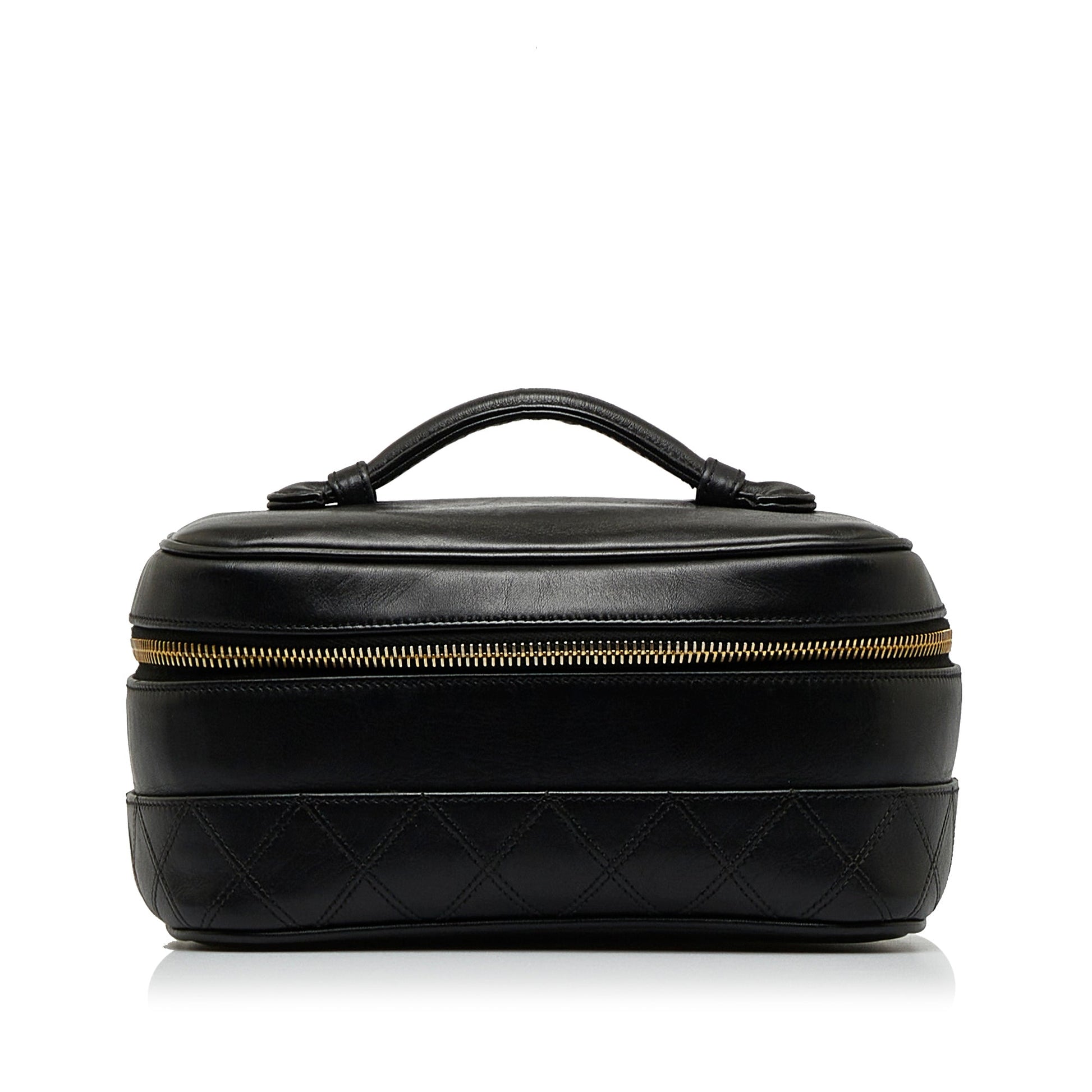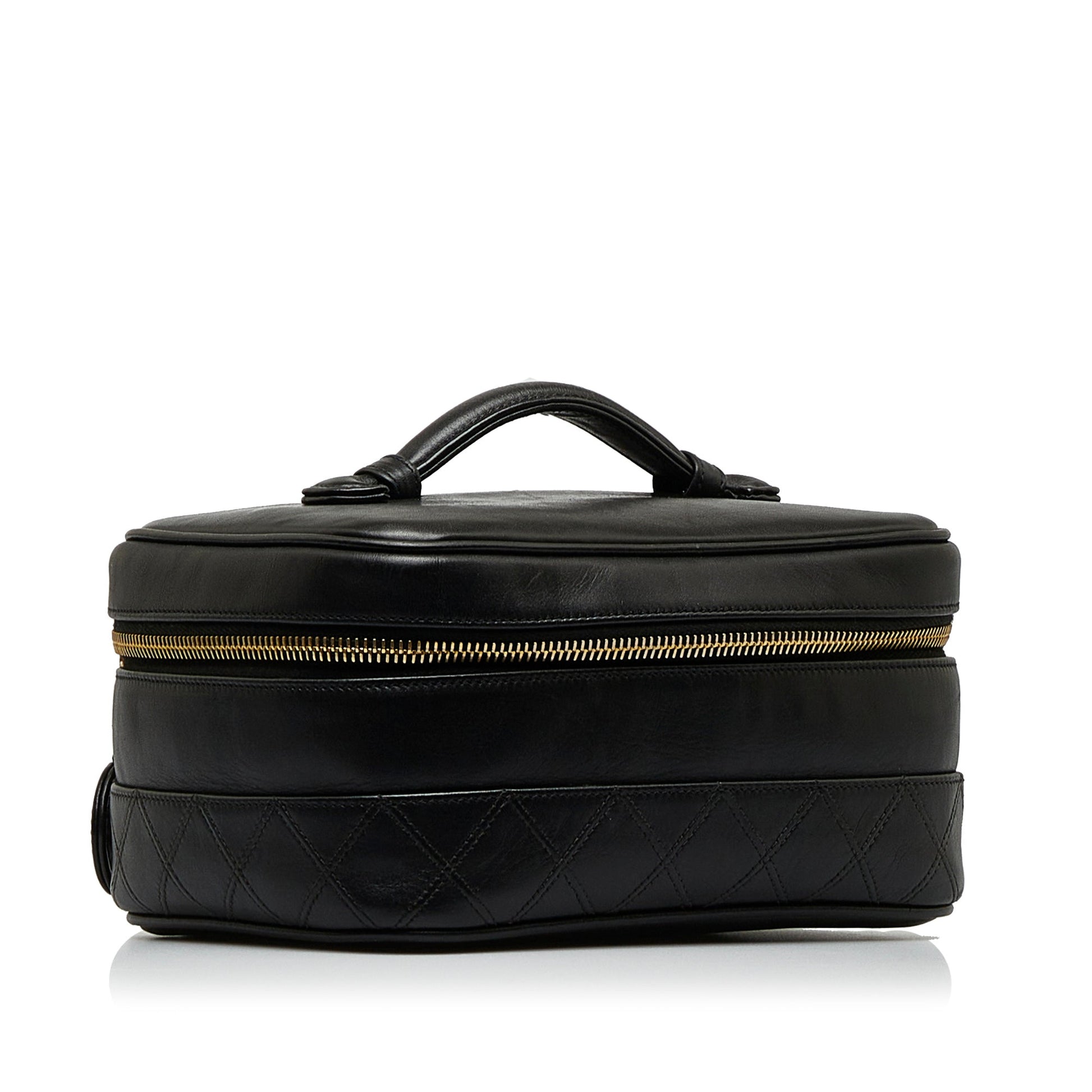 This vanity Bag features a lambskin leather body, a quilted bottom, a top handle, a top zip closure and an interior slip pocket.