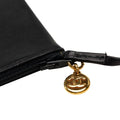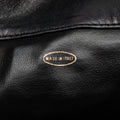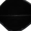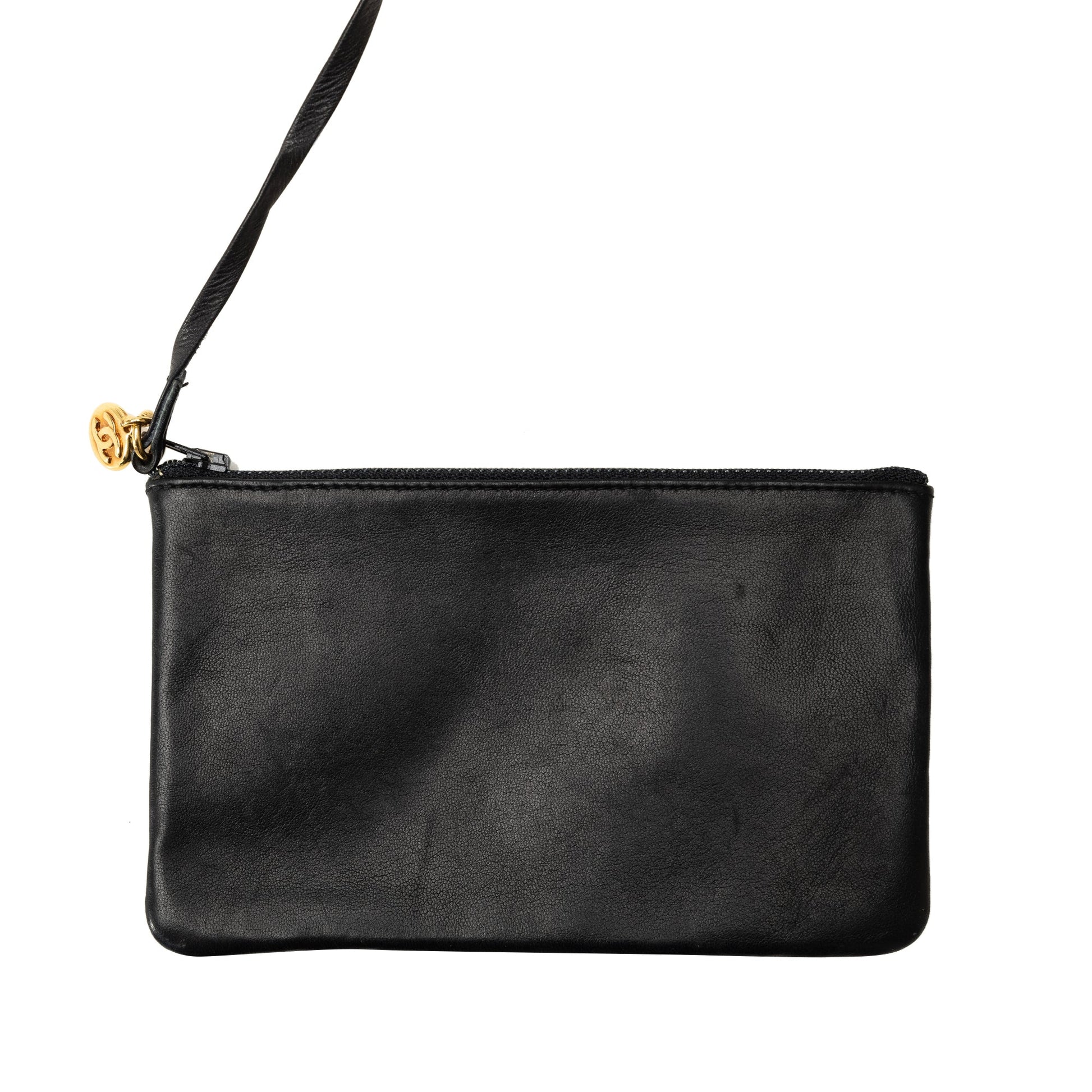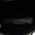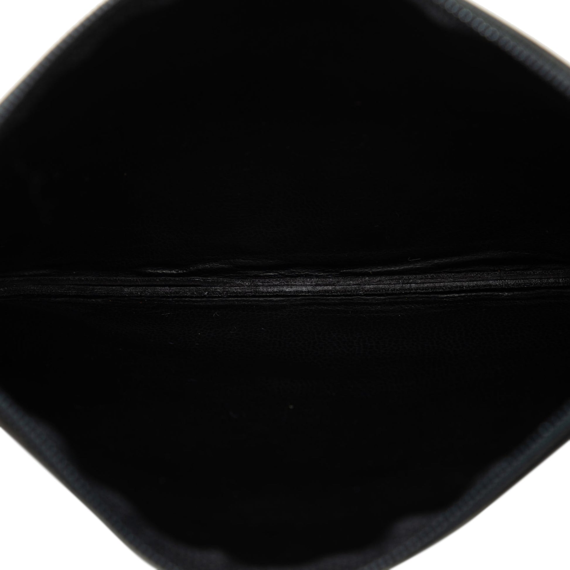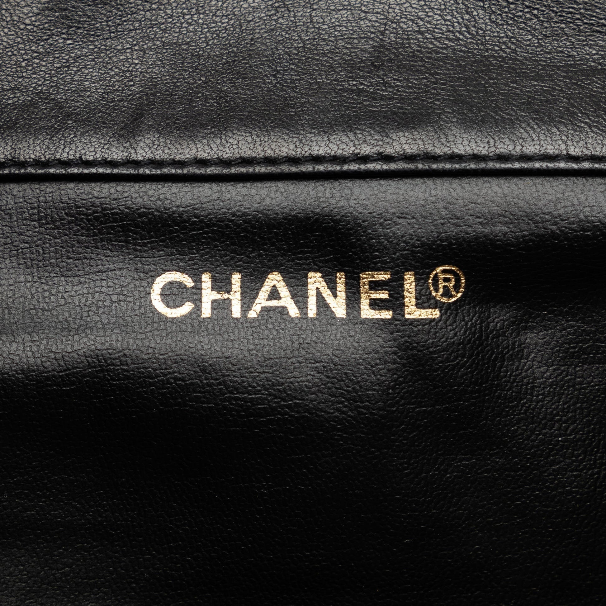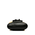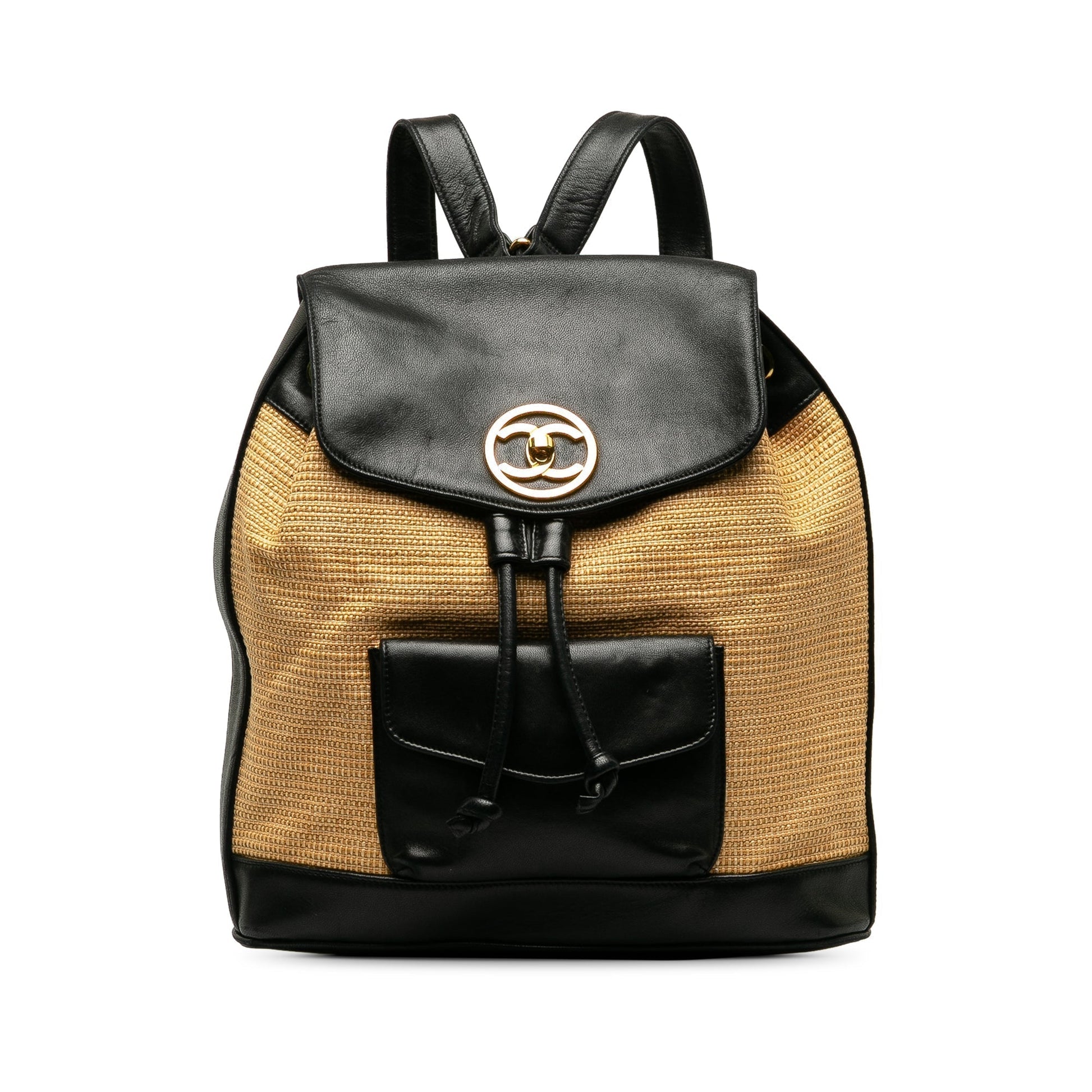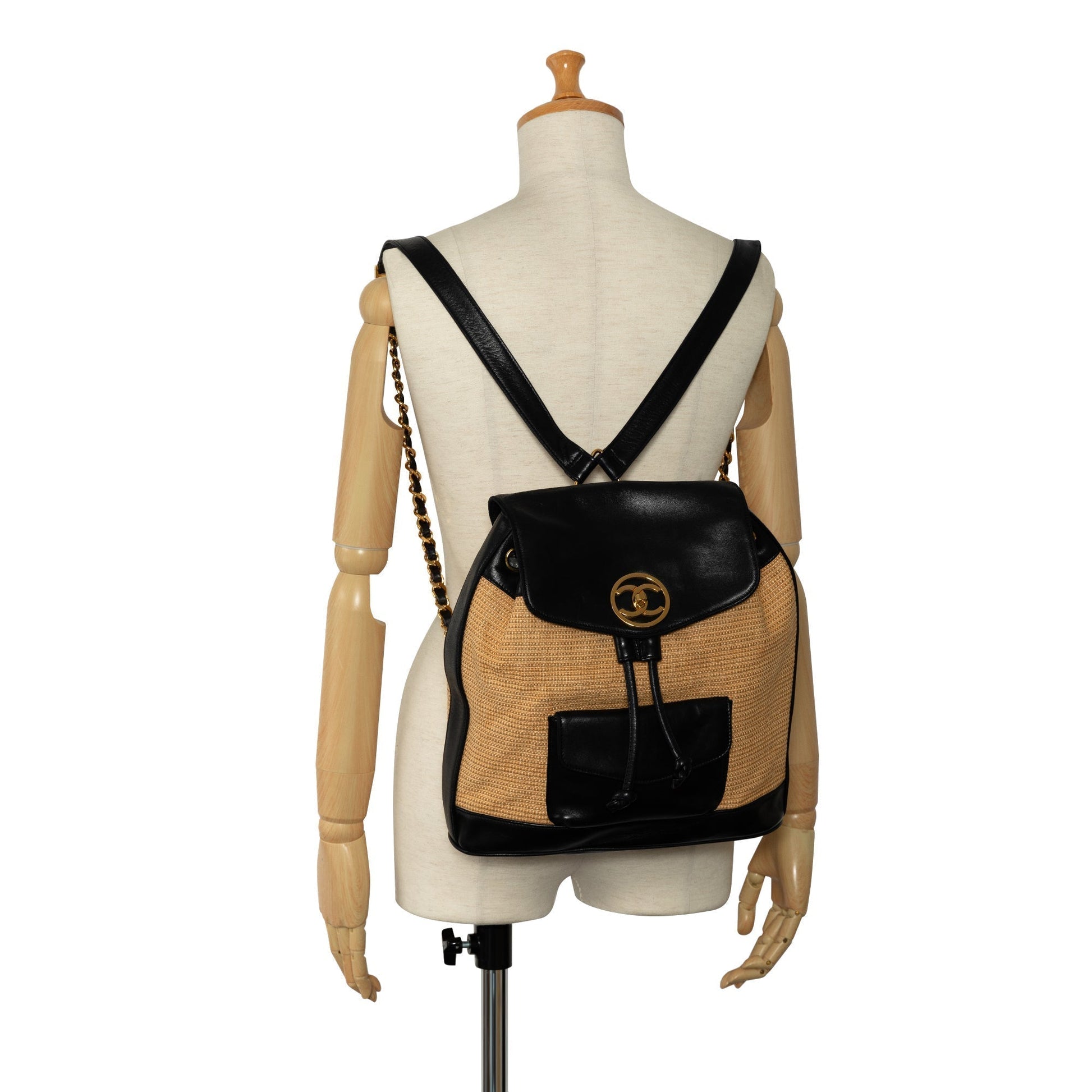 This backpack features a raffia body with leather trim, flat leather and chain back straps, a top flap with drawstring closure, an exterior front flap pocket, and a pouch inclusion.