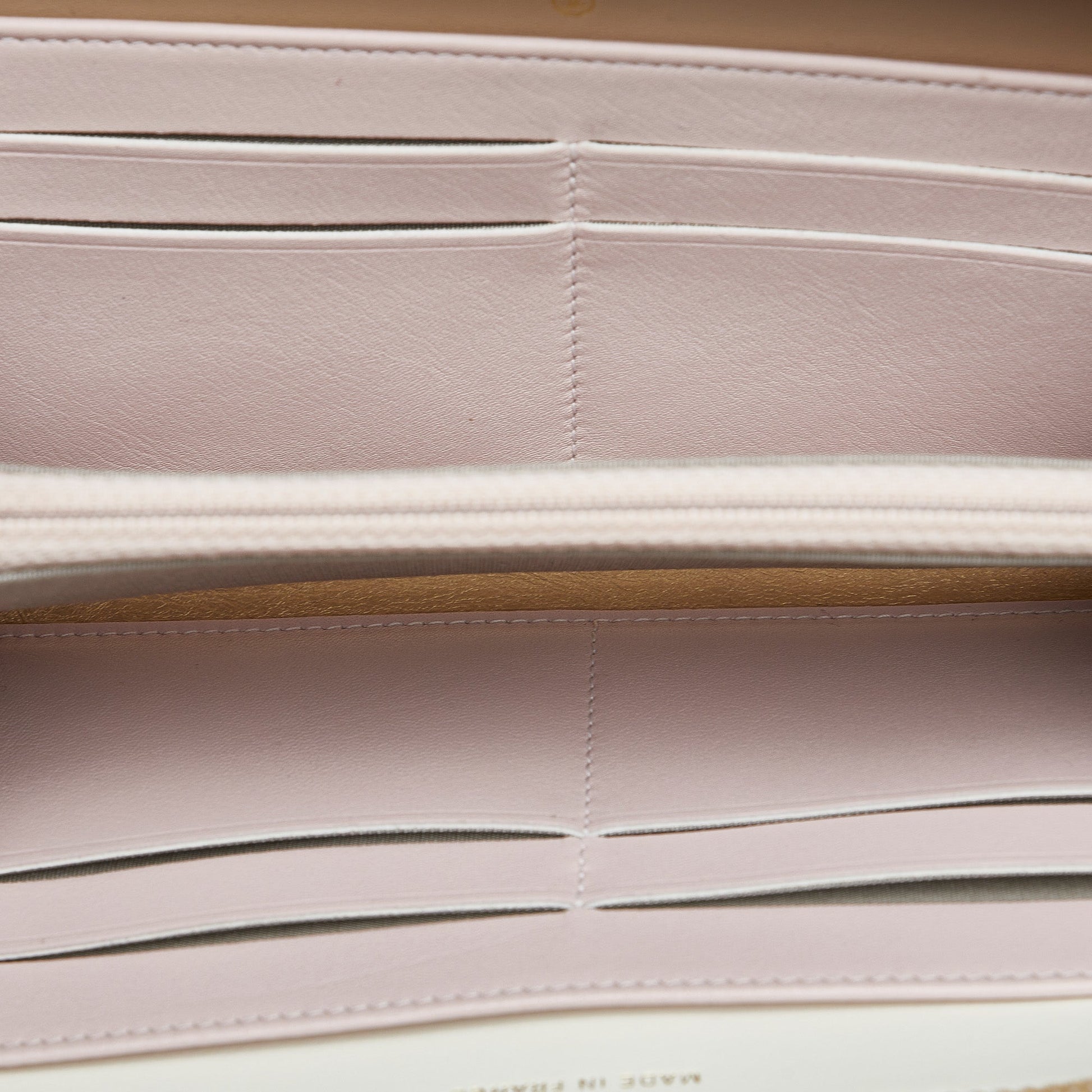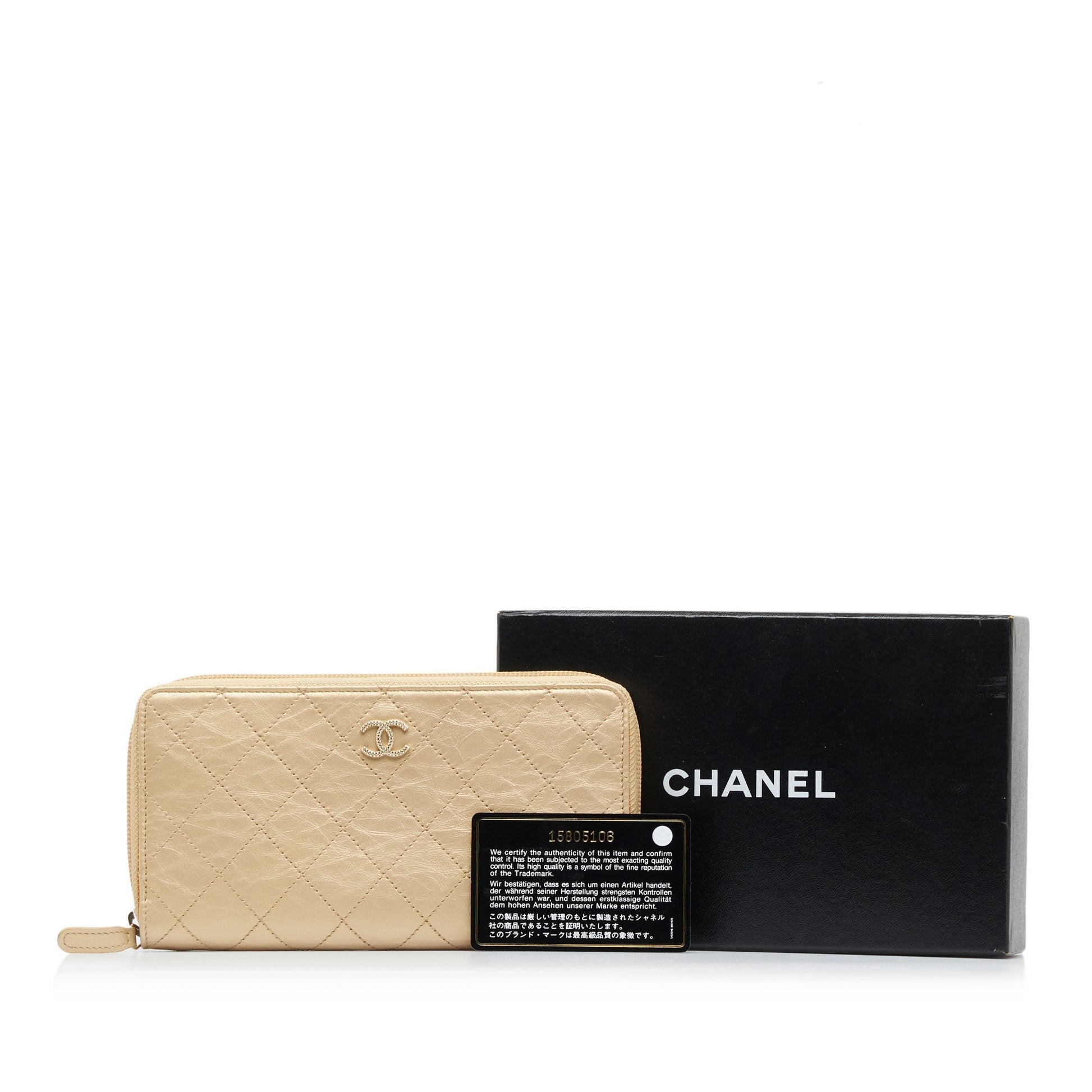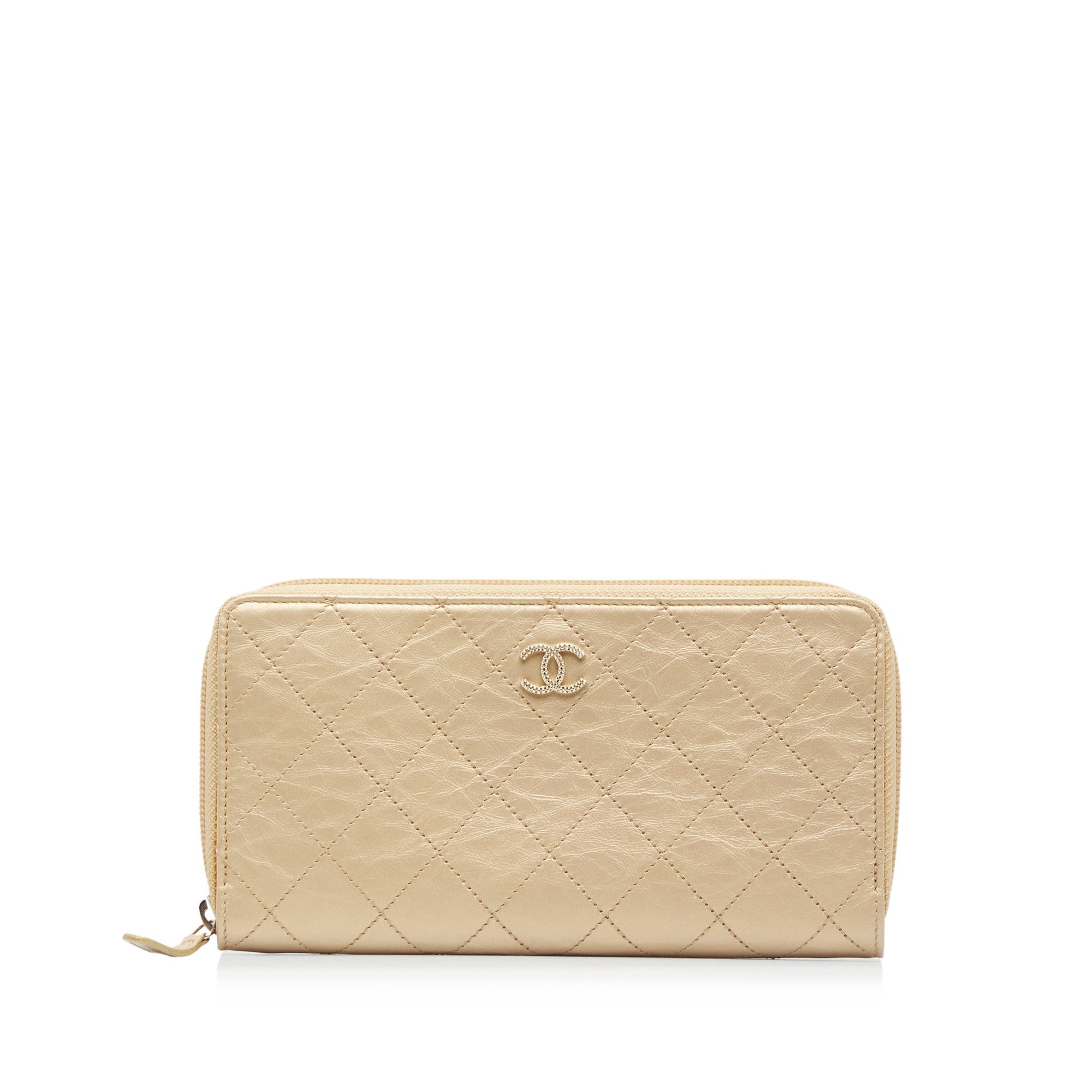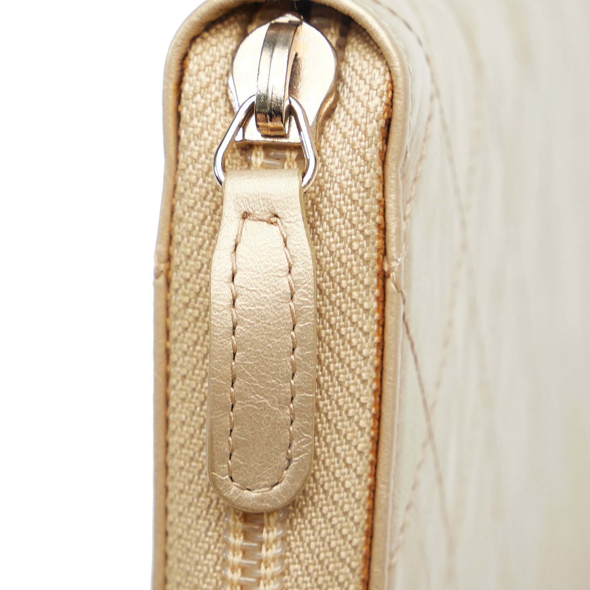This long wallet features a quilted leather body, a zip-around closure, and interior zip and slip pockets. Comes with and box.