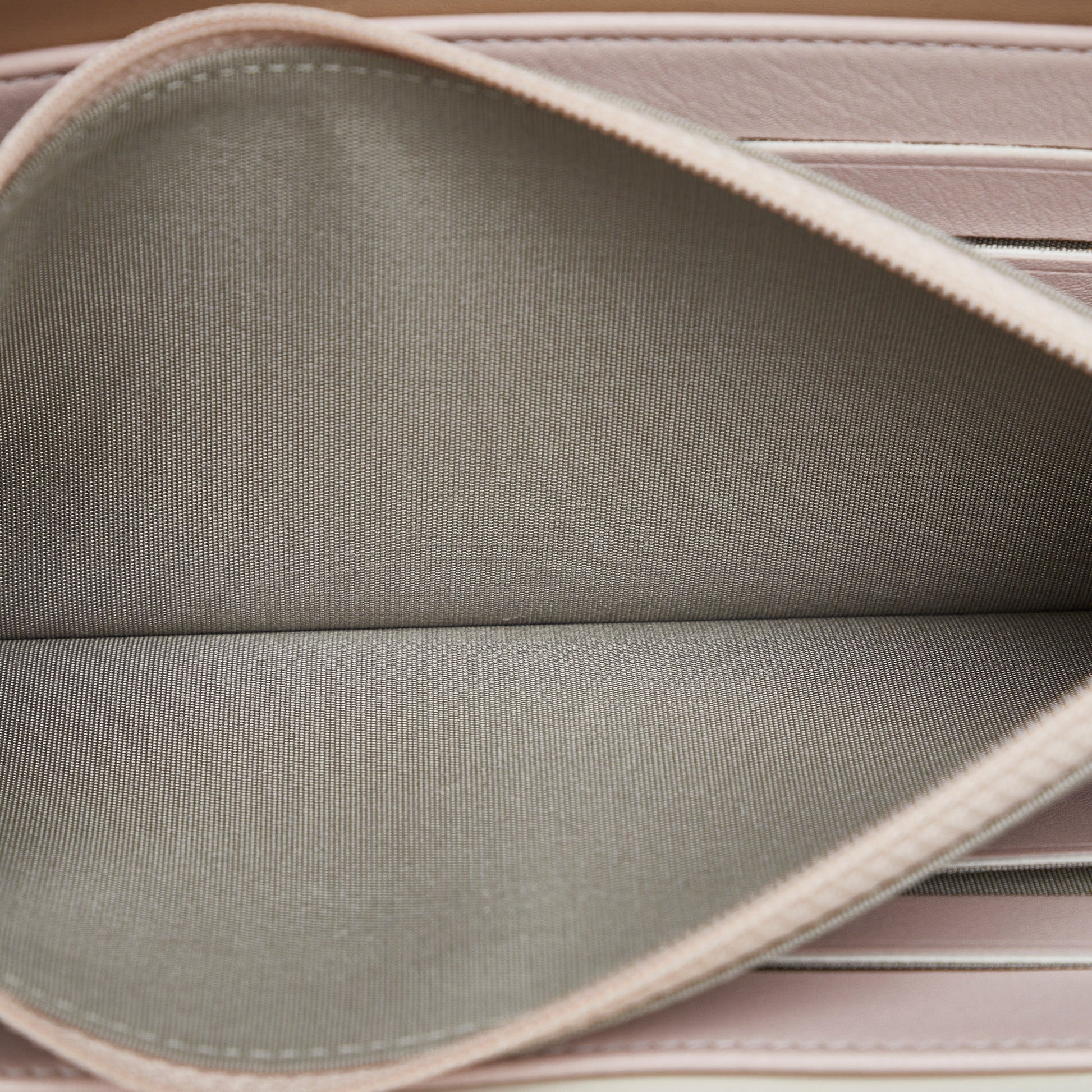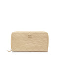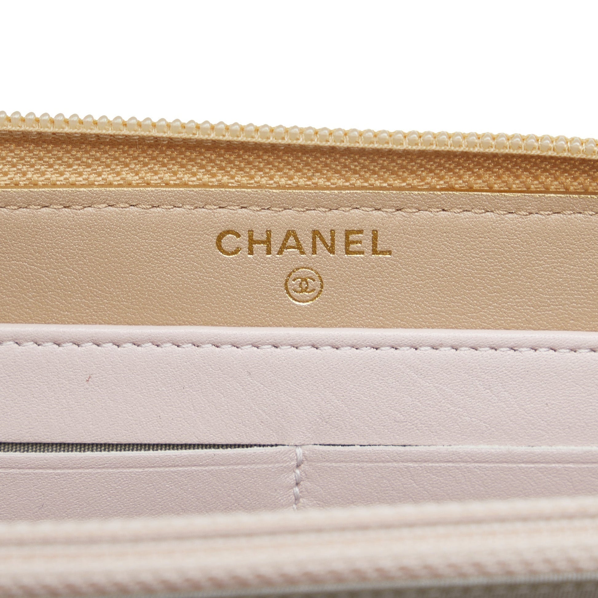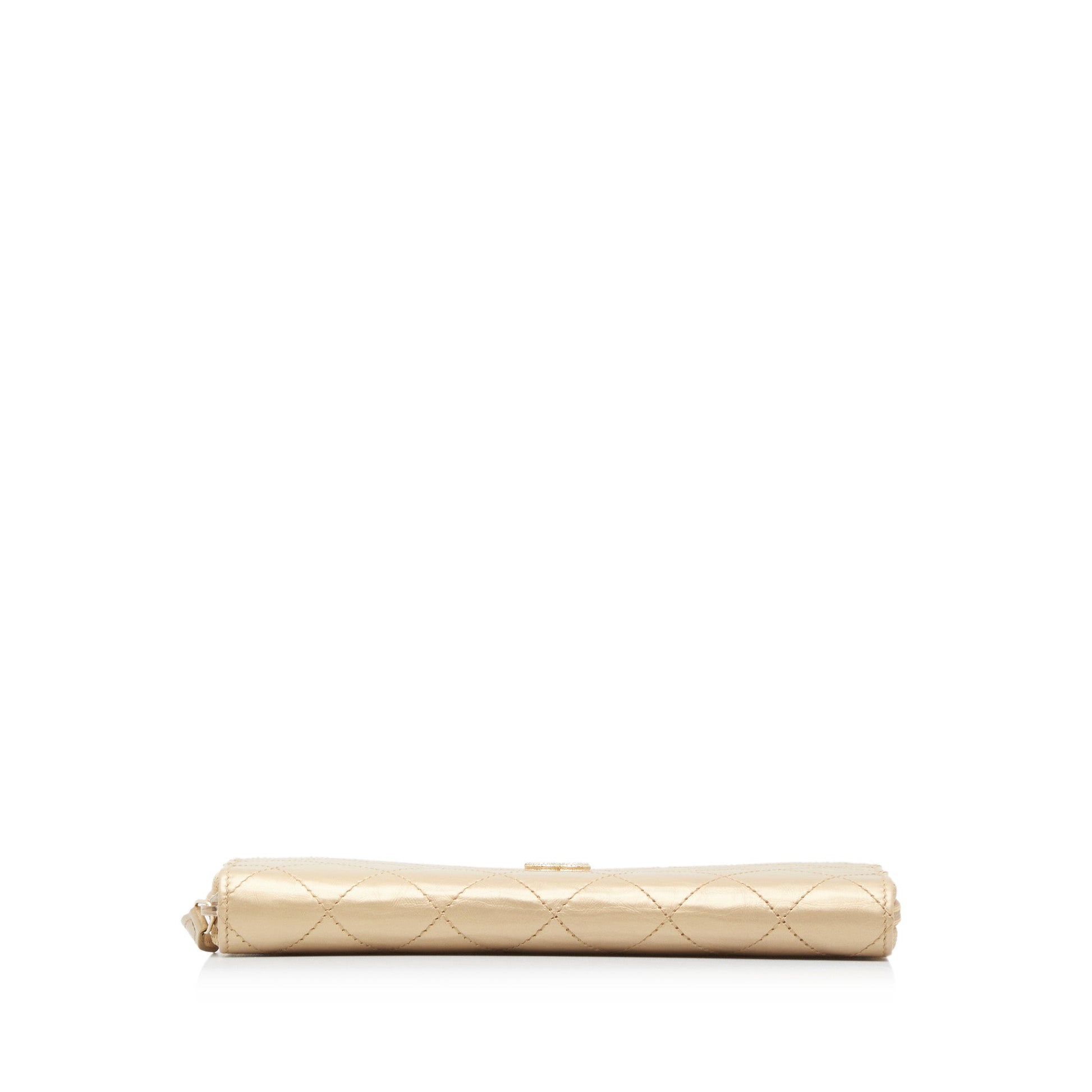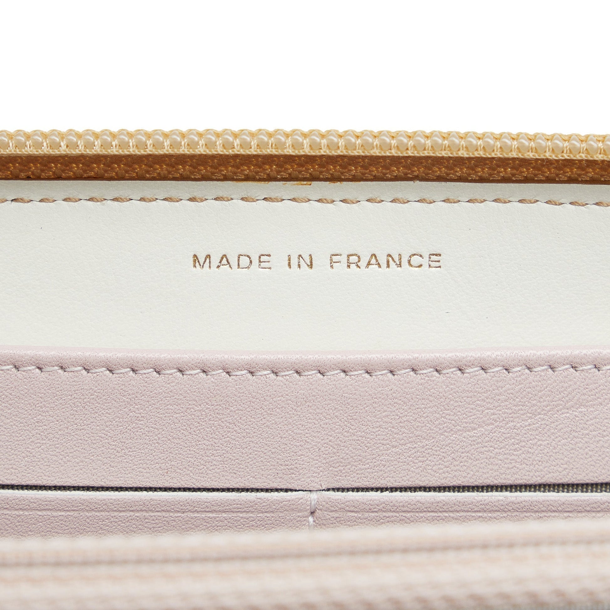This long wallet features a quilted leather body, a zip-around closure, and interior zip and slip pockets. Comes with and box.