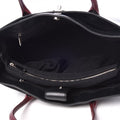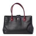 This is a stylish tote crafted of calfskin leather in black. The bag features tall rolled burgundy leather top handles, a rear-facing pocket, and a deep front-facing pocket with a polished silver CC turn lock.