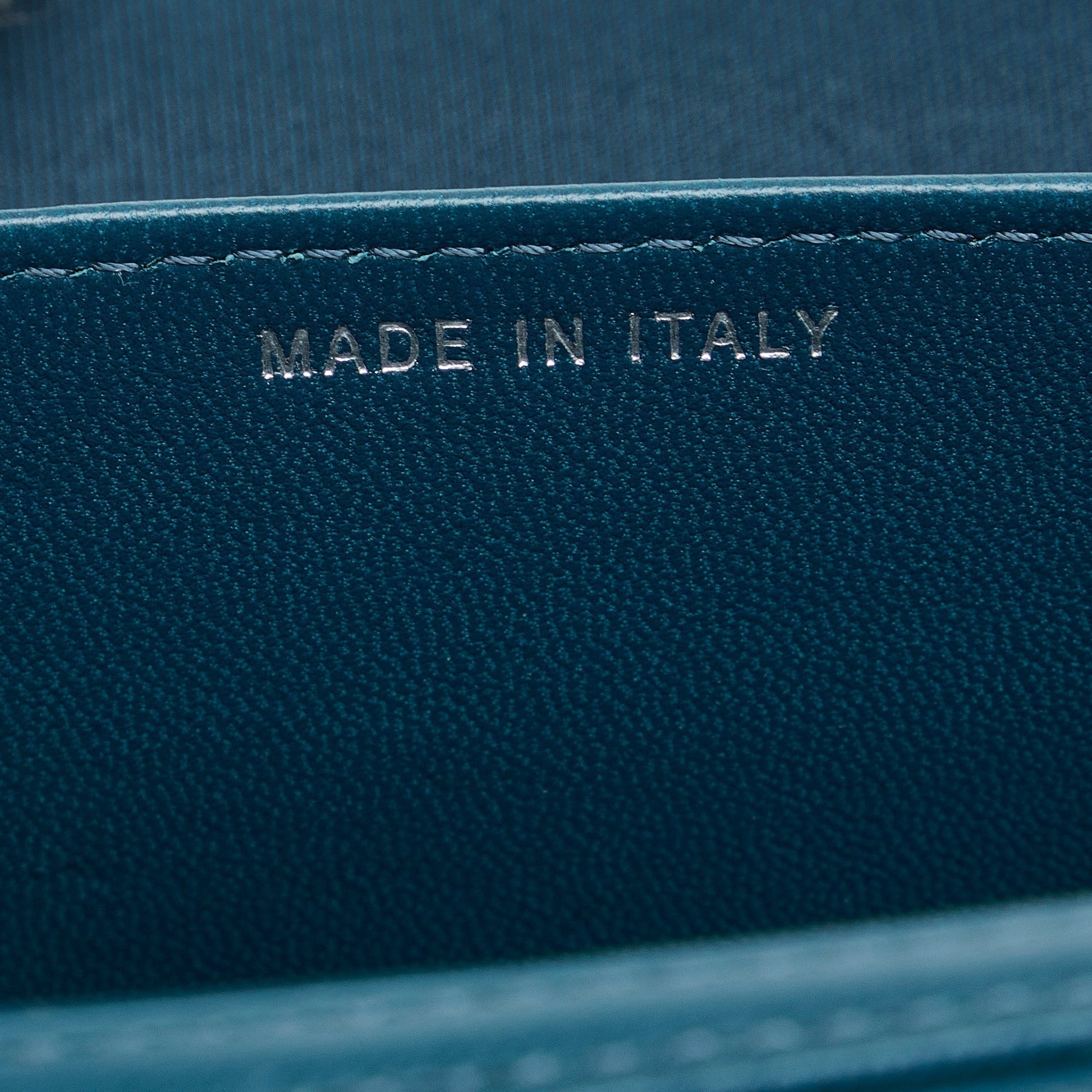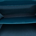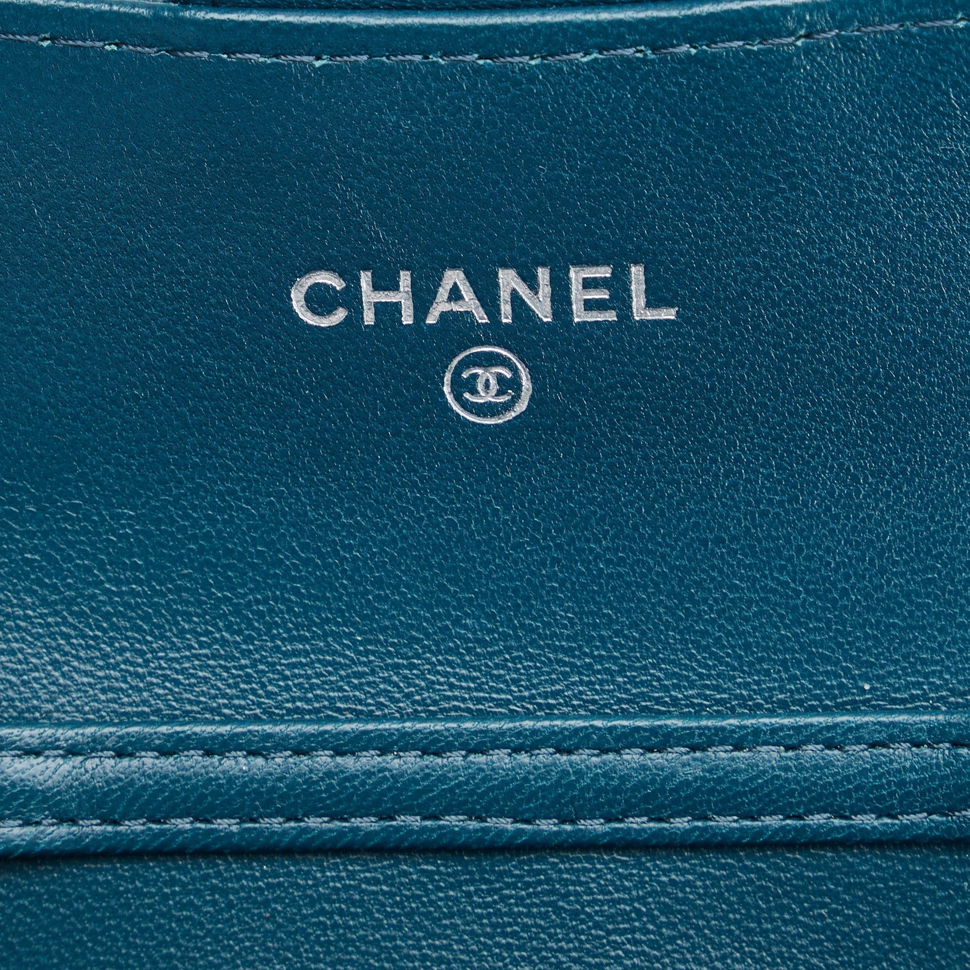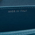 This wallet on chain features a lambskin leather body, leather woven chain strap, exterior back slip pocket, front flap with magnetic closure, and interior slip compartments.