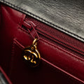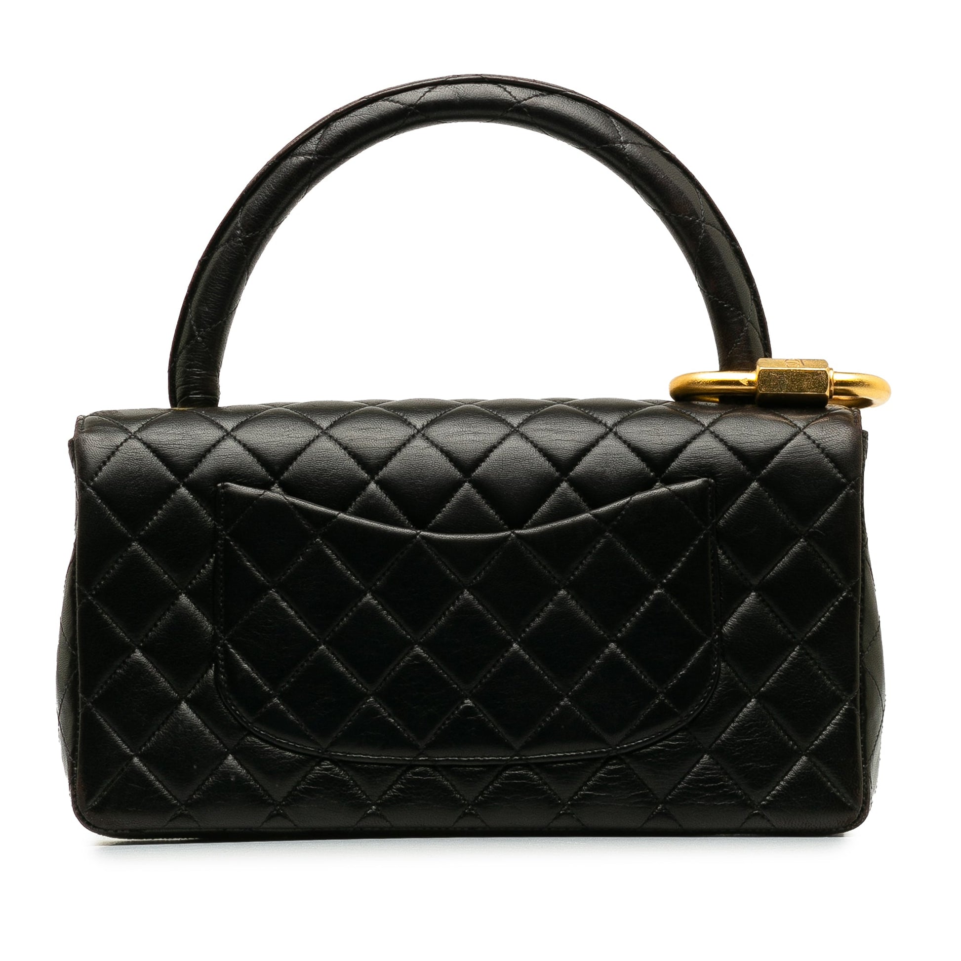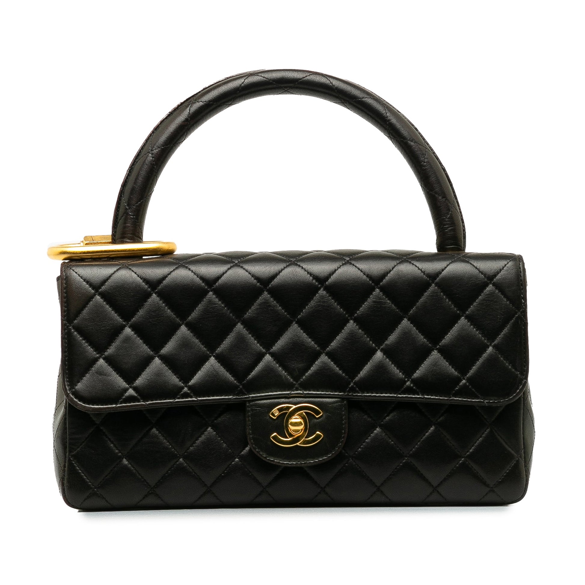 The Kelly handBag features a lambskin leather body, a rolled leather top handle, a front flap with a twist lock closure, an exterior back slip pocket, and interior zip and slip pockets.
