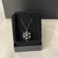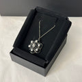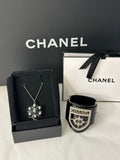 Sublime collier Chanel forme camélia avec perles grises et logo CC au milieu.