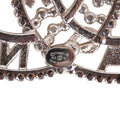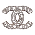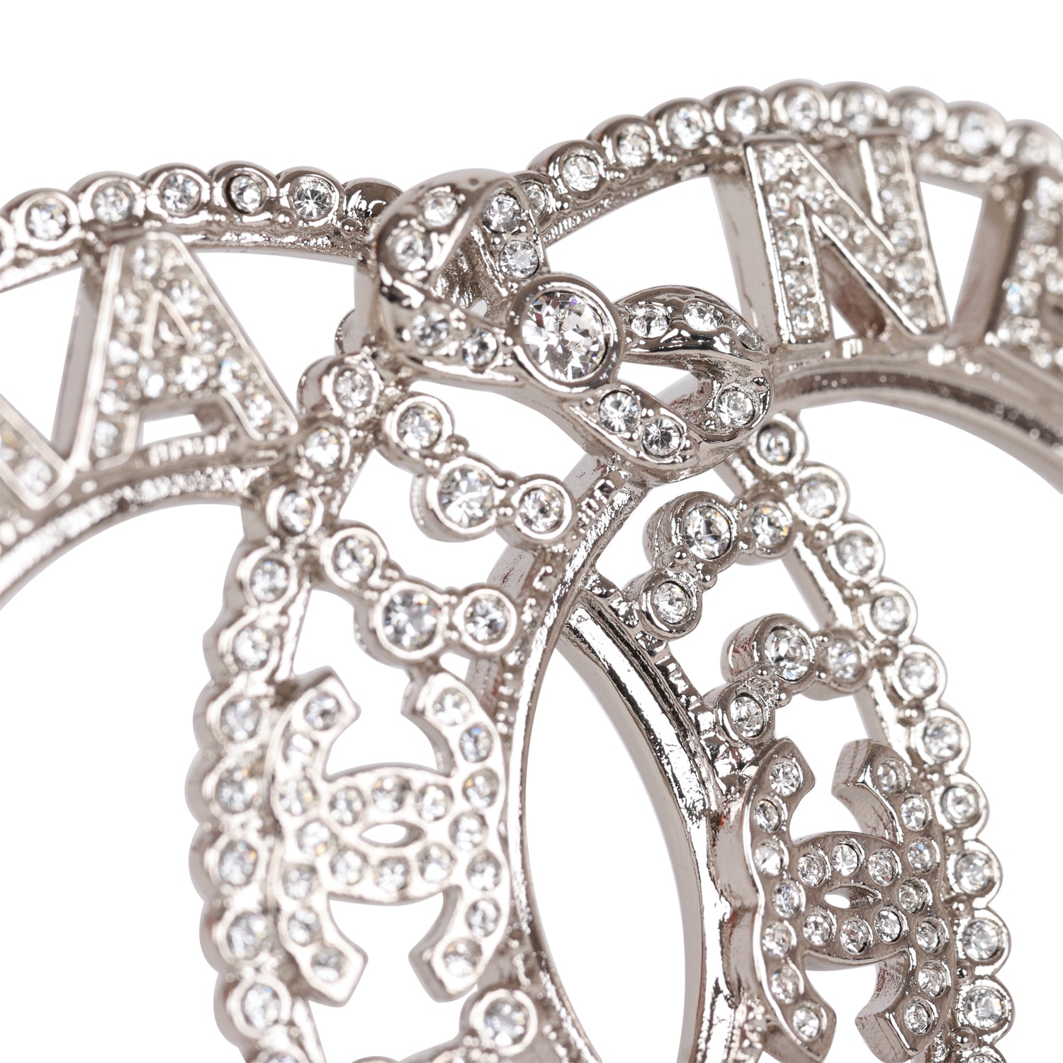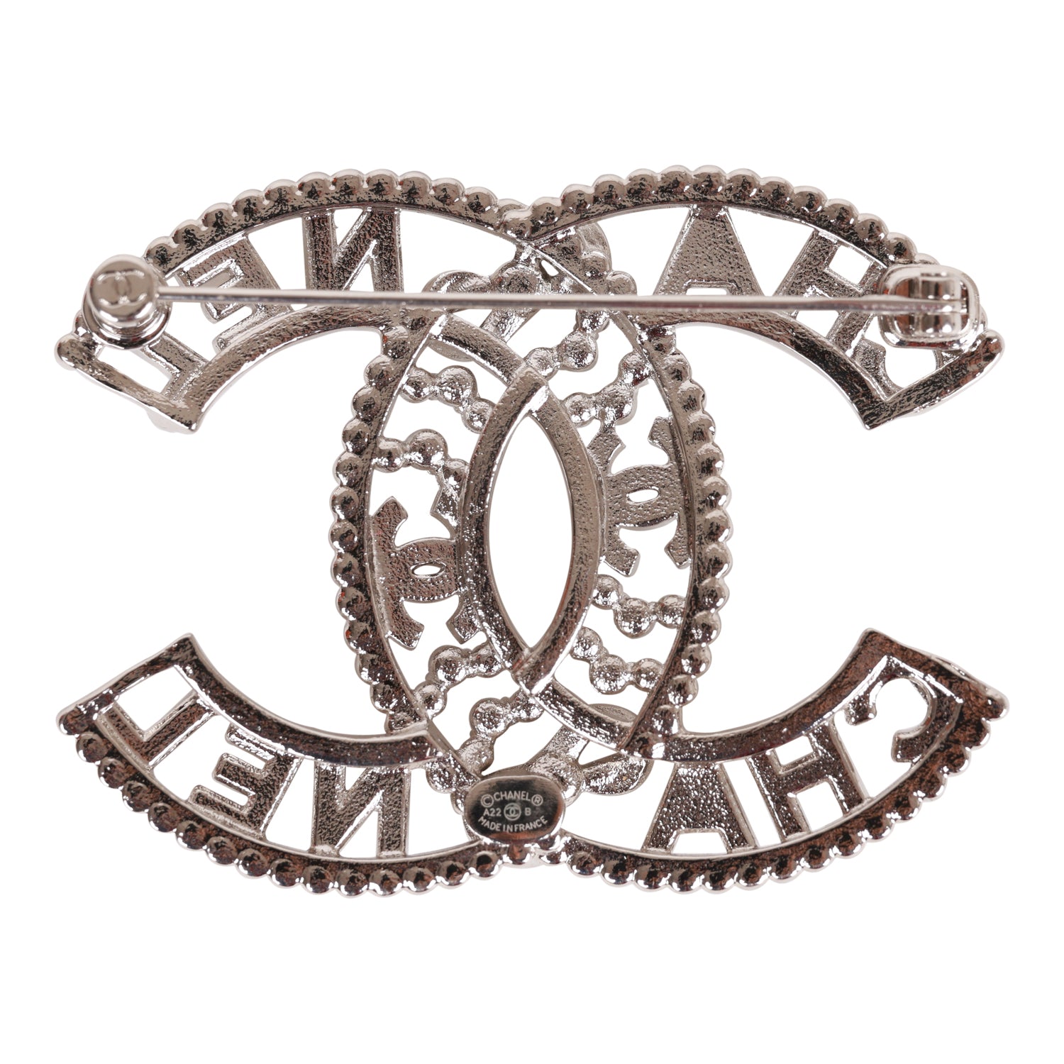 This brooch is in silver tone metal with clear crystals on the CC logo and also spells out Chanel with bow detailing.