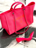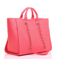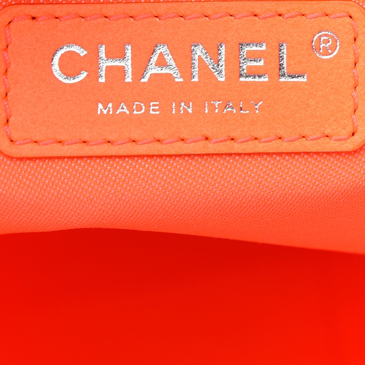 This stylish tote is crafted of textured bright pink mixed fibers with an orange Chanel 31 Rue Cambon Paris logo. It features pink rolled calfskin leather top handles and leather threaded silver chain shoulder straps. The top is open to a spacious pink fabric interior with zipper and patch pockets.