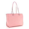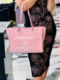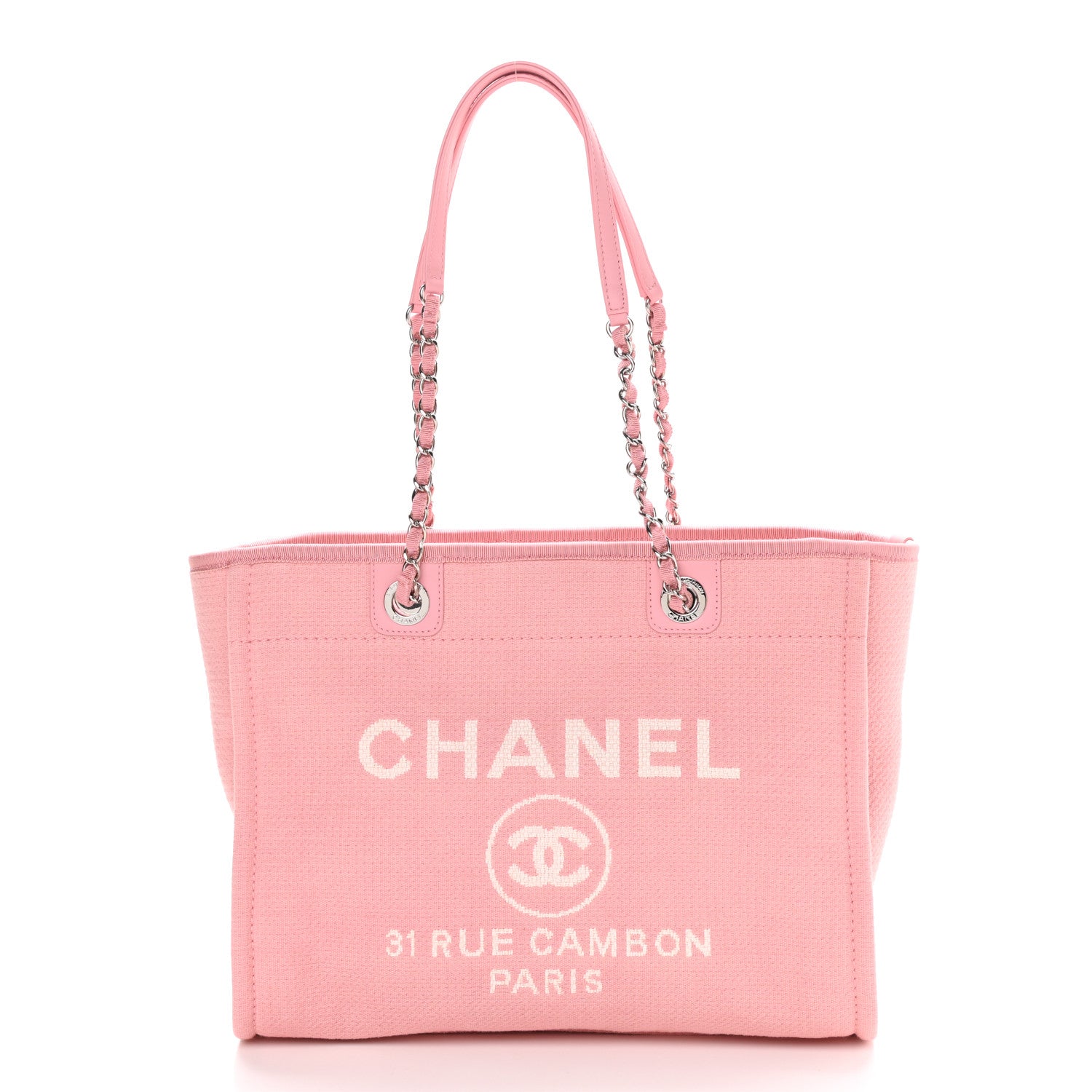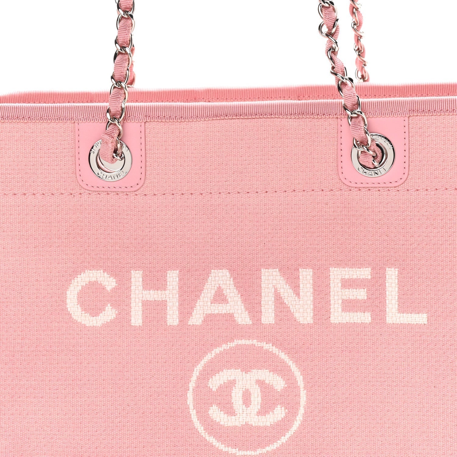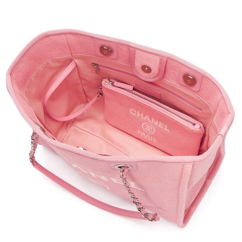 Deauville bag is made of pink boucle fabric with silver-tone hardware; featuring a large CC signature and Chanel logo on the front, removable pouch and interwoven silver tone chain link, and pink leather shoulder straps.