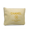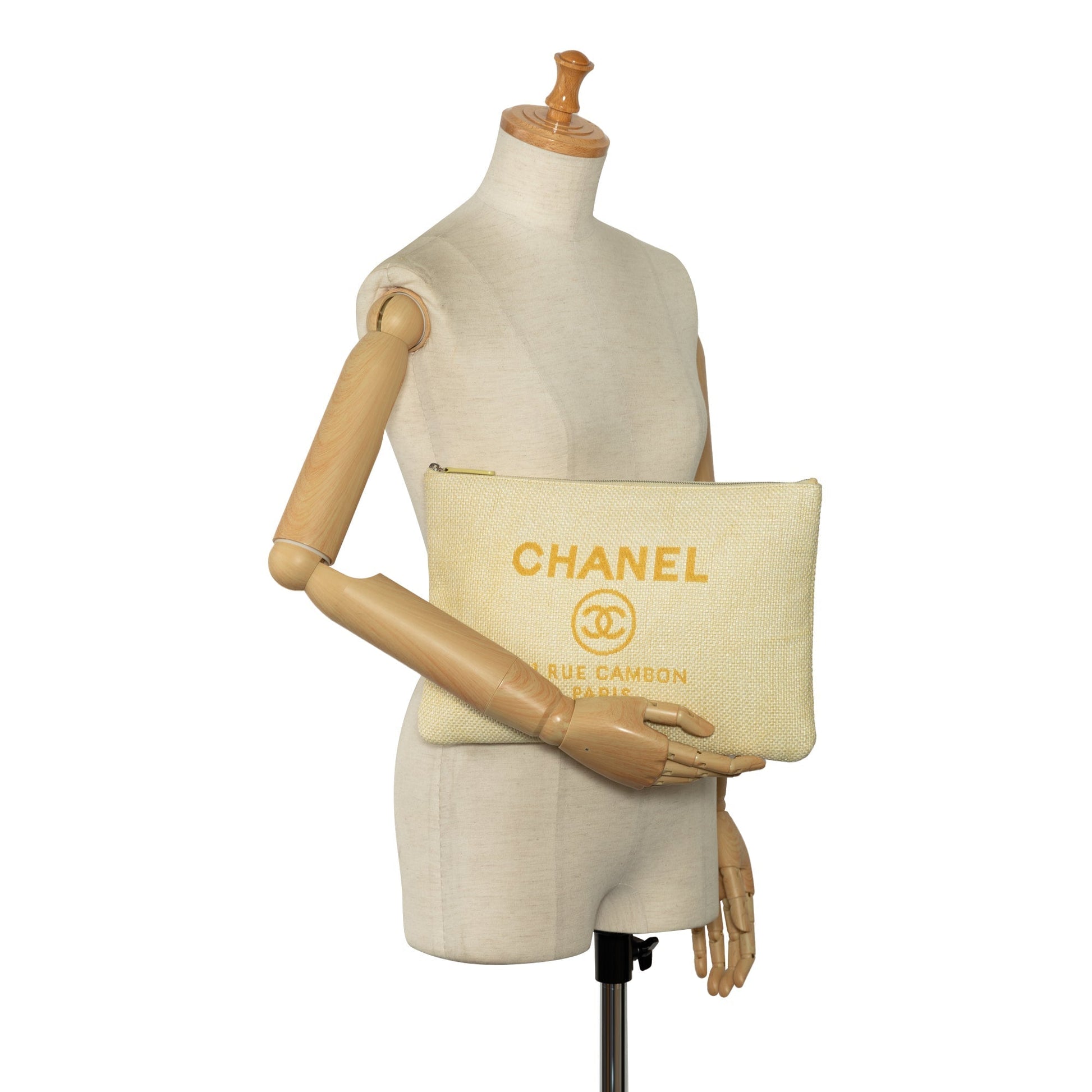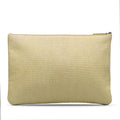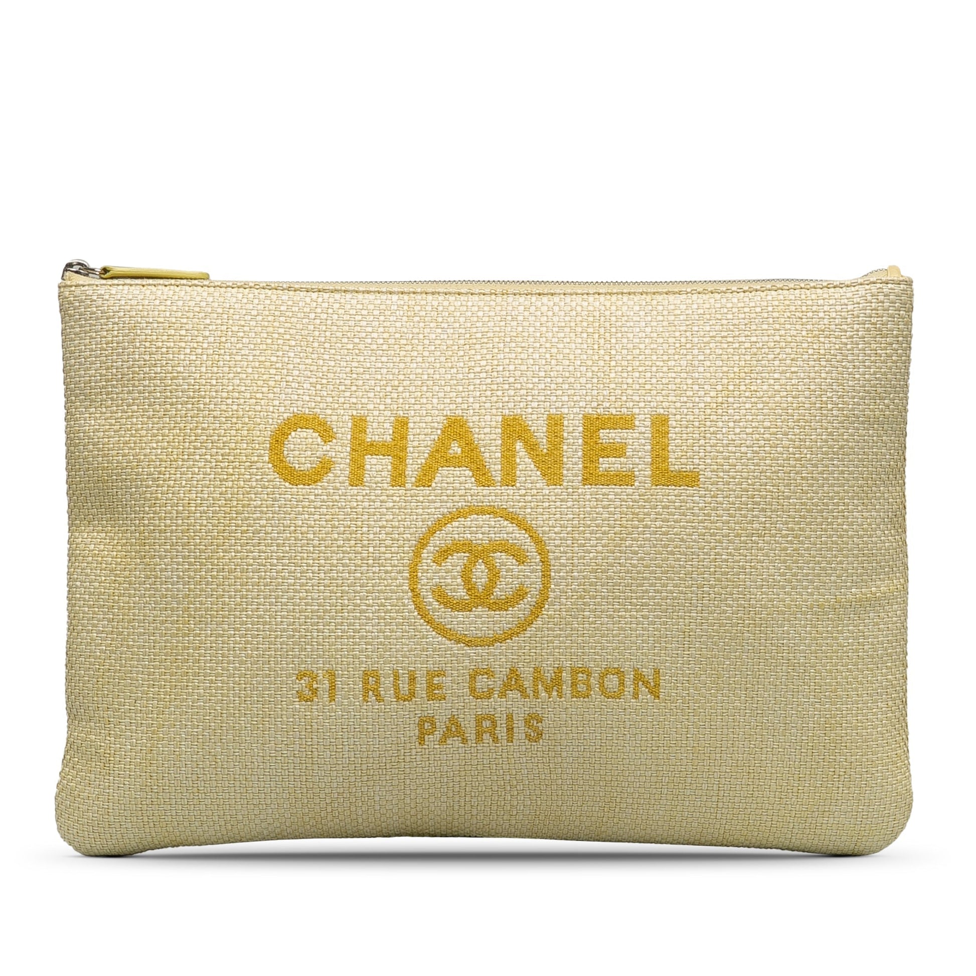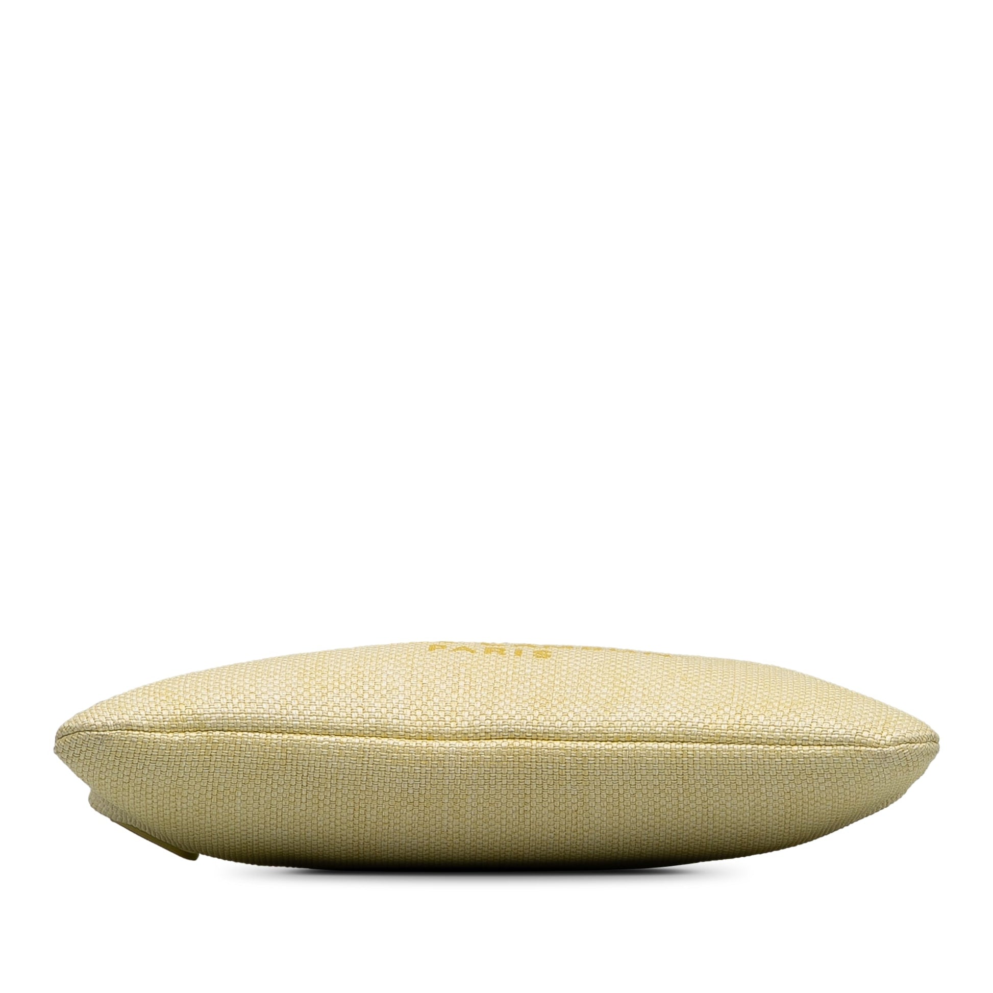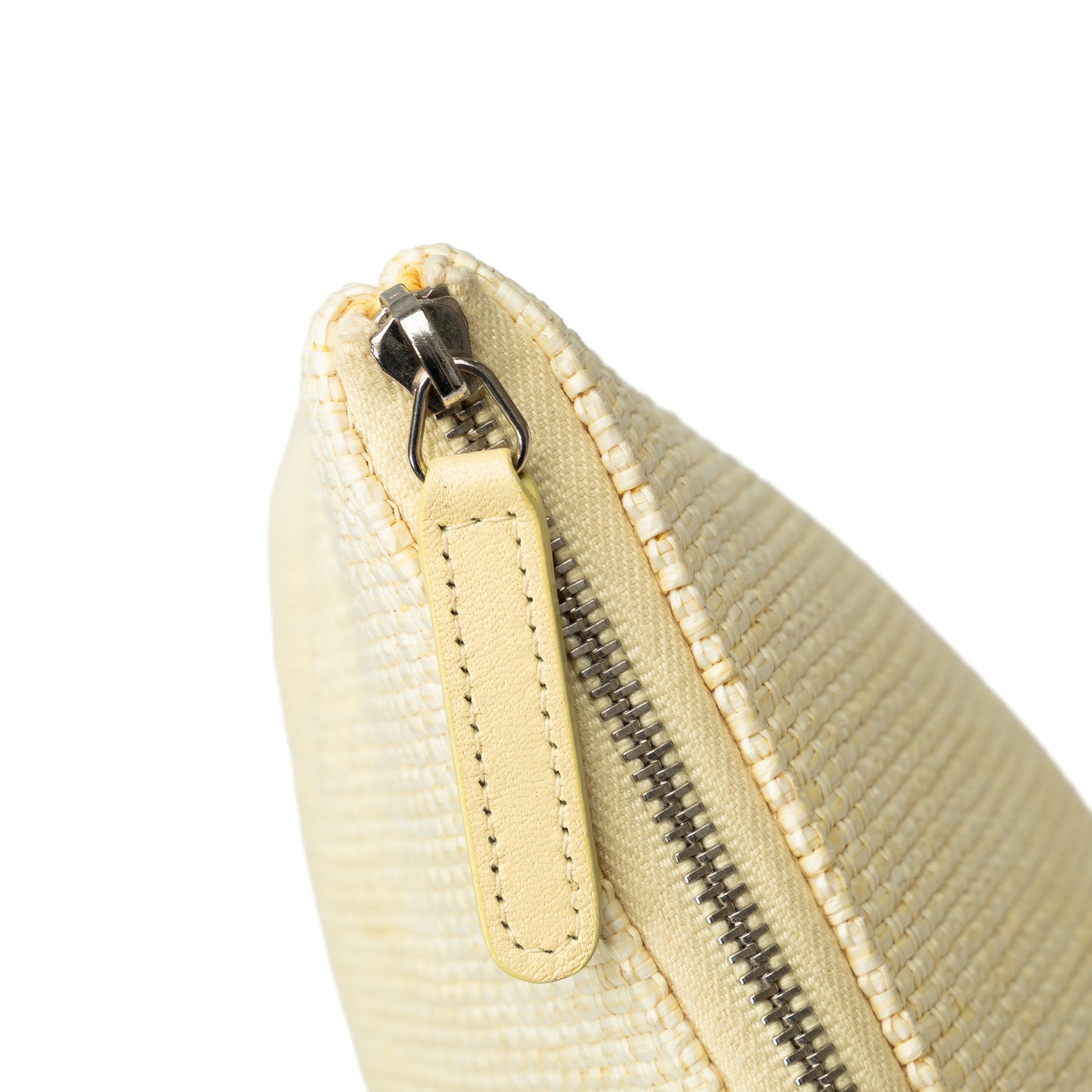 The Deauville O Case features a woven raffia body and a top zip closure.