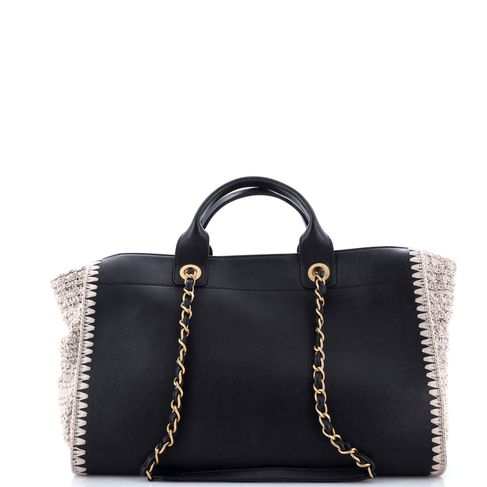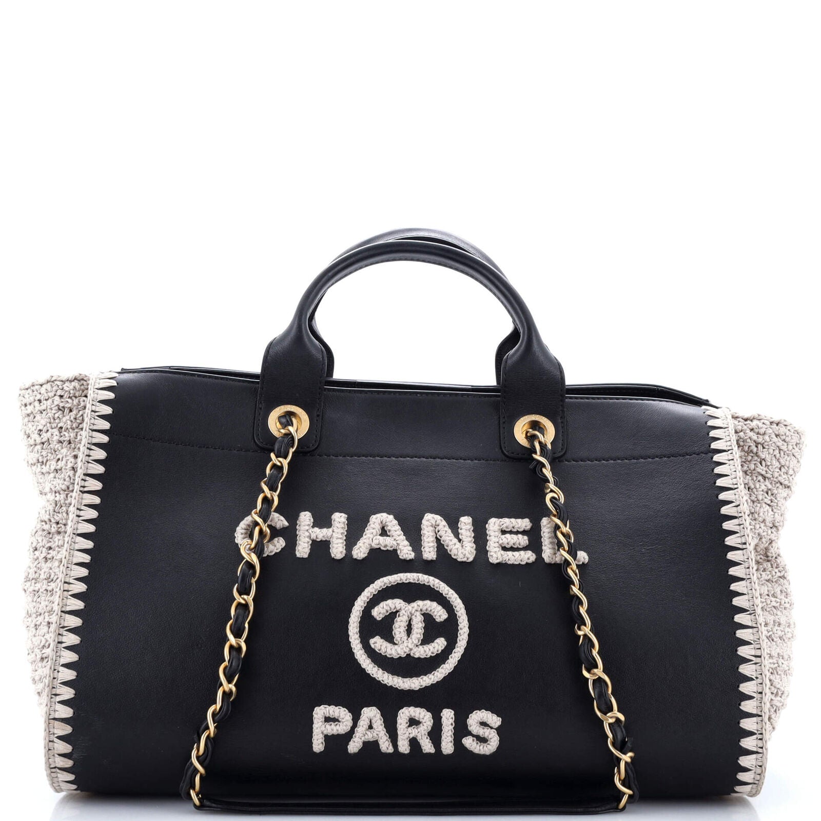 Elevate your style with the iconic Chanel Deauville Tote Calfskin With Crochet Medium. Crafted with luxurious calfskin and adorned with intricate crochet detailing, this bag is a perfect blend of sophistication and bohemian charm. The spacious interior offers ample room for your essentials, making it ideal for both work and leisure.