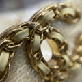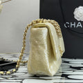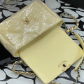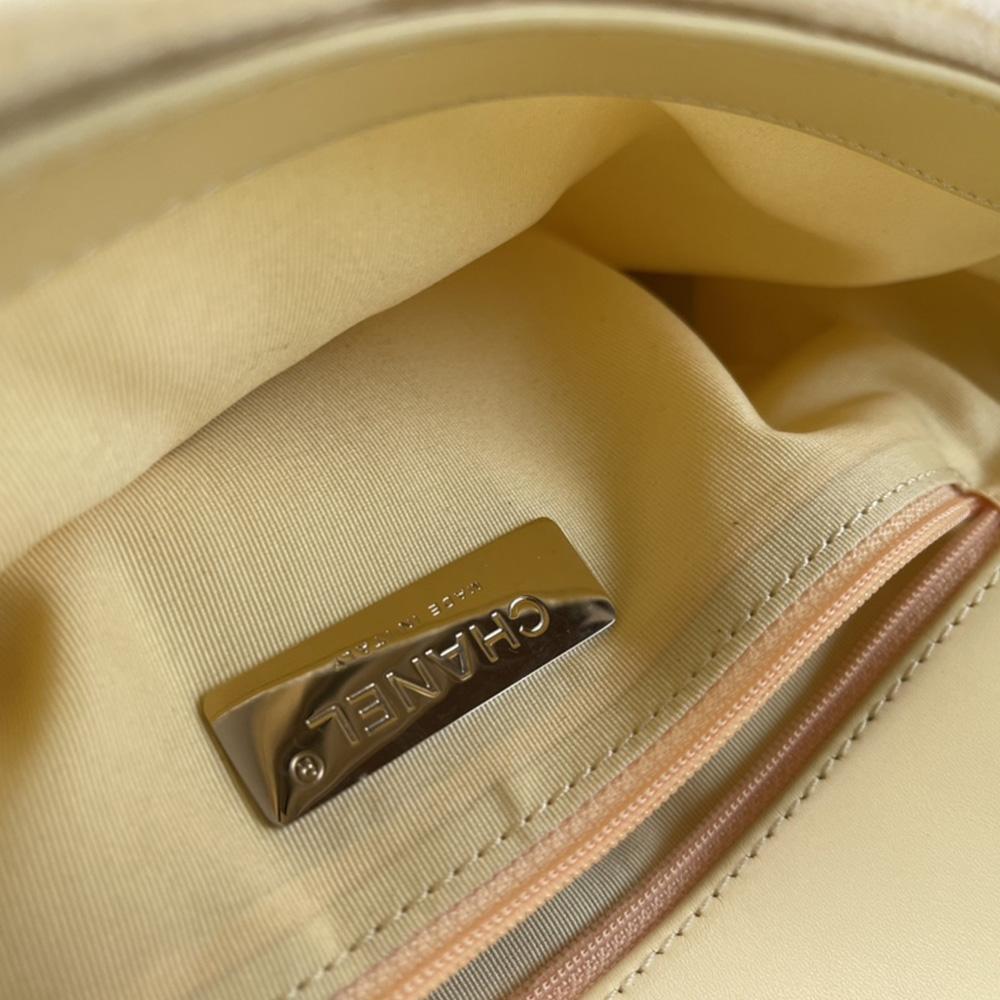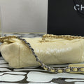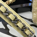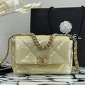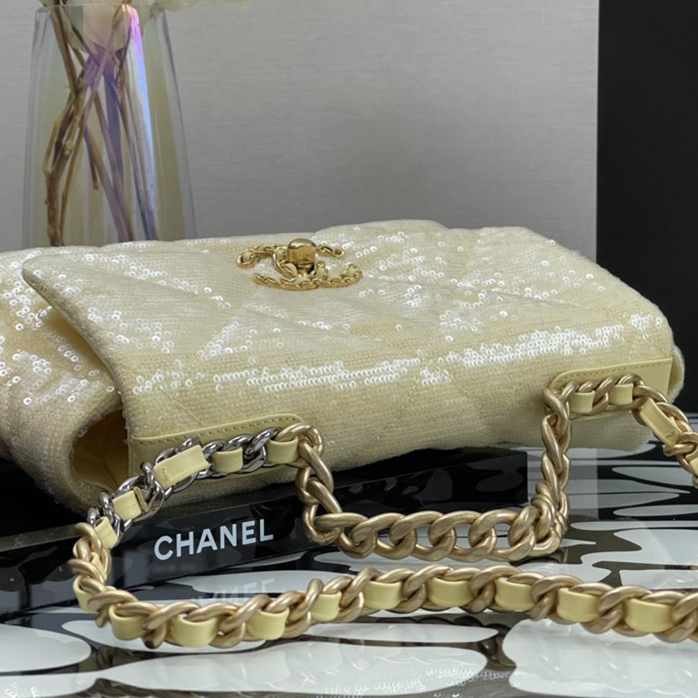 A We this is an CHANEL Sequin Quilted Medium Chanel 19 Flap yellow or This chic shoulder bag is crafted of light yellow circular sequins on a base of light blue fabric. The bag features blue leather threaded silver, ruthenium, and an aged gold chain link shoulder straps with a leather threaded aged