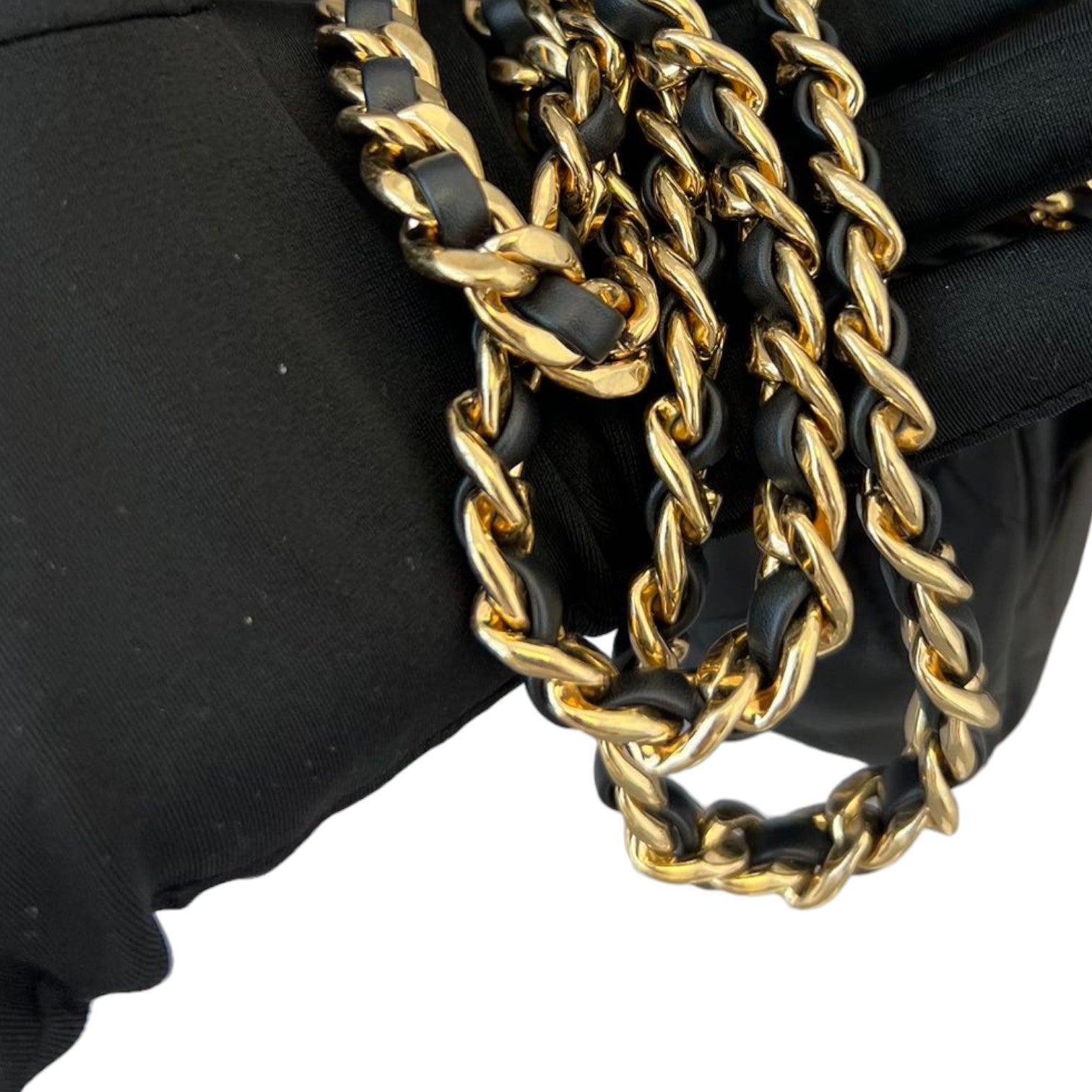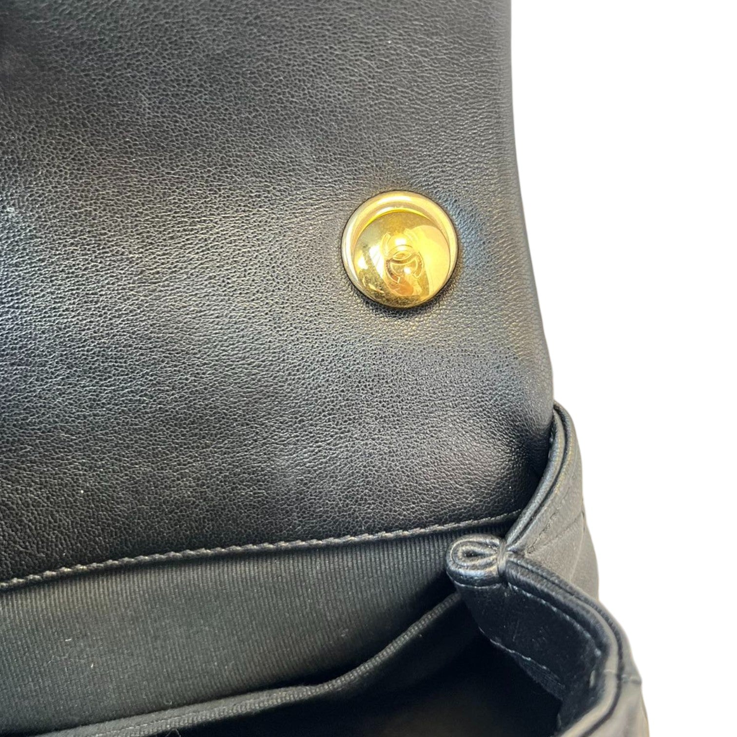 This is an Chanel Flap with Chanel Logo Top Handle Mini Lambskin in Black. This chic shoulder bag is crafted of lambskin leather in black. The bag features a gold chain link leather threaded shoulder strap, chanel logo top handle and CC logo on flap. The CC turn lock opens to a black fabric interior with a patch pocket.