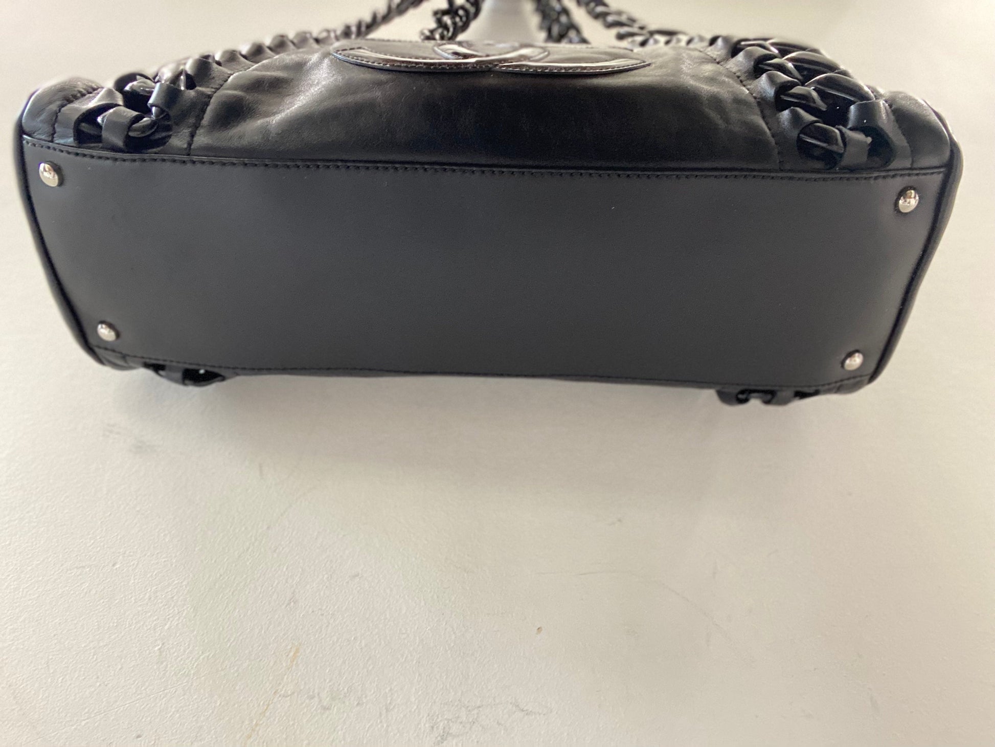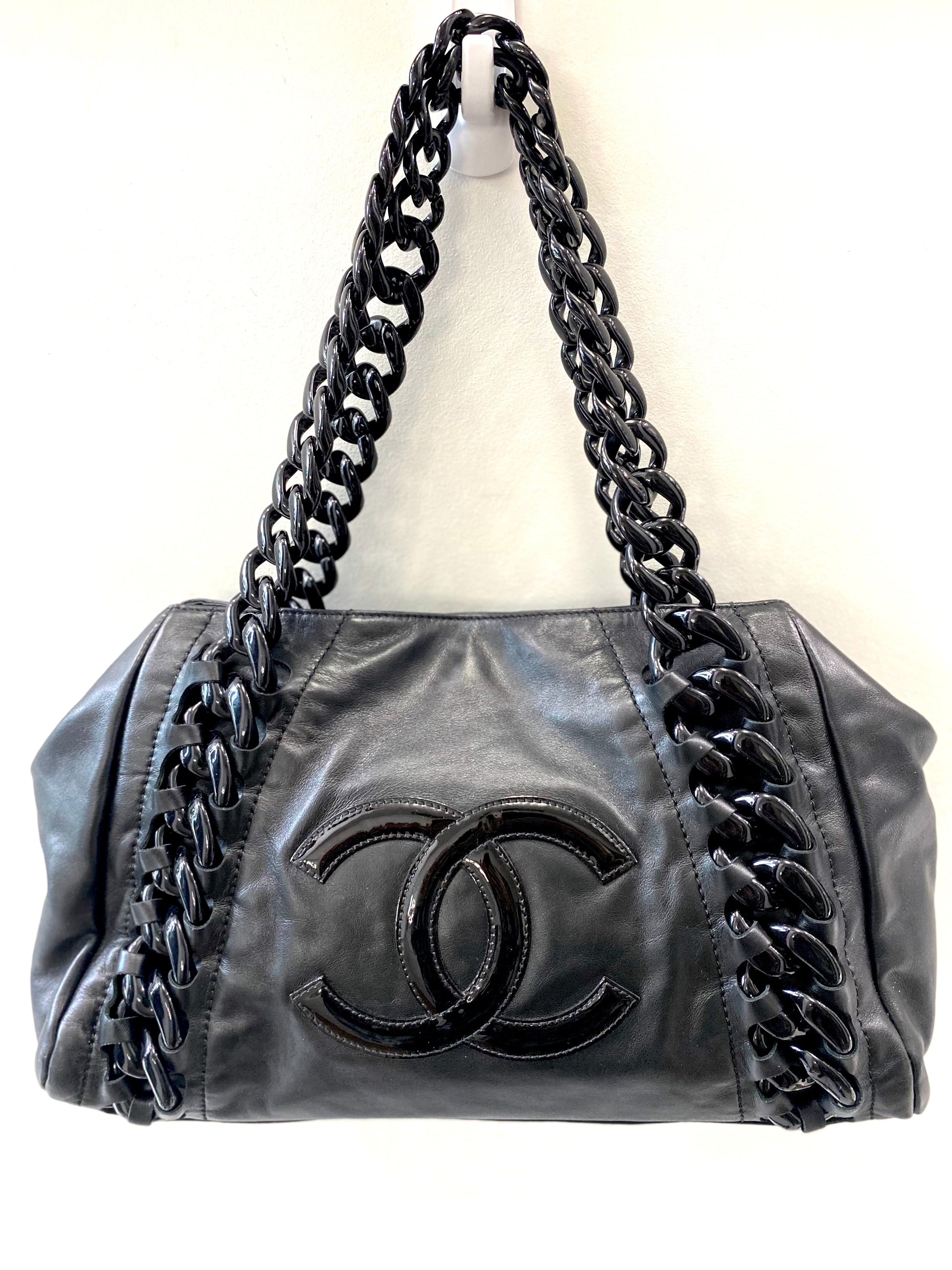 The bag features a frontal Chanel CC logo, and a leather threaded chain shoulder strap.