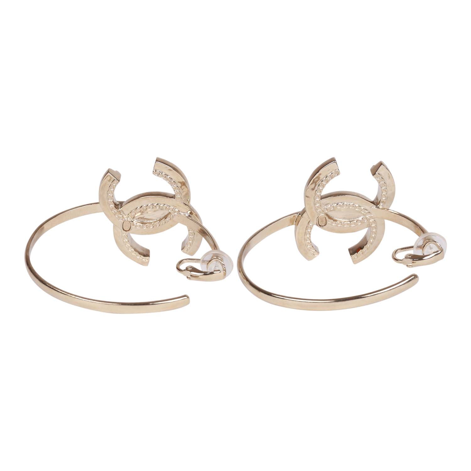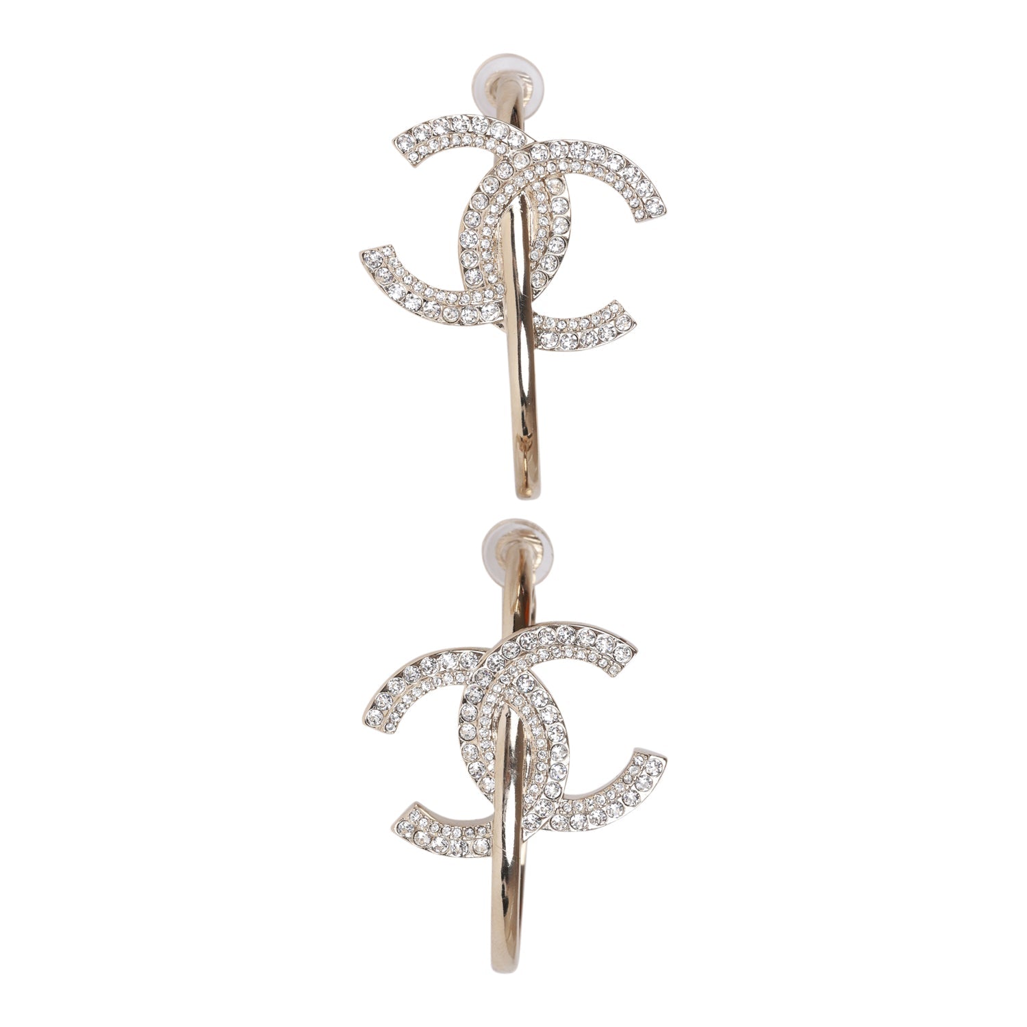 These CC logo hoop earrings are in gold tone metal with clear crystals and are clip on style.