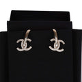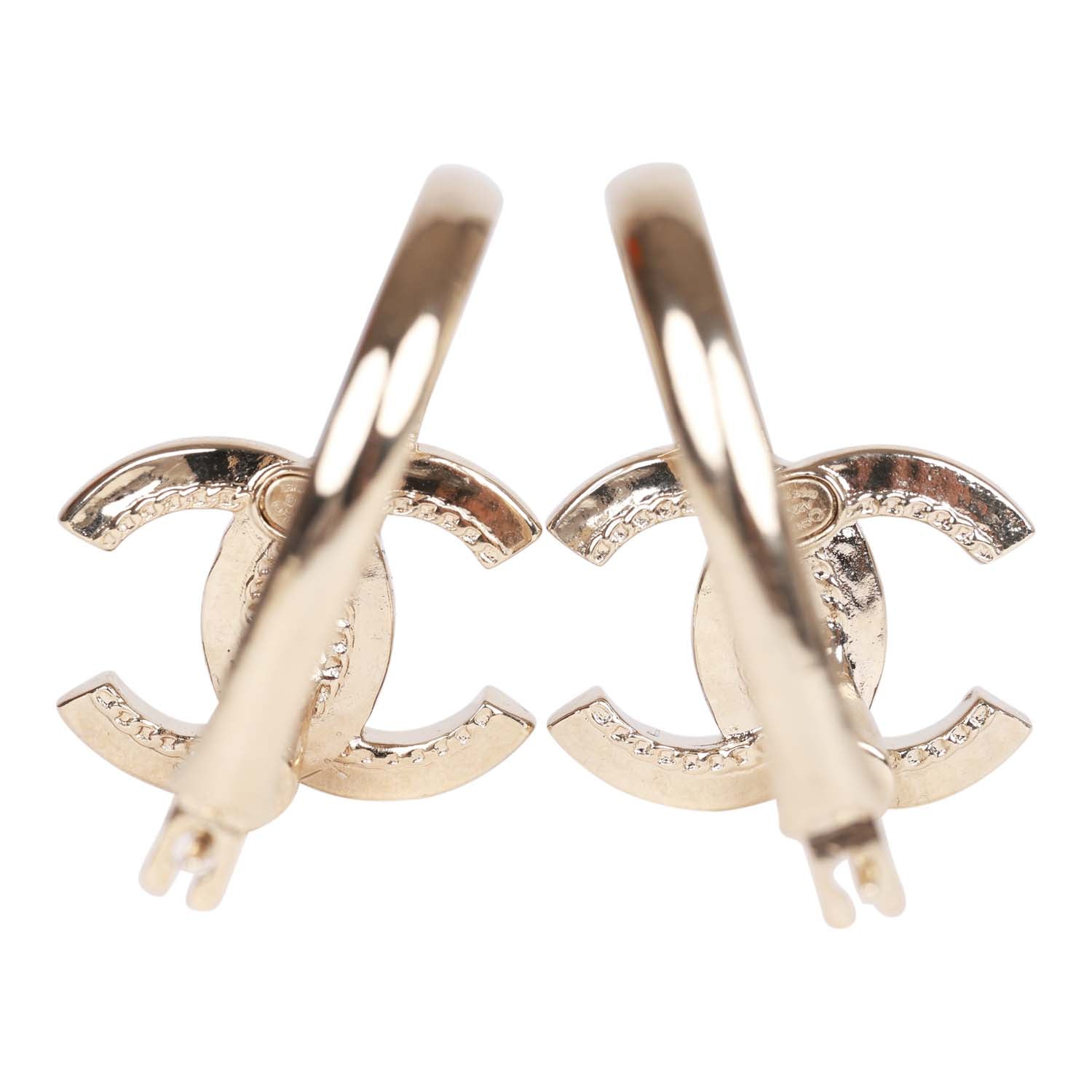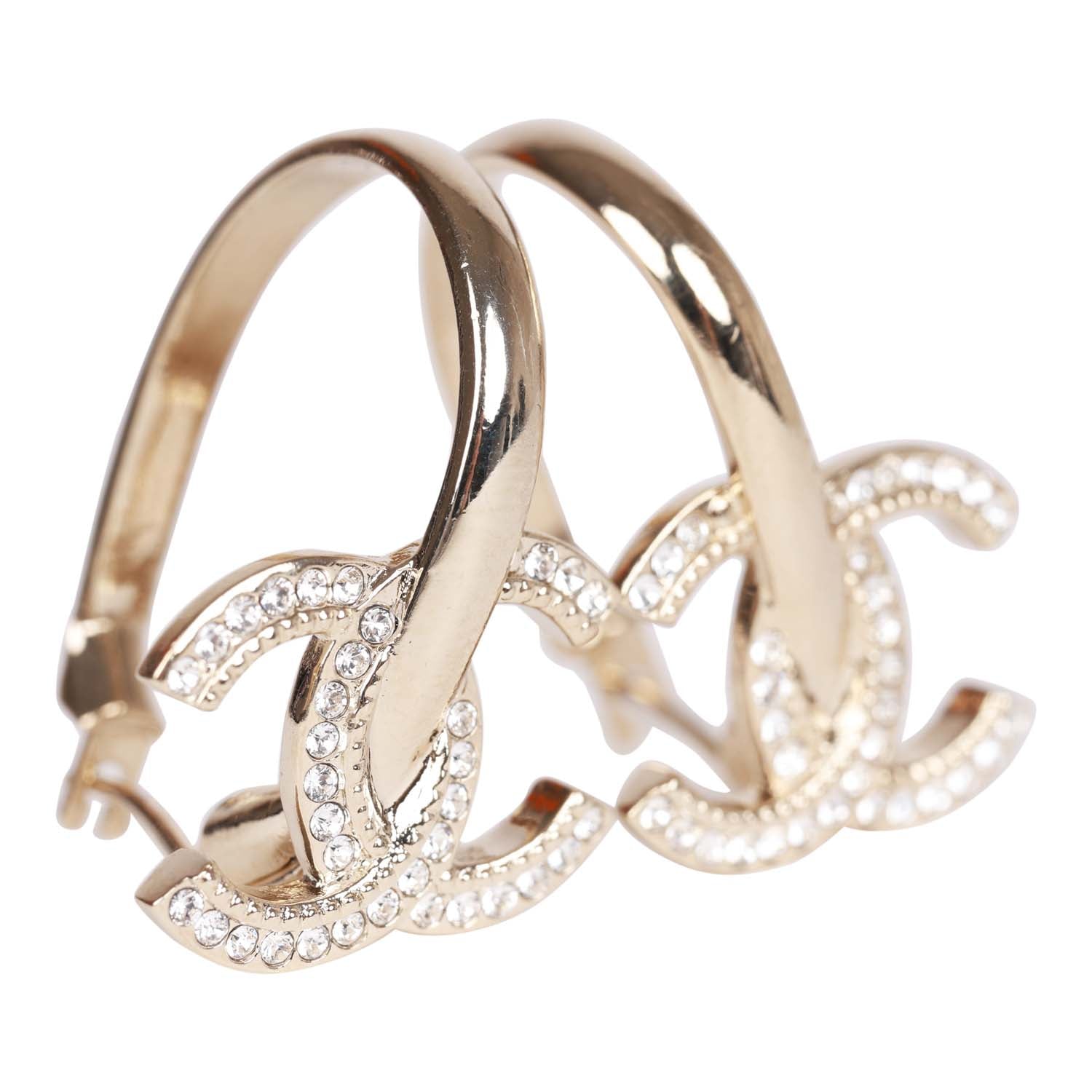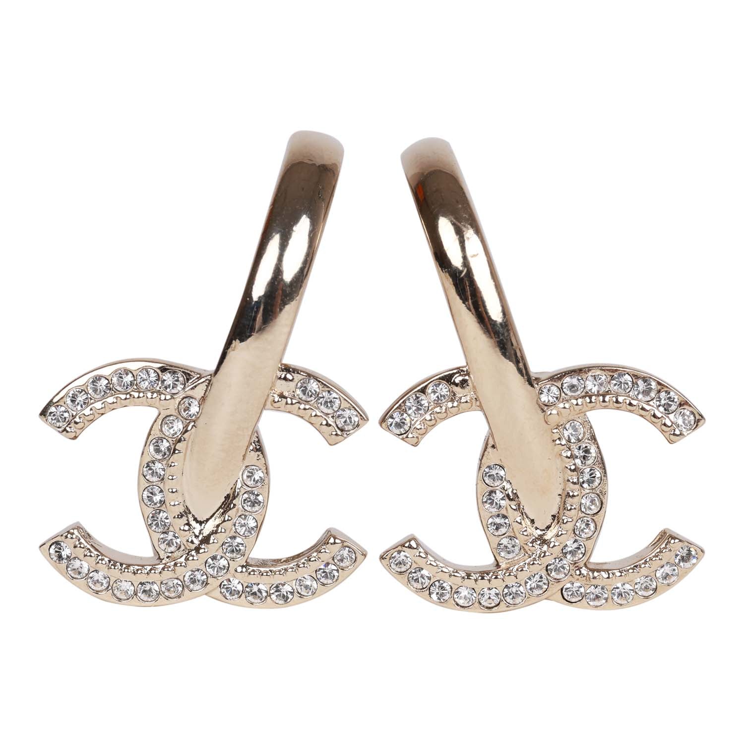 These CC logo hoop earrings are in gold tone metal with clear crystals.
