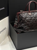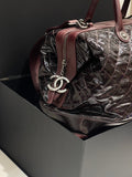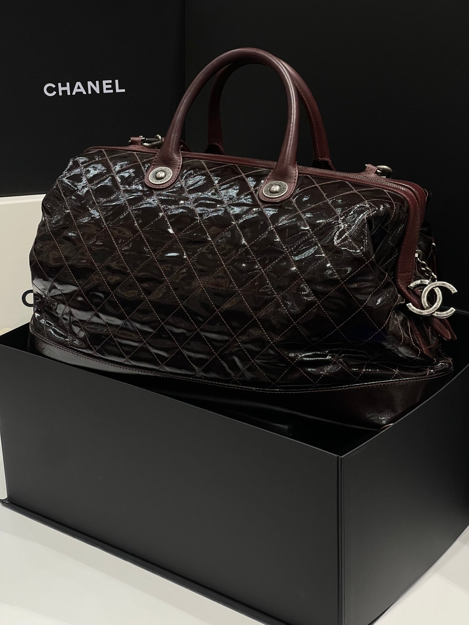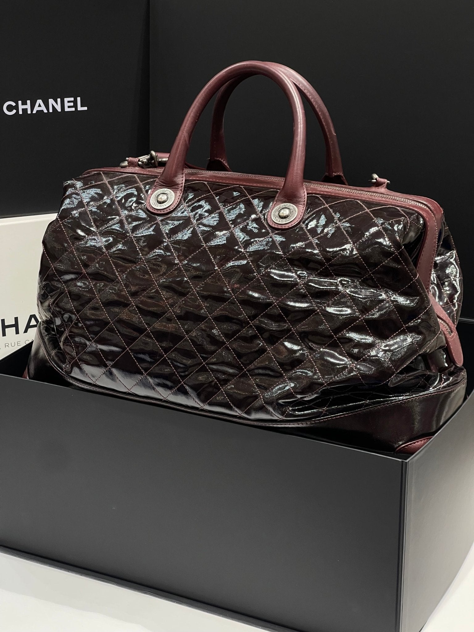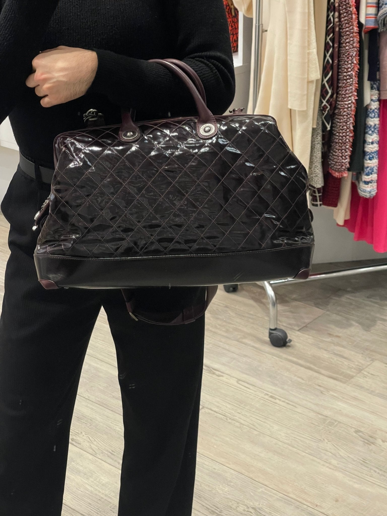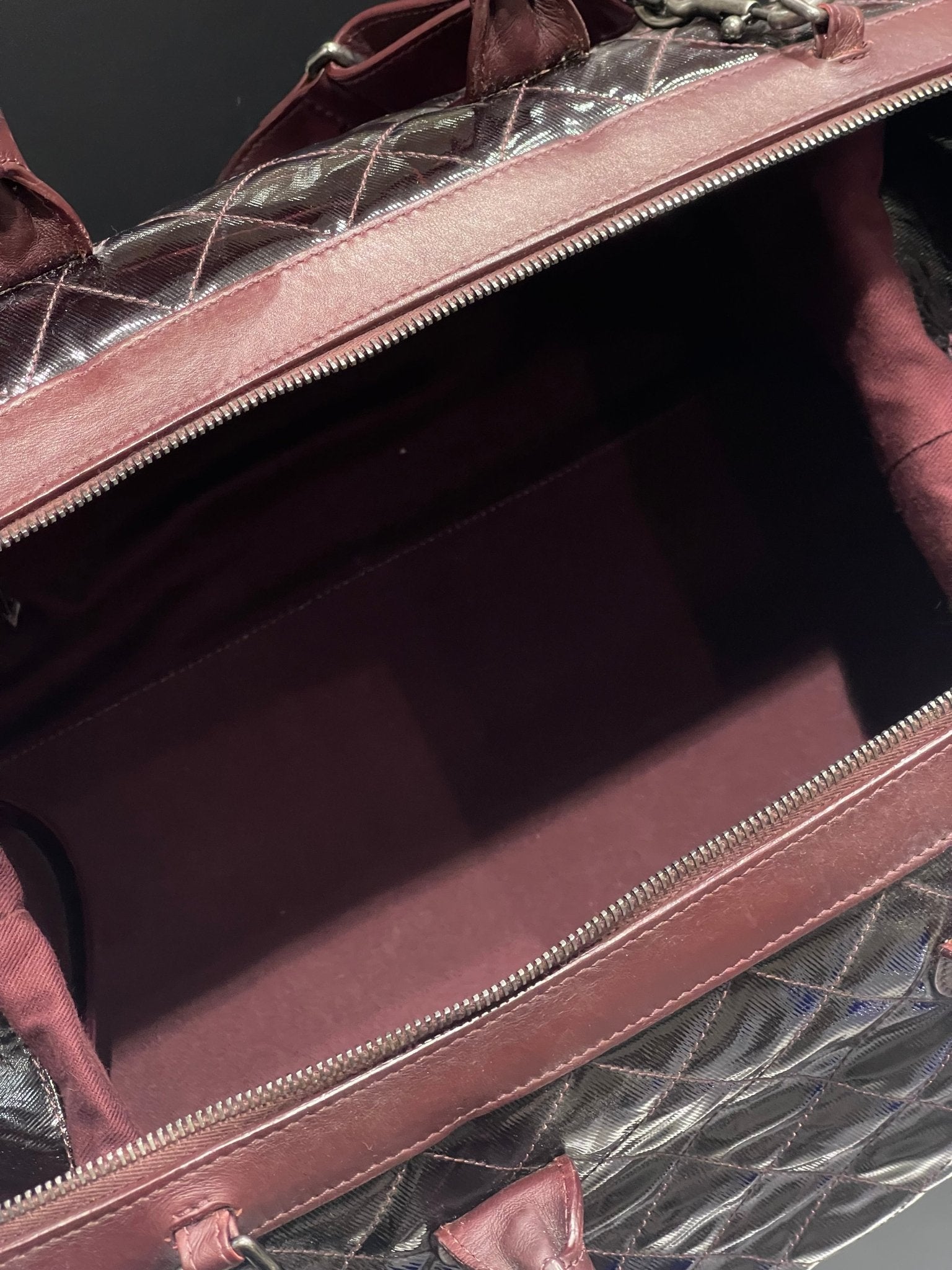 Superbe cabas introuvable en toile enduite bordeaux et cuir de veau. Indispensable et chic avec son accastillage ruthénium, sa grande ouverture et sa large bandoulière le rendent encore plus pratique.