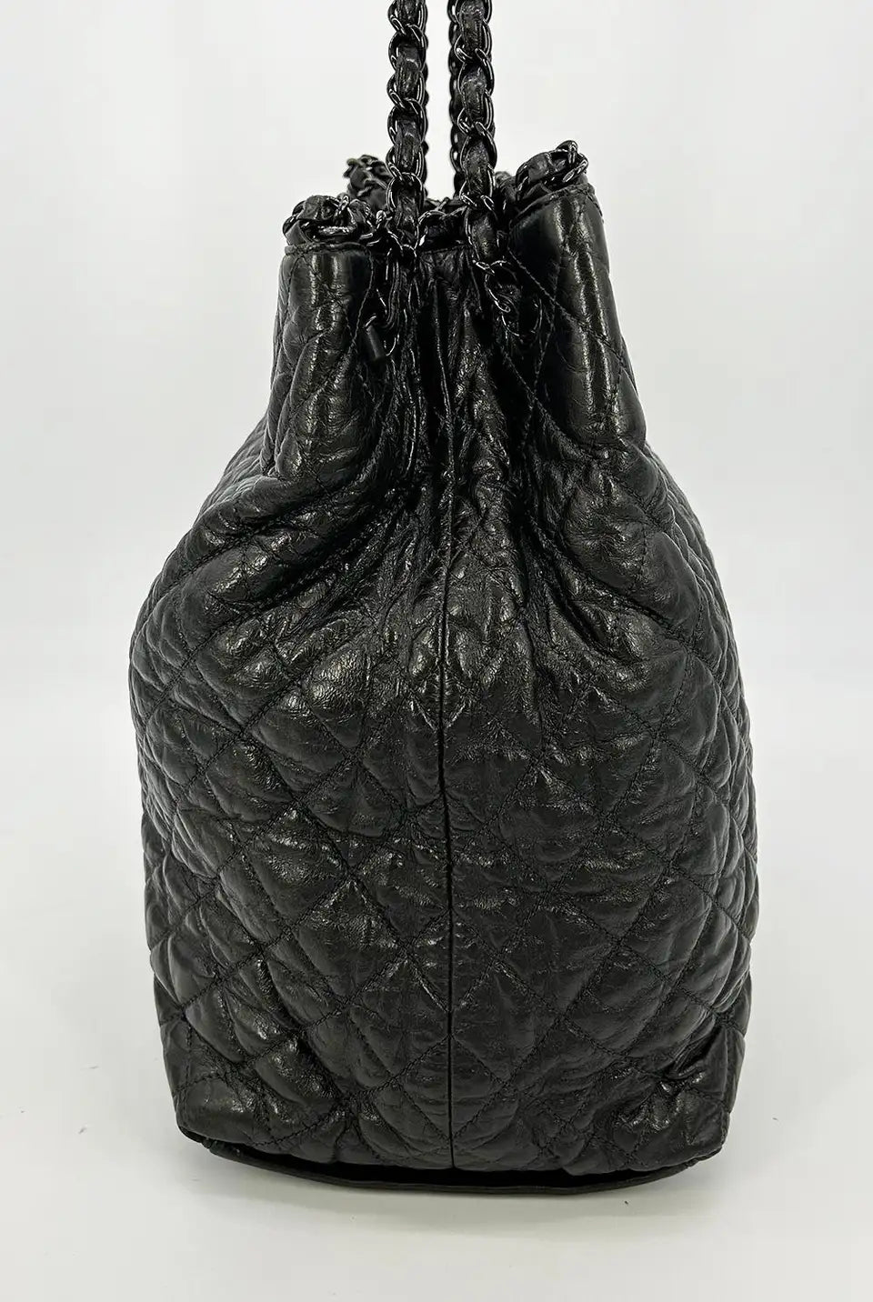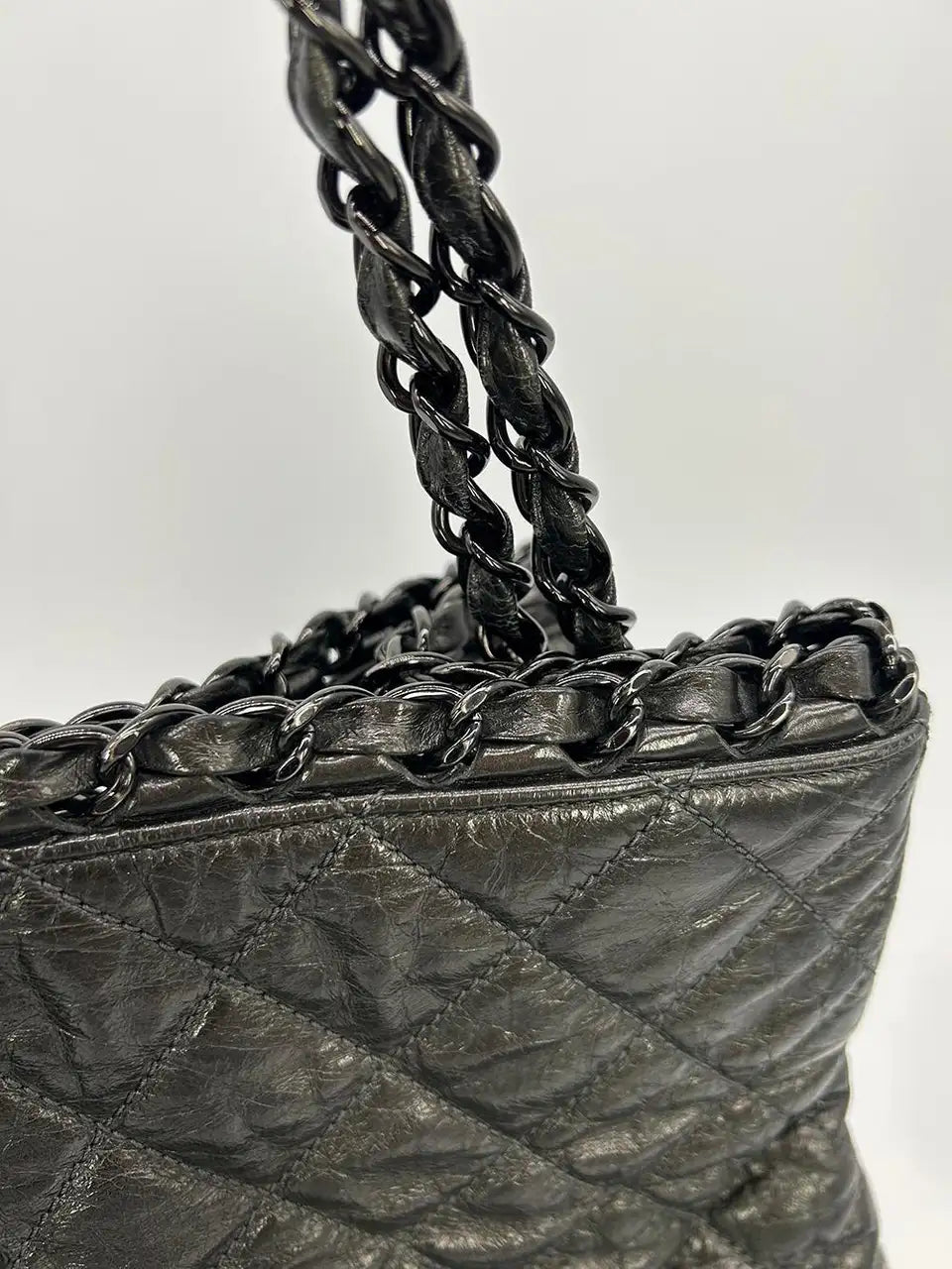 Chanel Grey Metallic Leather Chain Me Shoulder Bag Tote in excellent condition. Metallic ddark grey leather quilted in signature diamond pattern trimmed with dark gunmetal hardware and woven chain and leather shoulder strap and top edge. Quilted CC logo along front side. Top magnetic snap closure opens to a black nylon interior with 1 zip and 2 slit side pockets and leather key strap. overall excellent condition. clean corners and edges. a few scratches on bottom interior lining- see photos for details. measurements: 16"x15"x7" 7" handle drop