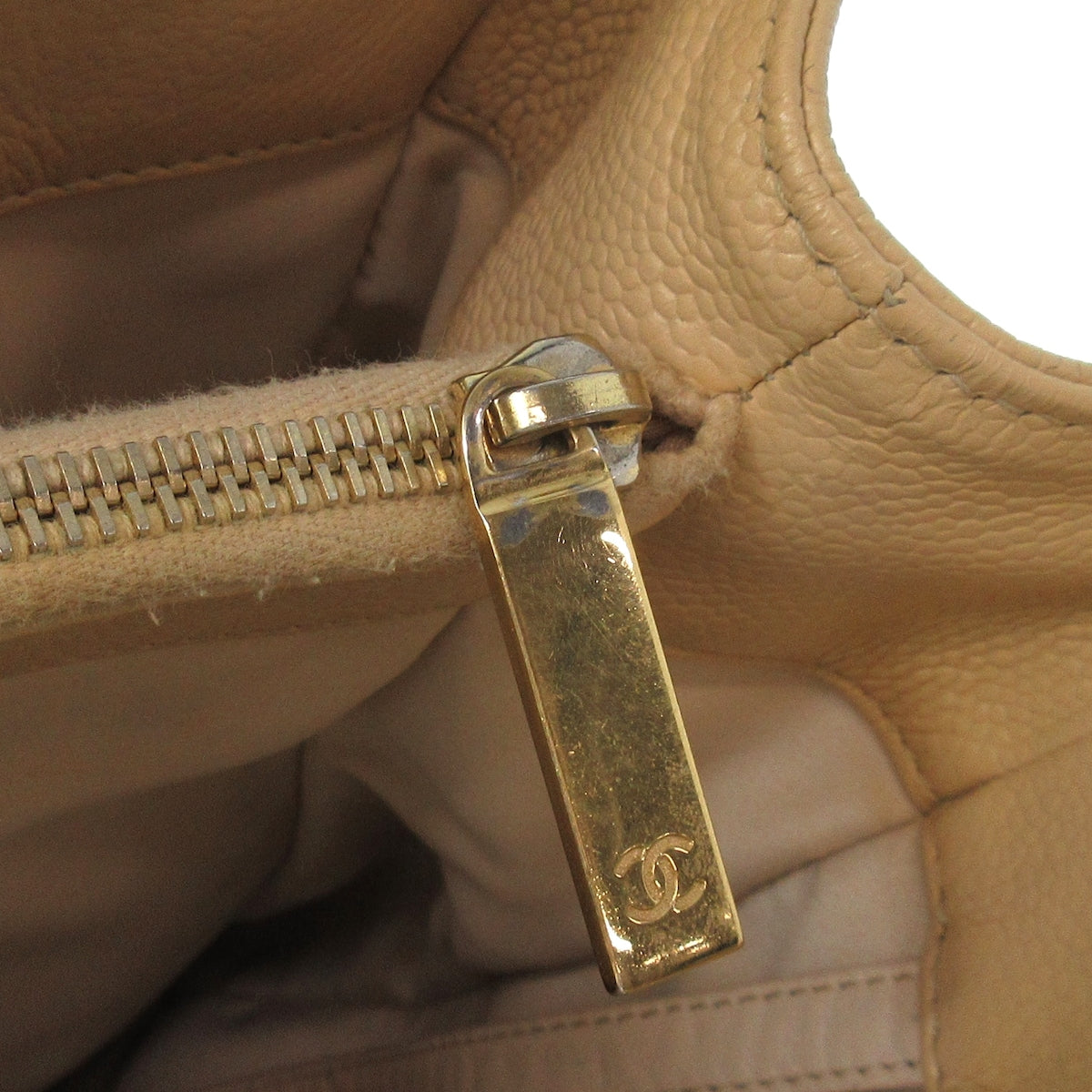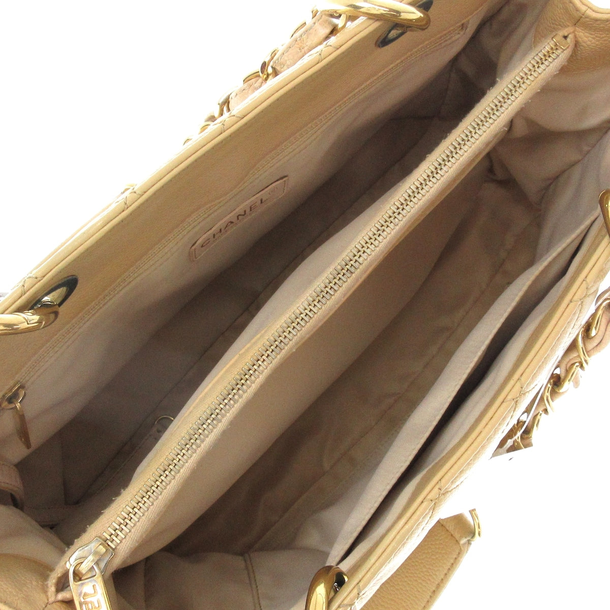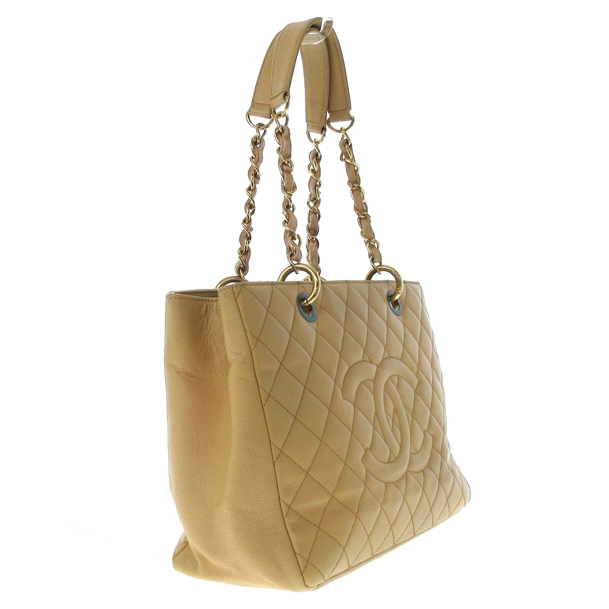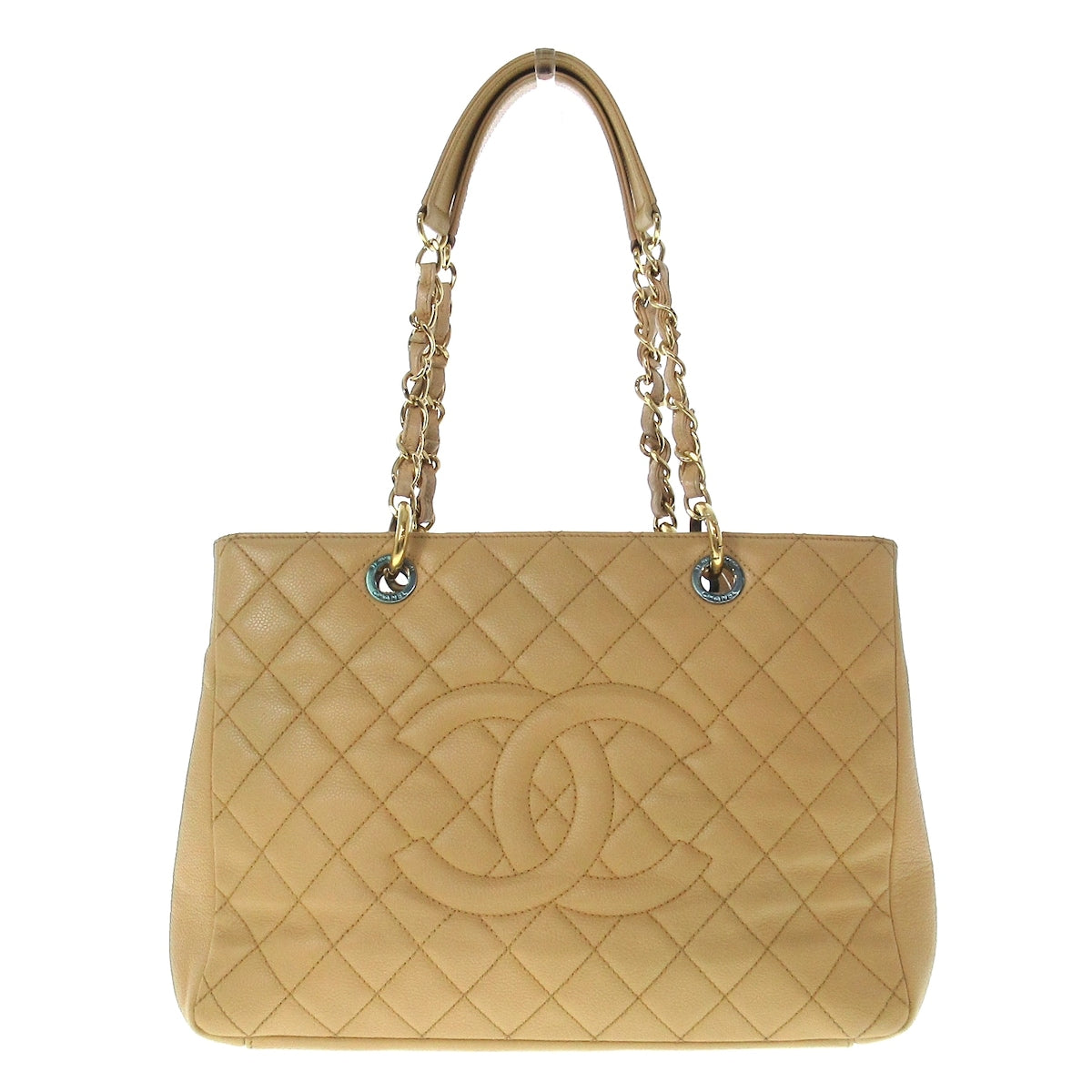Introducing the Grand Shopping Tote (GST) from CHANEL, a luxurious tote bag crafted for sophisticated women who appreciate both style and functionality. Fashioned from exquisite beige caviar skin, this iconic piece is a testament to the brand's commitment to elegance.