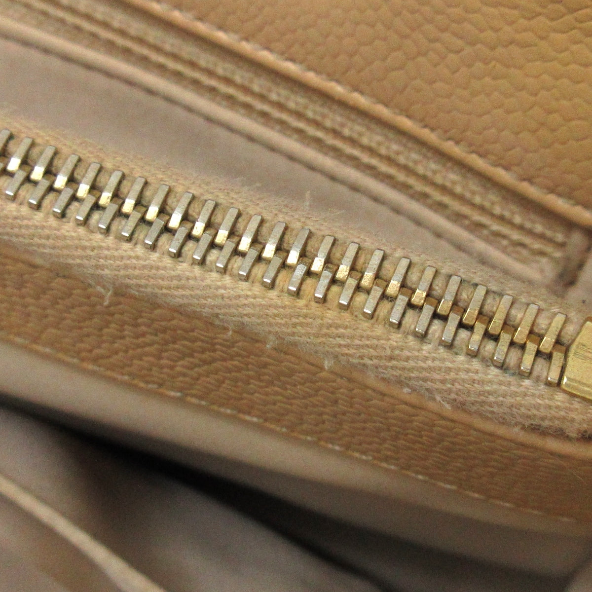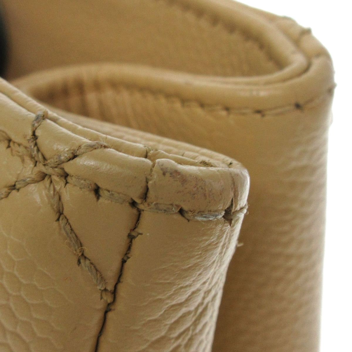 On the exterior, the bag exudes a graceful charm with a light overall soiling and a subtle misshape, reflecting a touch of well-loved character. The metal hardware, however, has lost its plating, adding a vintage allure. The bottom showcases slightly corners, and the handle exhibits some scuffs, contributing to the bag's unique aesthetic. Internally, the GST maintains its grace with light soiling, embodying a sense of refined use. The pockets, while slightly scratched, show signs of wear with metal plating peeling and some fraying.