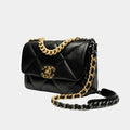 Crafted from premium shiny lambskin, the Chanel 19 Handbag boasts a soft, glossy texture that exudes luxury. The gold-tone, silver-tone, and ruthenium-finish metal accents add a unique, multi-tonal aesthetic. Measuring 16 x 26 x 9 cm, this handbag provides ample space for essentials while maintaining its sleek design.