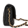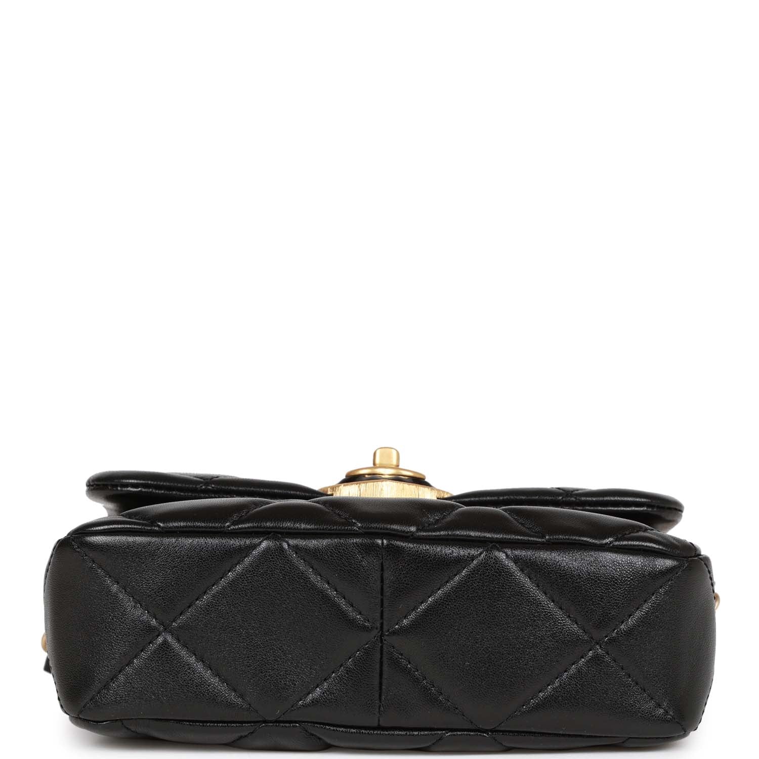 This Mini Flap bag is in Black lambskin leather with antique gold tone hardware and features a front flap with signature CC turnlock closure enclosed in a heart motif, and an interwoven light gold tone chain link and black leather shoulder strap