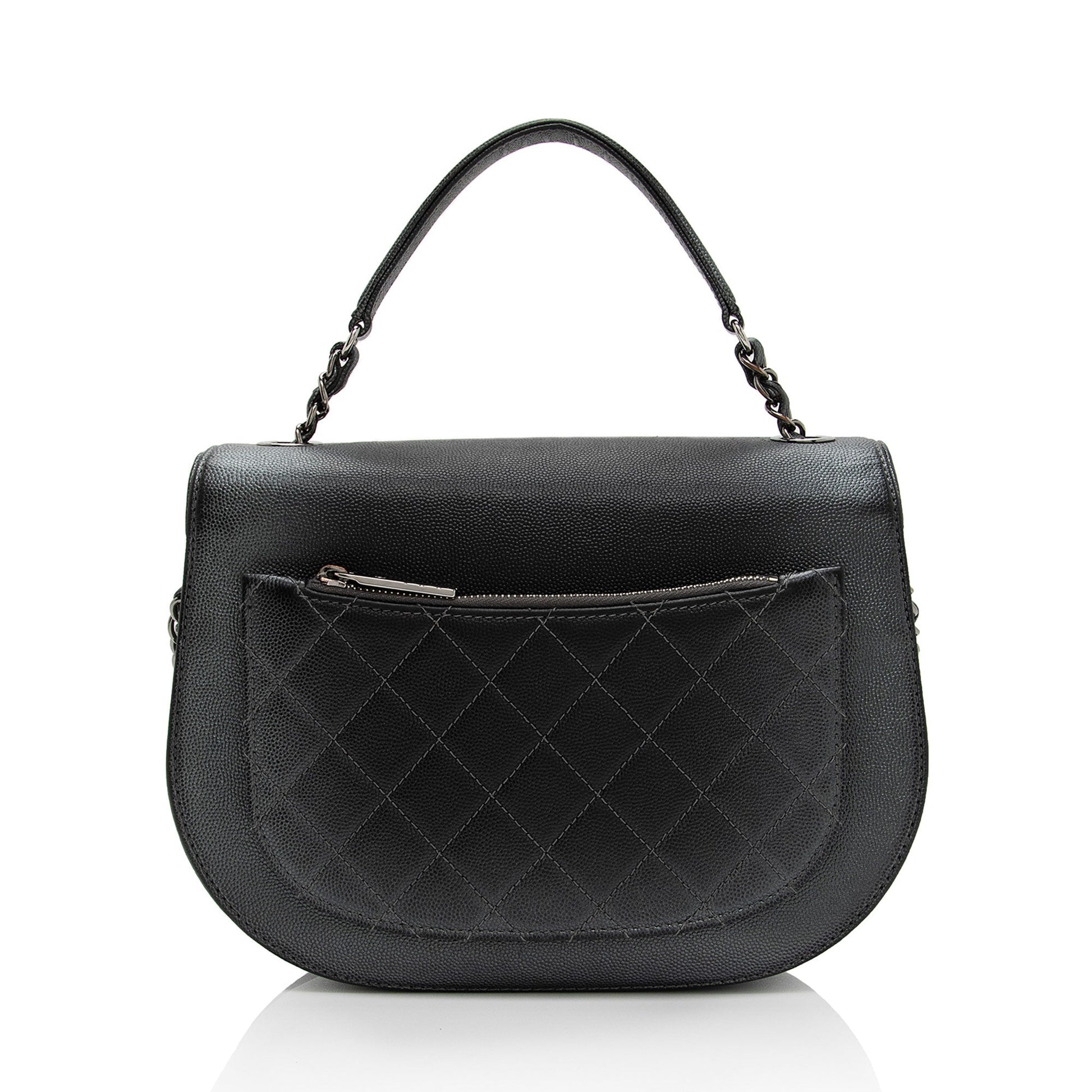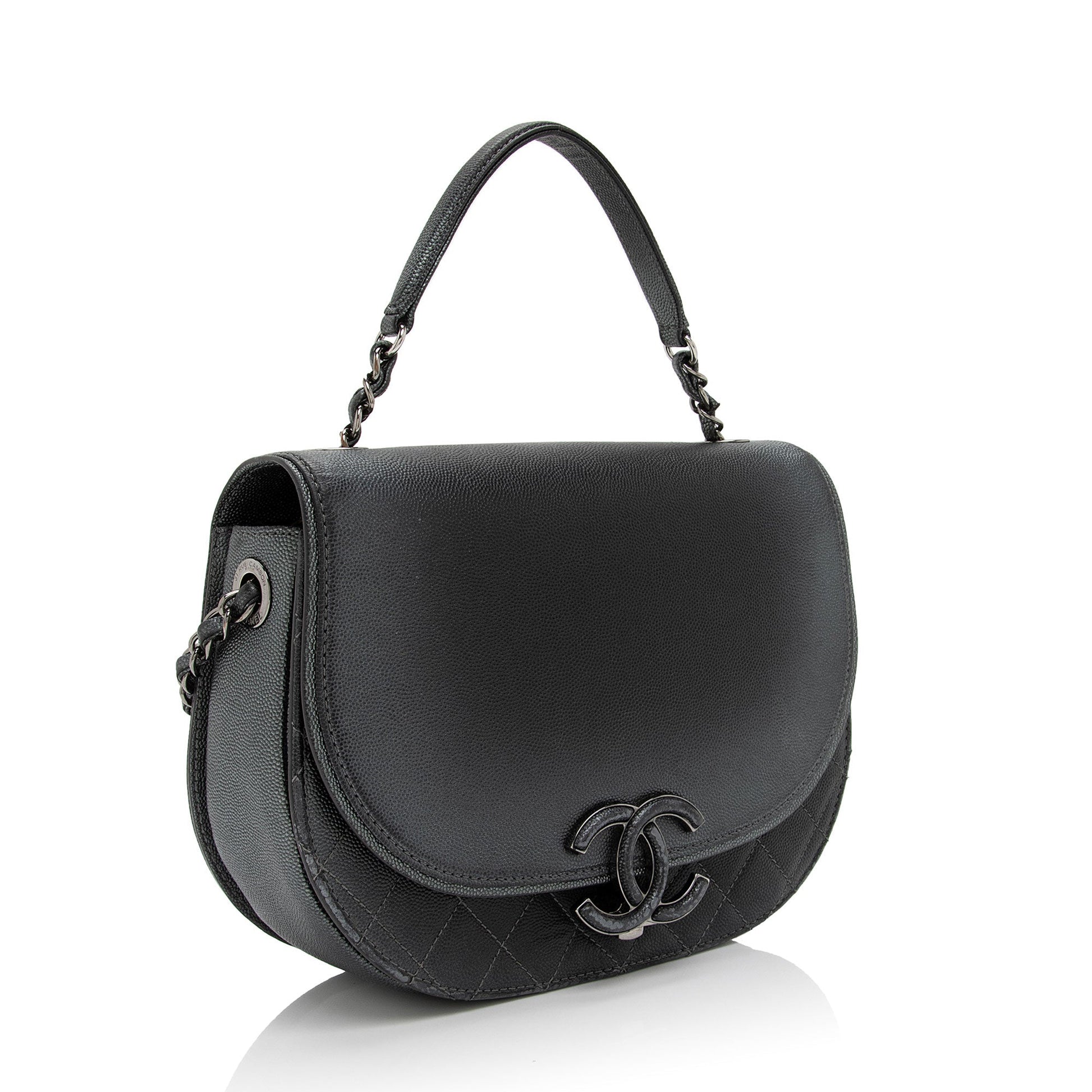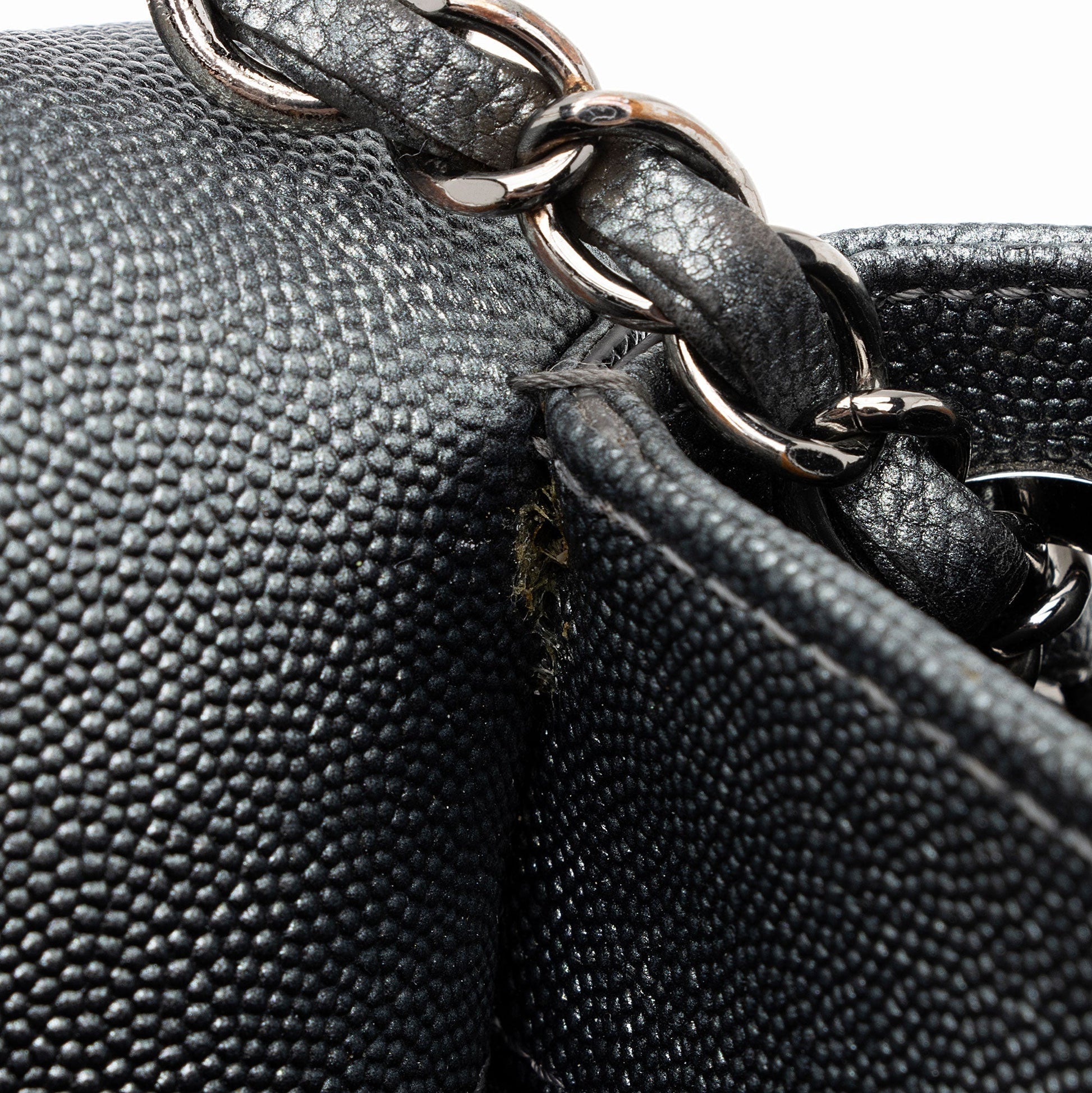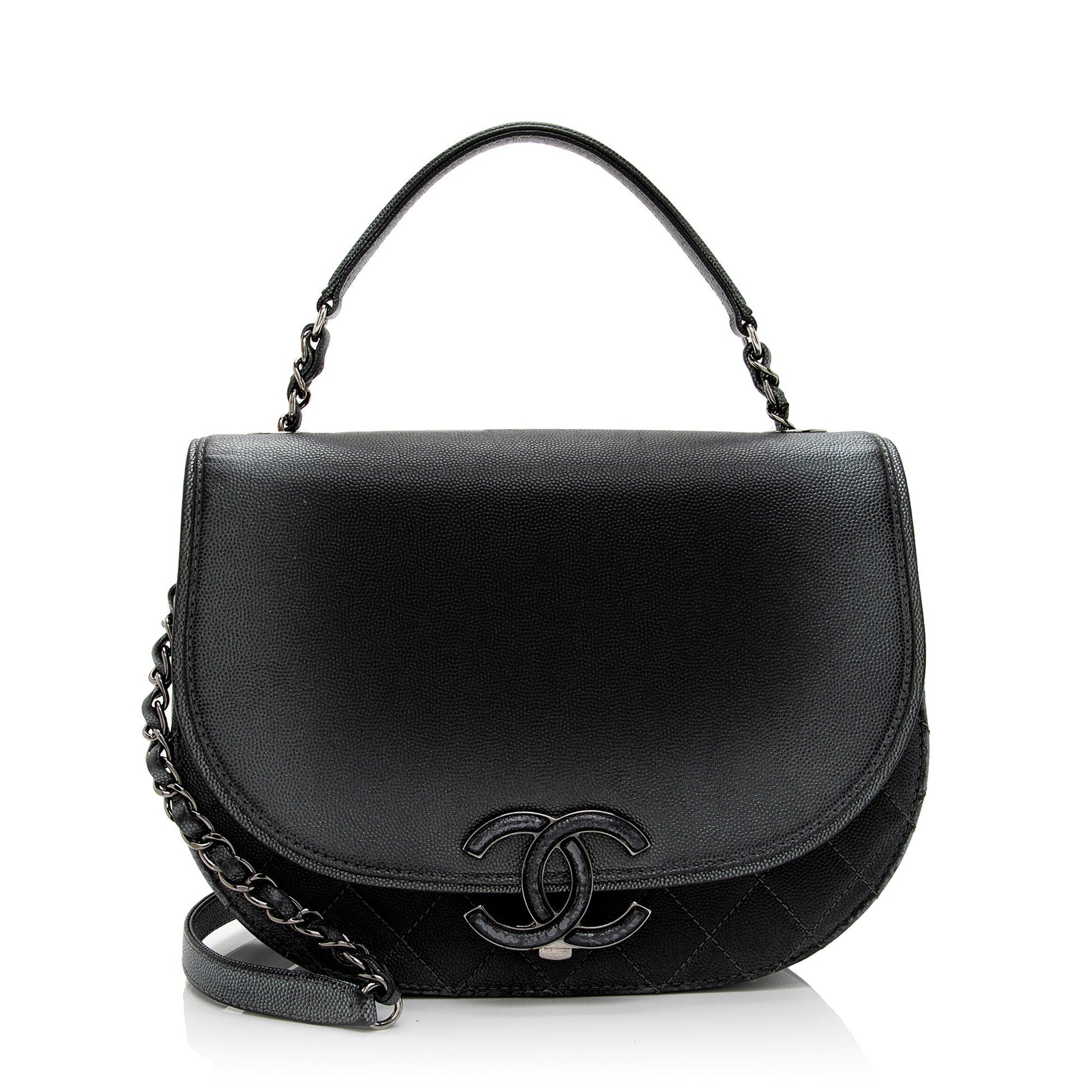 Condition Notes: Moderate discoloration to front CC logo. Scuffs and light discoloration throughout exterior edges and corners. Darkening and wear throughout leather woven into shoulder strap and leather on shoulder strap. Visible popped seam to exterior front pocket. Surface scratches to hardware. Light marks and wear throughout interior. Peeling to interior hologram.