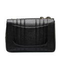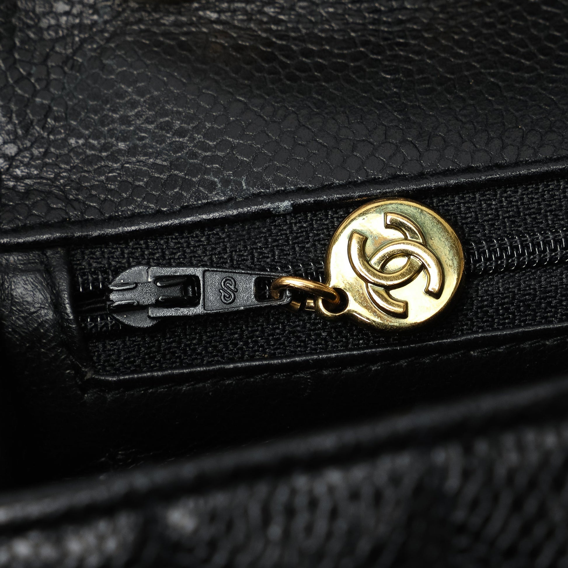 This shoulder Bag features a caviar leather body, leather woven chain shoulder straps, a front flap with double Cs and twist lock closure, an exterior back slip pocket, and interior zip and slip pockets.