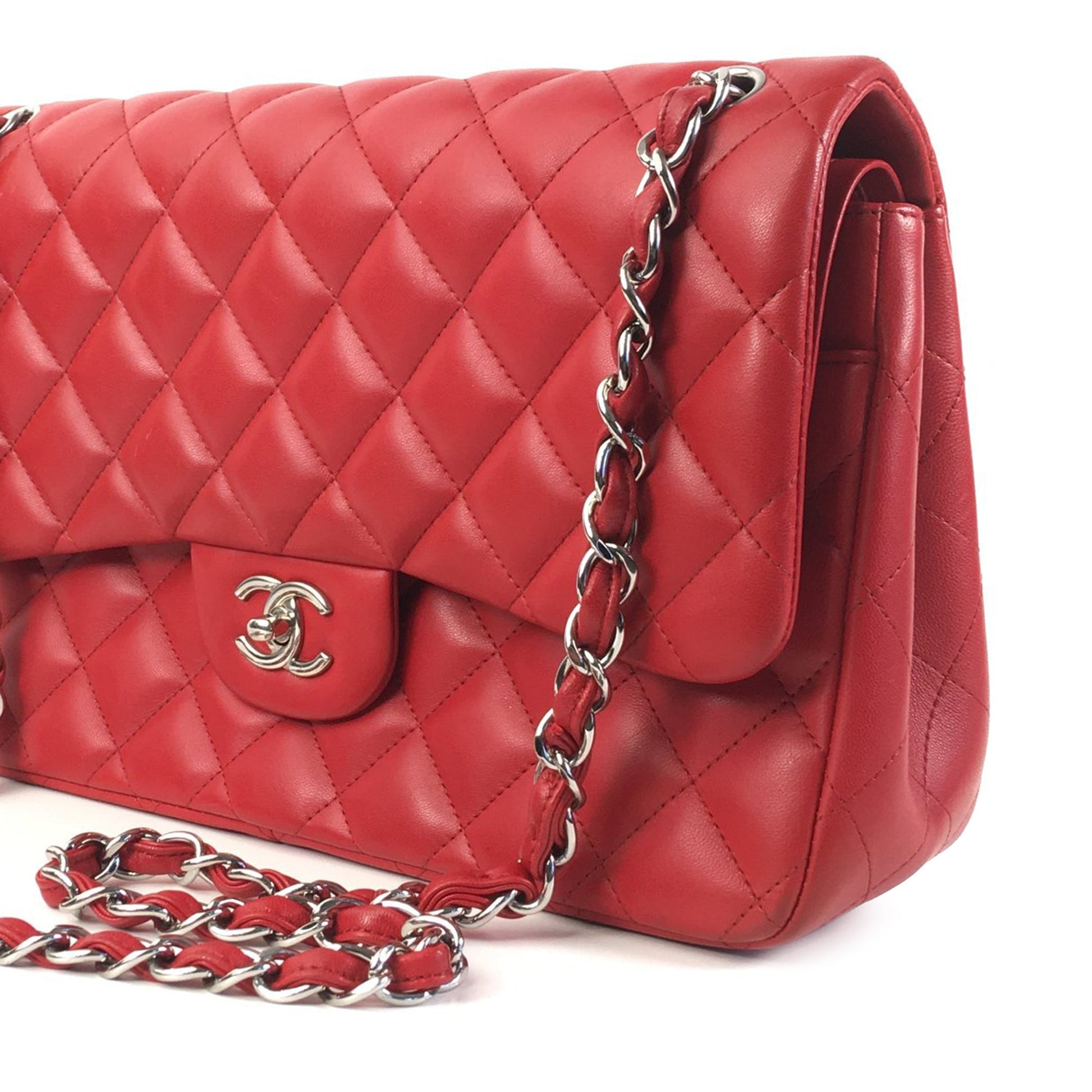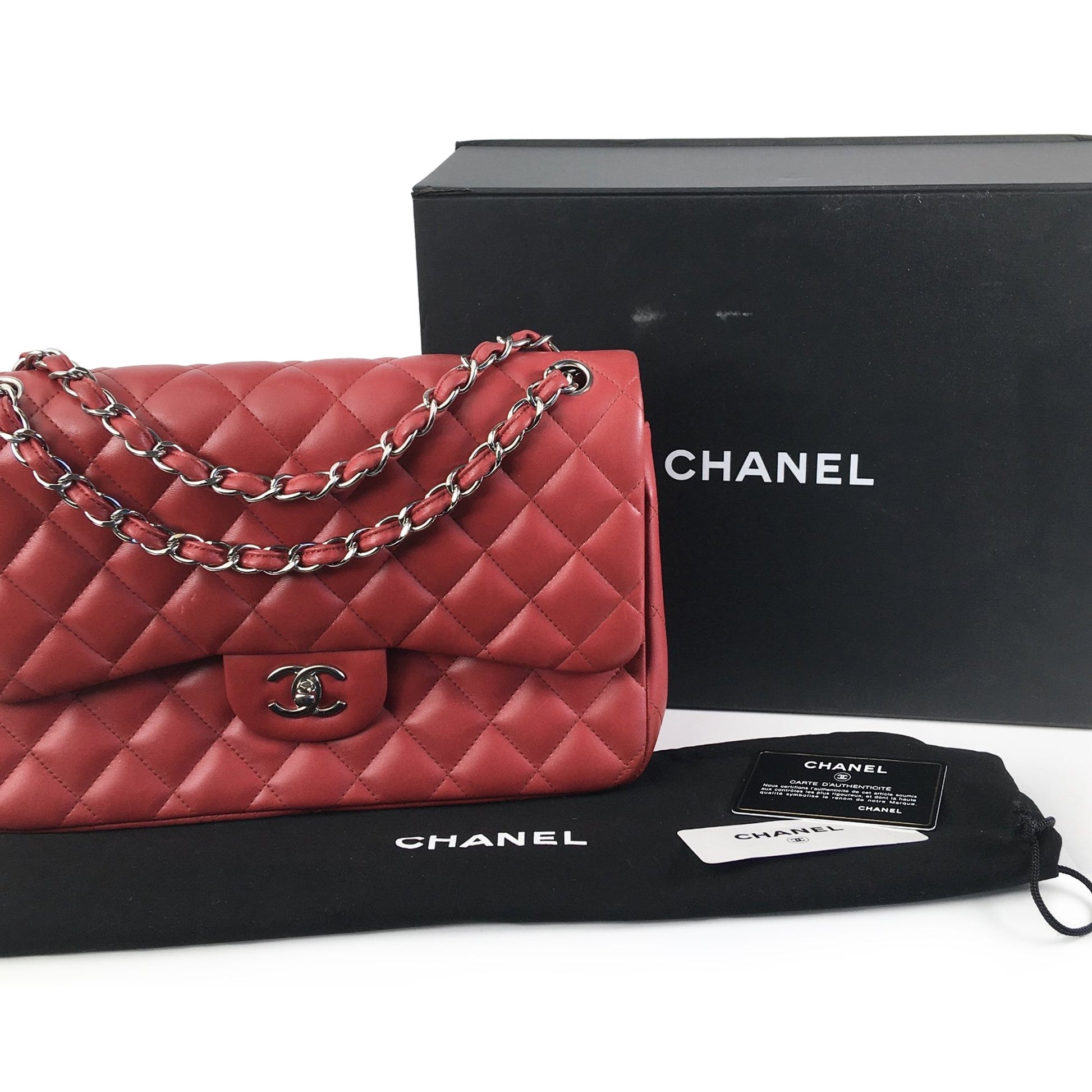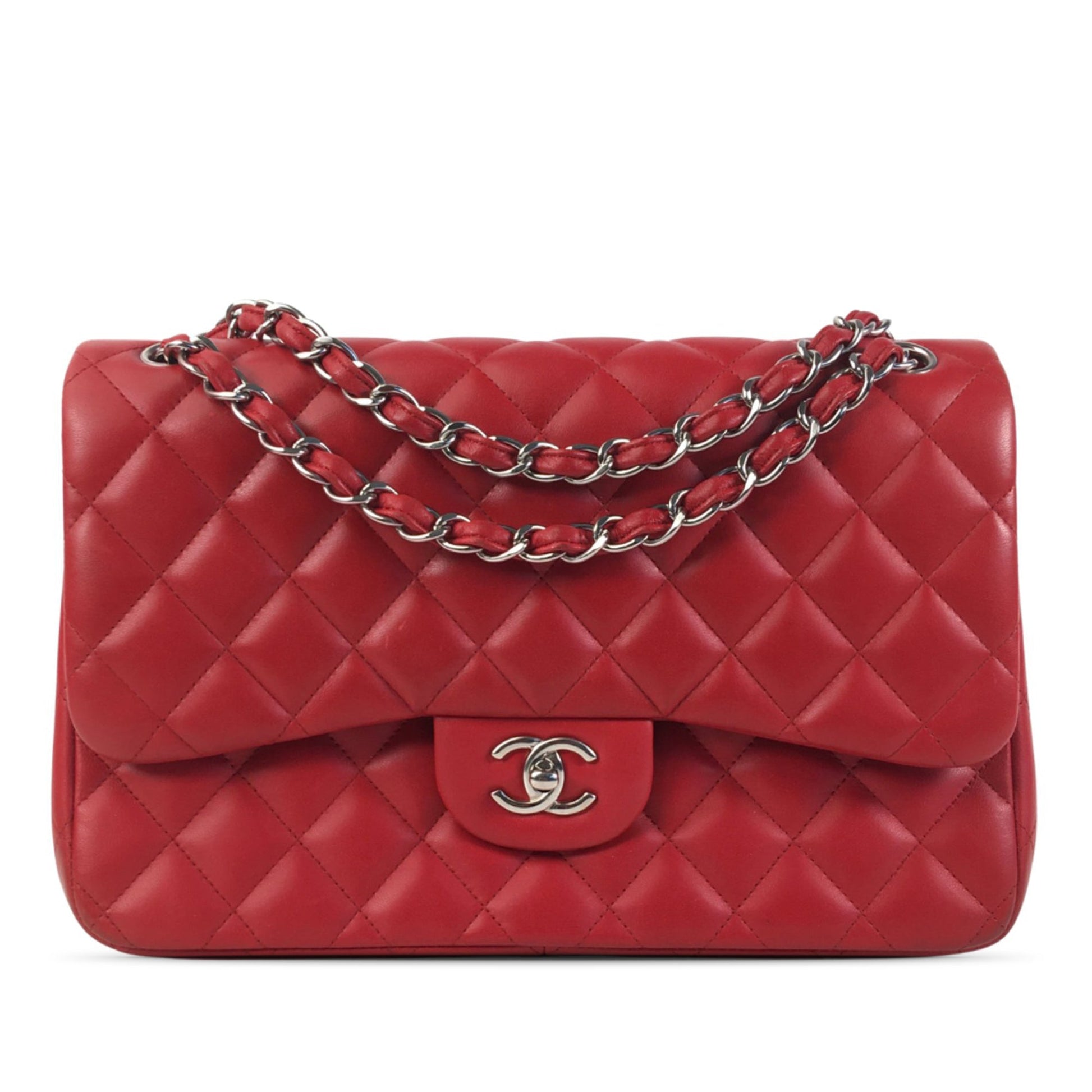 This shoulder Bag features a quilted lambskin leather body, leather-woven chain straps, double front flaps with CC turnlock closure, an exterior back slip pocket, and interior zip and slip pockets. Comes with ity card, box and dust Bag.