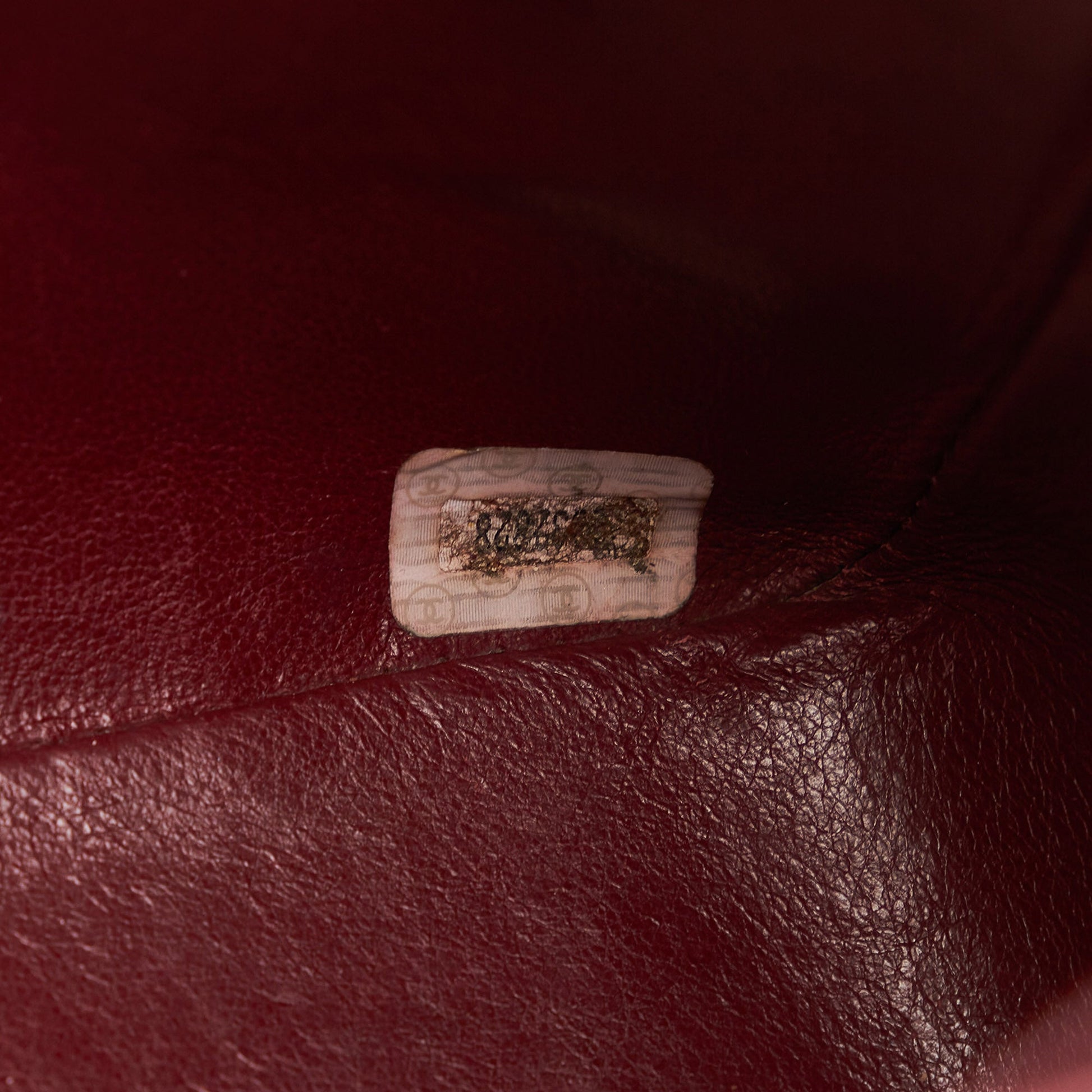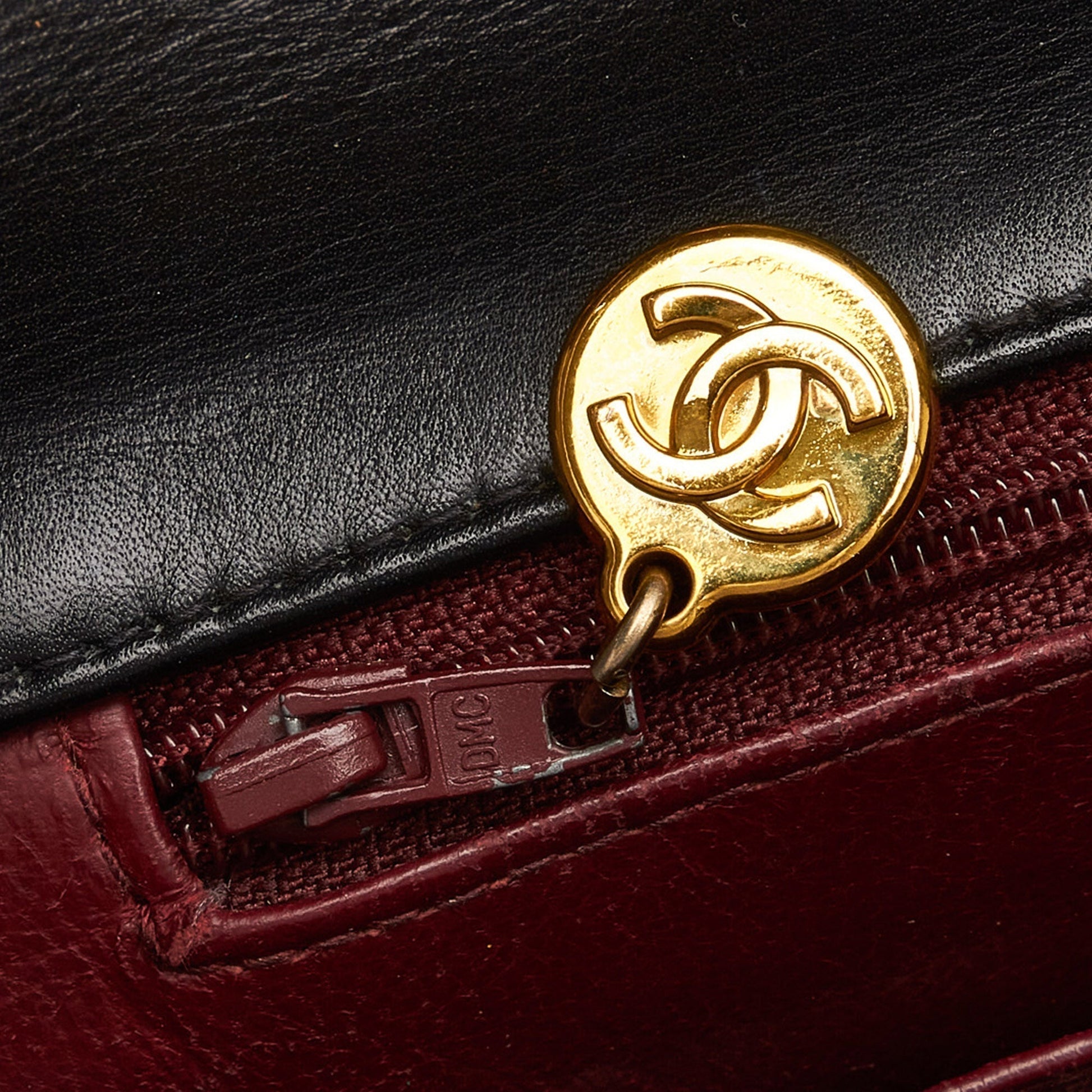 This shoulder Bag features a quilted lambskin body, an exterior back slip pocket, leather woven chain straps, a front flap with interlocking Cs and a twist lock closure, and interior zip and slip pockets.